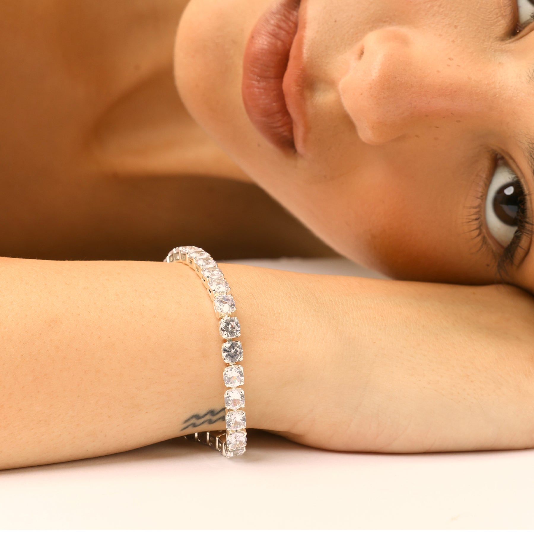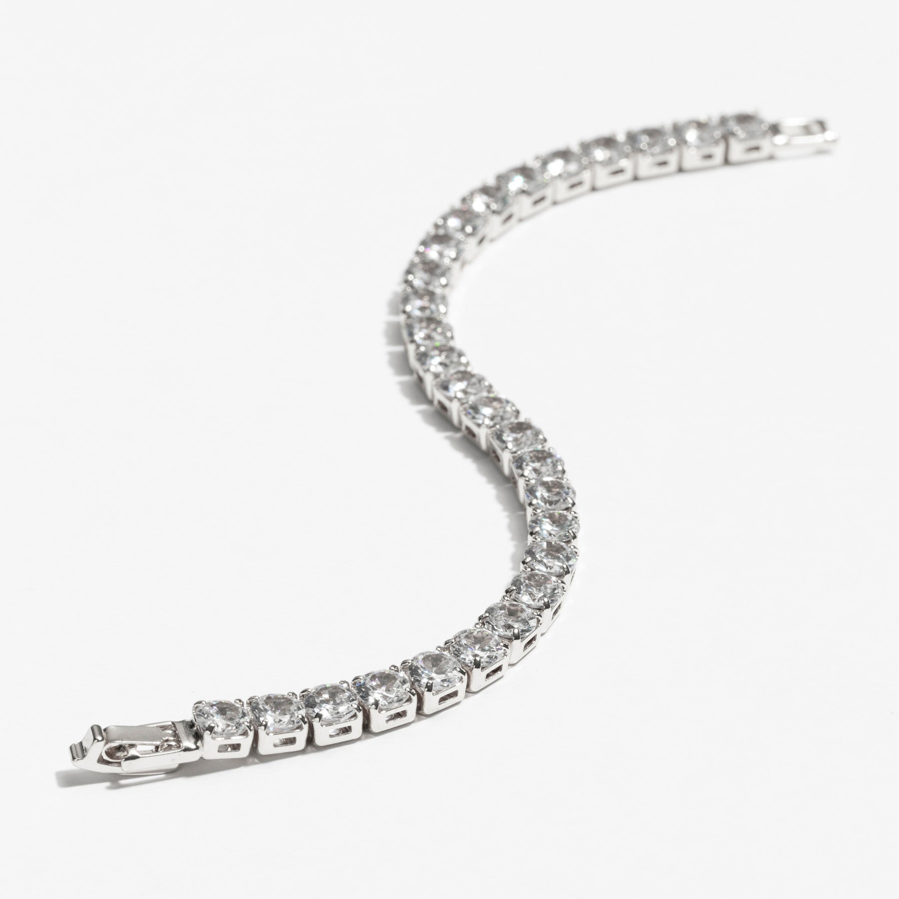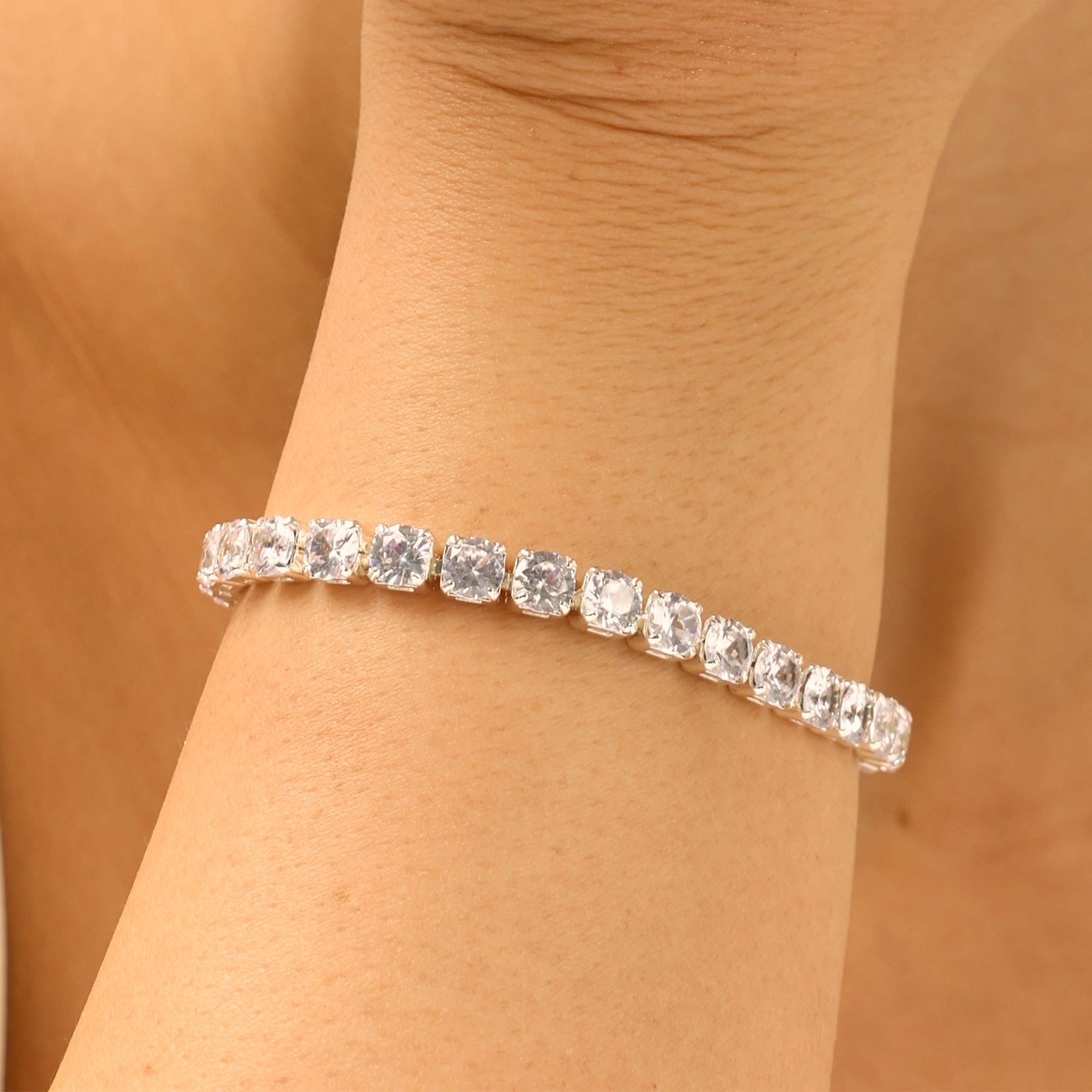 צמיד טניס משובץ אבני זירקון נוצצות, בעובי 5 מ״מ למראה עשיר ומרשים. תכשיט סטייטמנט שמשדר יוקרה ואלגנטיות שקטה. הצמיד עשוי בעבודת יד ומצופה כסף טהור.