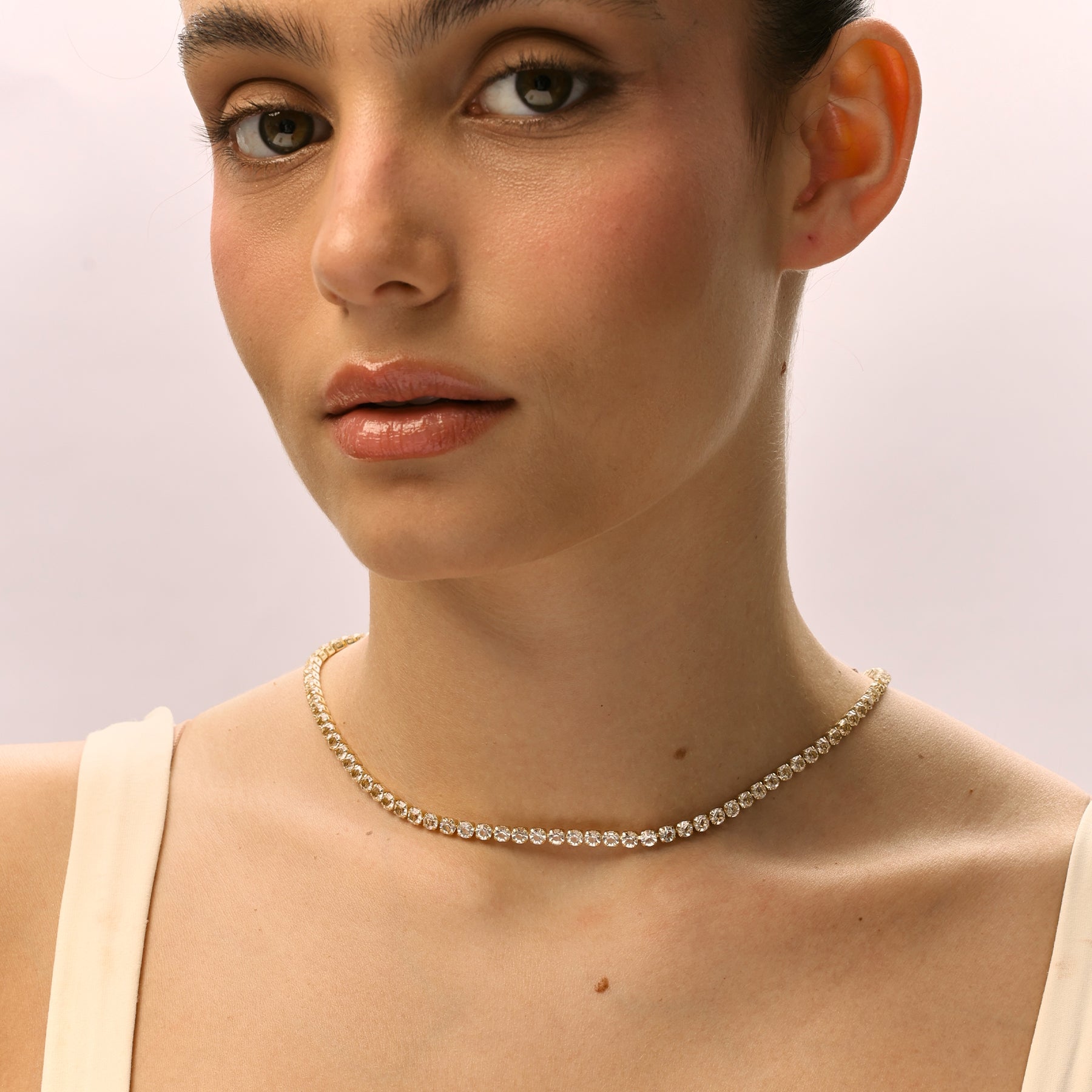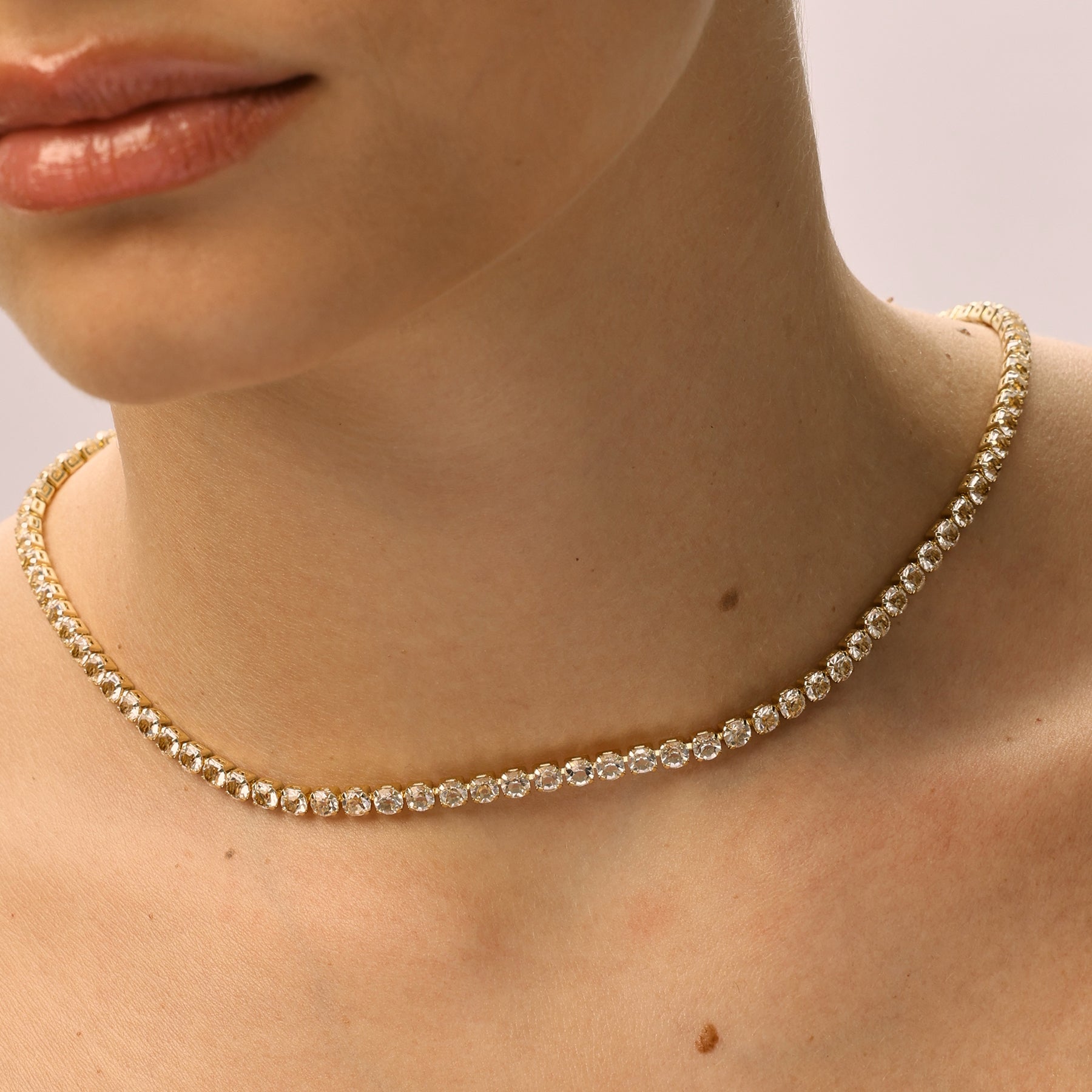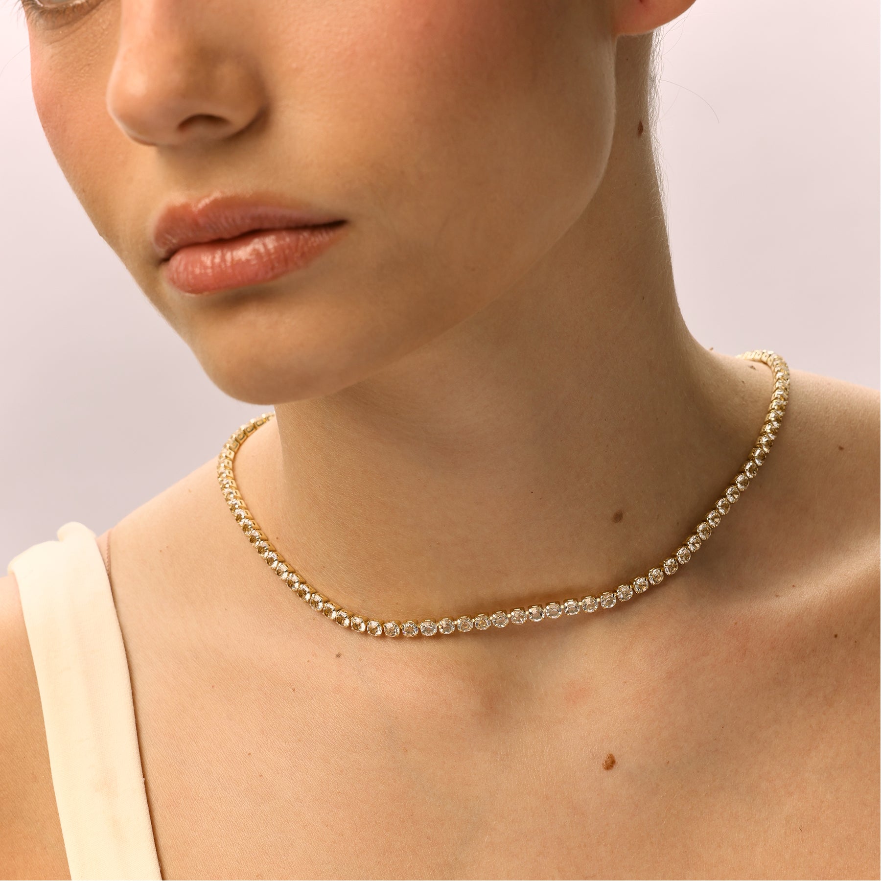 שרשרת טניס משובצת אבני זירקון נוצצות, בעובי 4 מ״מ לאיזון מושלם בין עדינות לנוכחות. פריט על־זמני שמוסיף ברק יוקרתי לכל לוק. השרשרת עשויה בעבודת יד ומצופה זהב 14K.