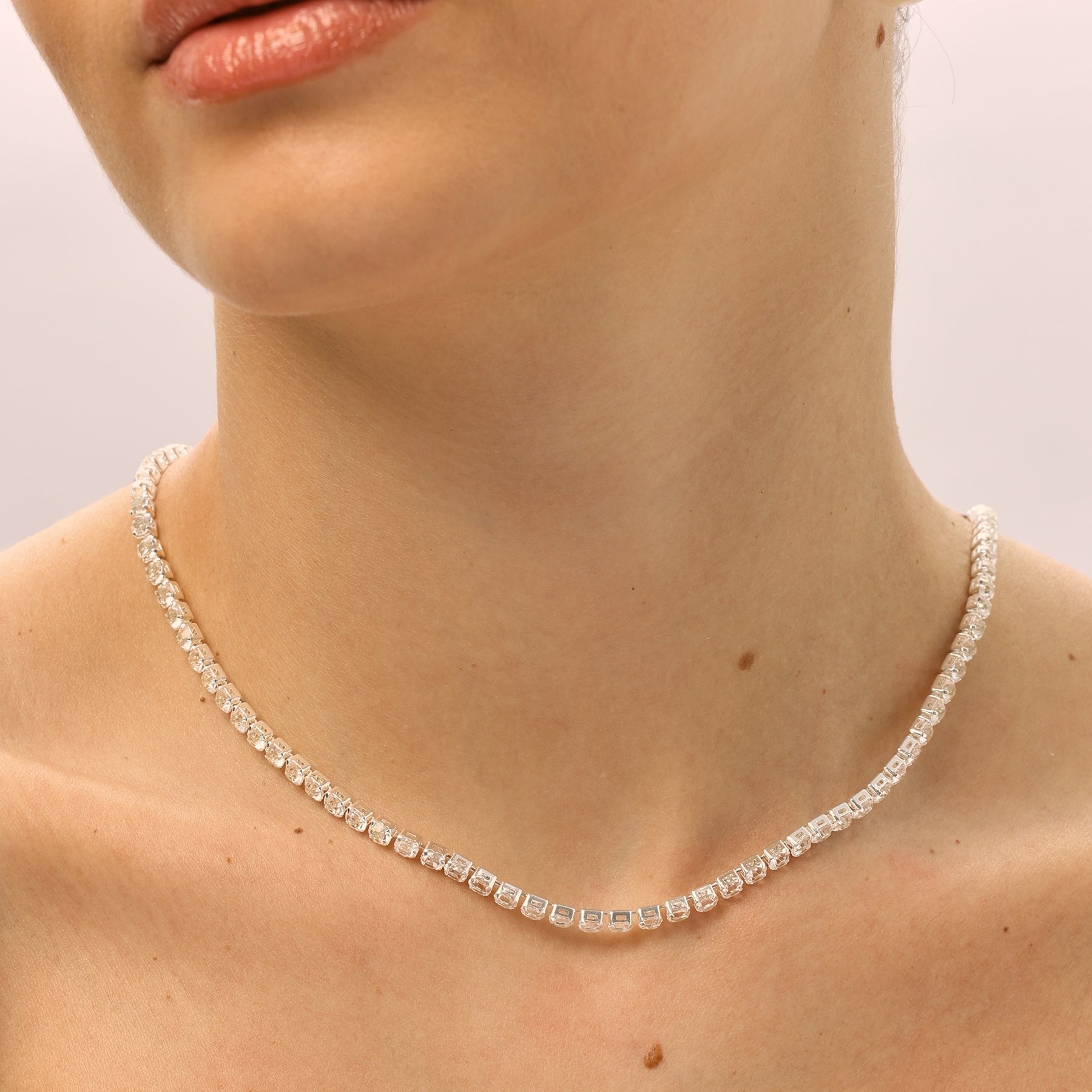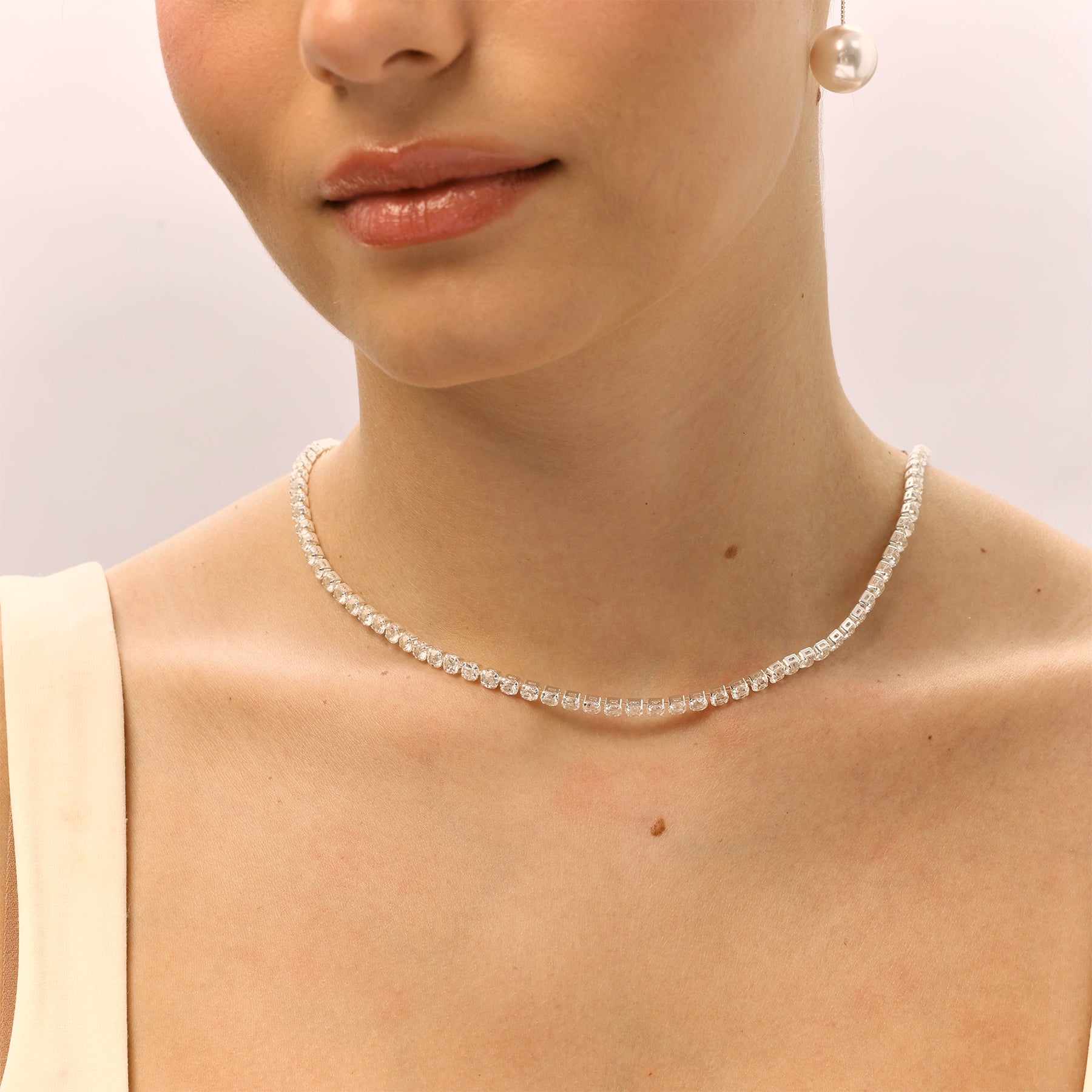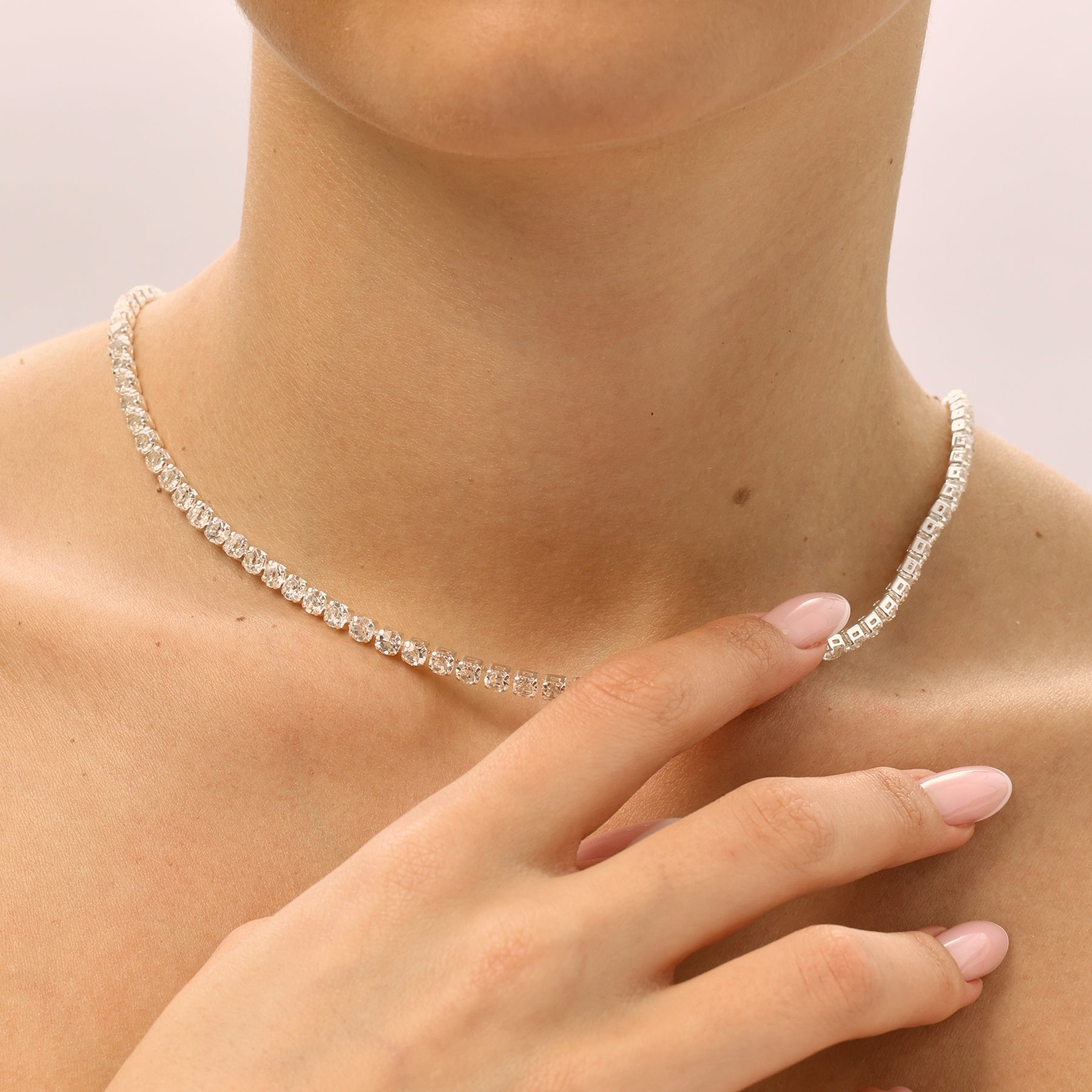 שרשרת טניס משובצת אבני זירקון נוצצות, בעובי 4 מ״מ לאיזון מושלם בין עדינות לנוכחות. פריט על־זמני שמוסיף ברק יוקרתי לכל לוק. השרשרת עשויה בעבודת יד ומצופה כסף טהור.