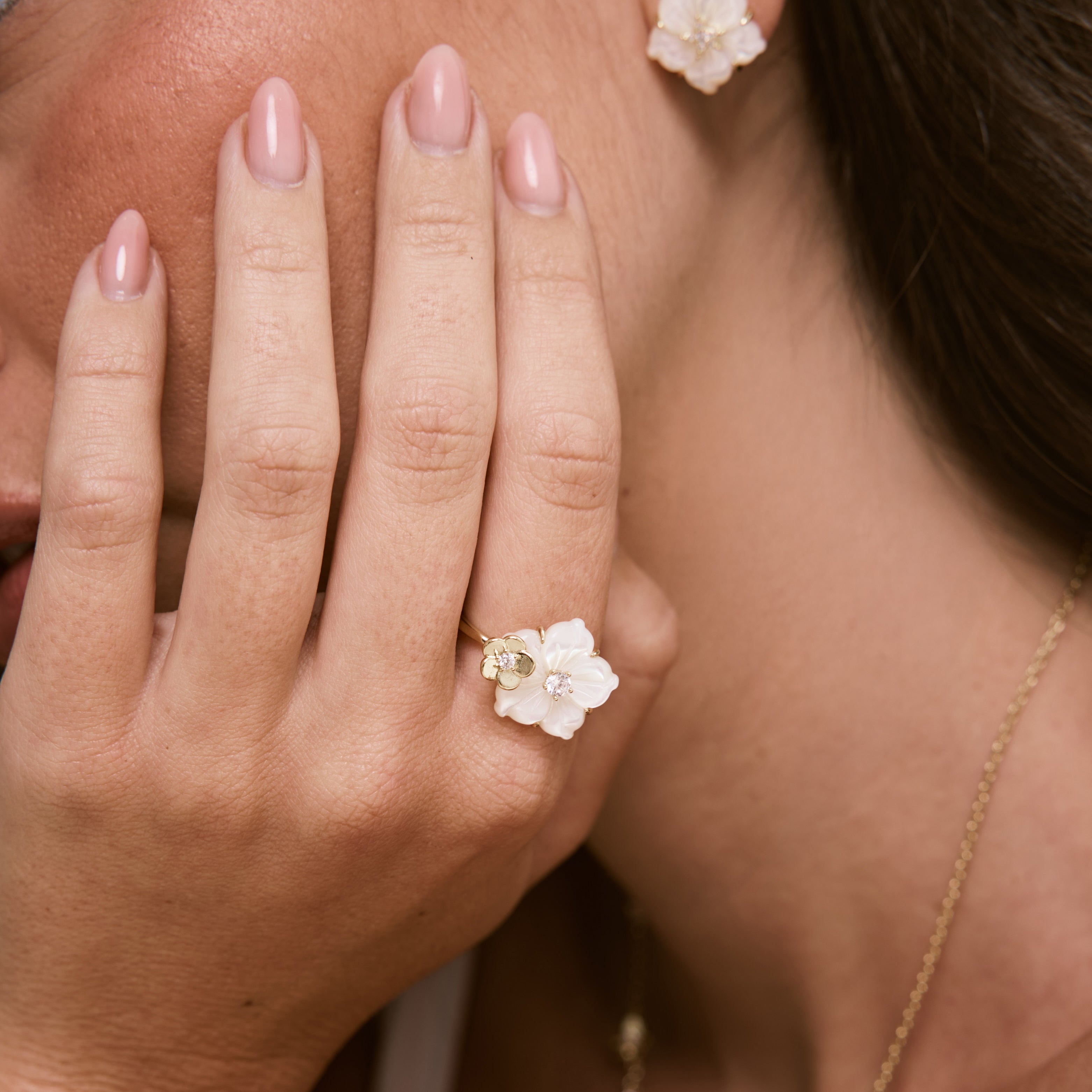 טבעת פרח מתכווננת עדינה, מעוצבת מאם הפנינה ומשובצת בזירקונים. הטבעת עשויה בעבודת יד ומצופה בזהב 14K.