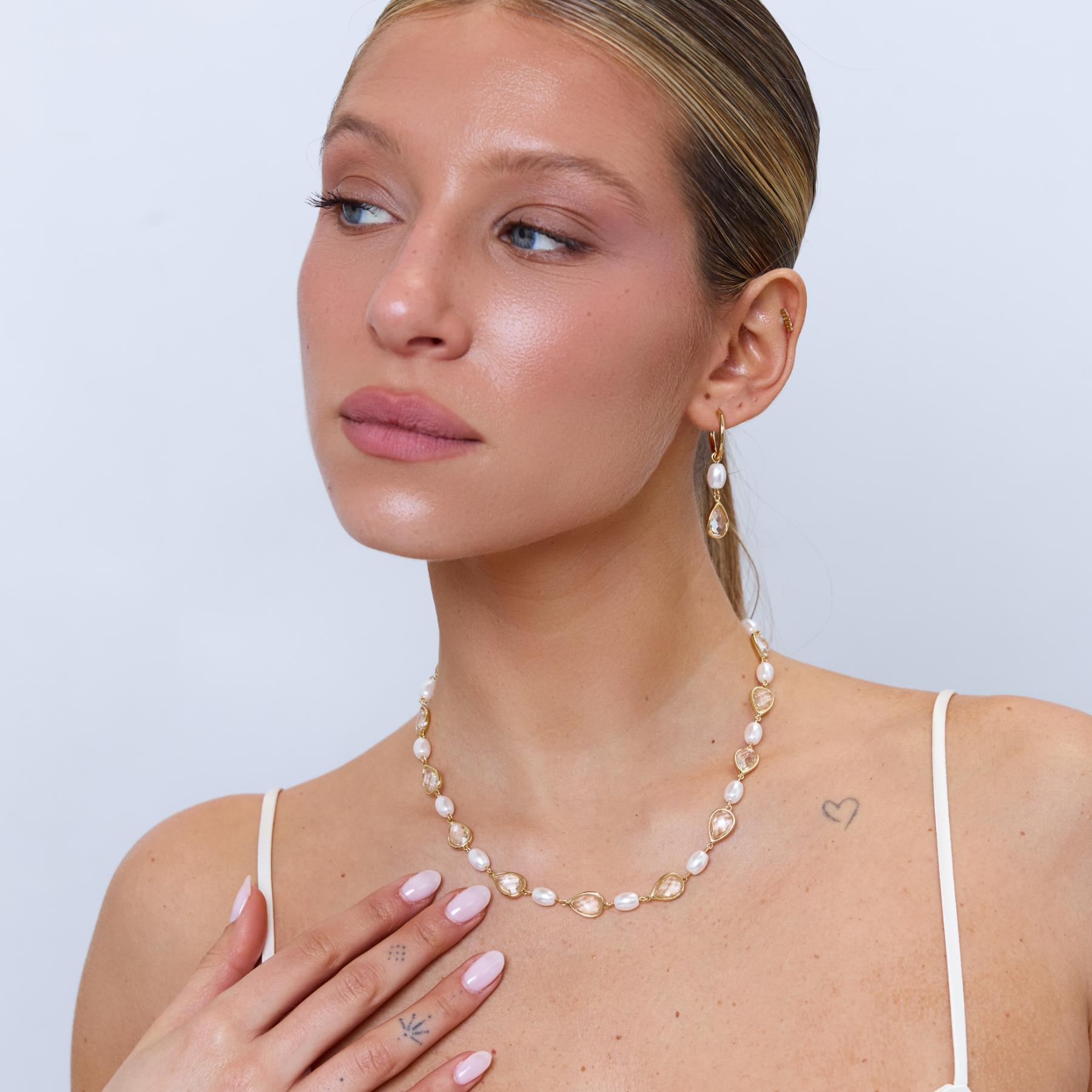 עגילי חישוק עם חרוזי פנינה וטיפות קריסטלים משובצות, בעיצוב אלגנטי ויוקרתי. העגילים עשויים בעבודת יד ומצופים בזהב 14K.
