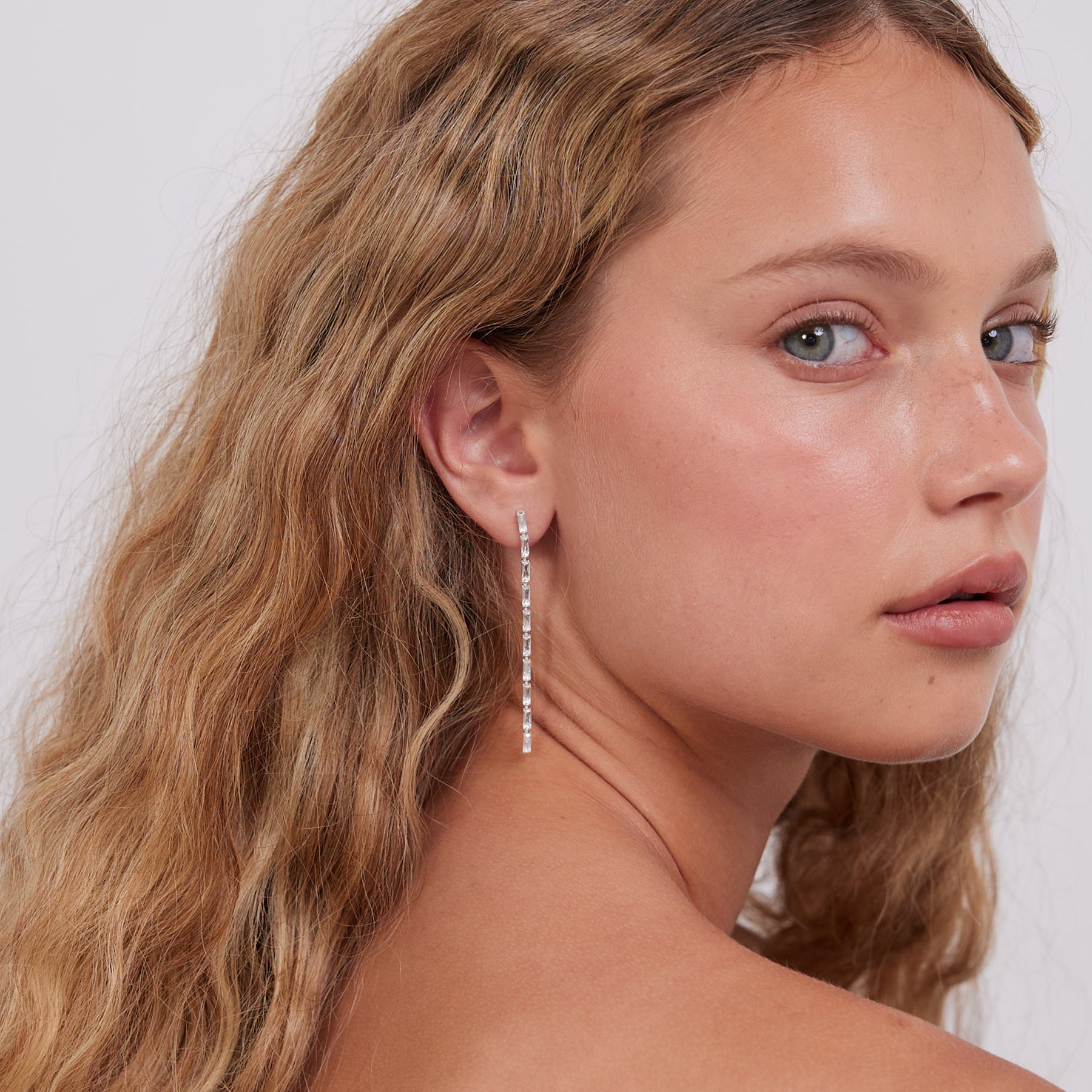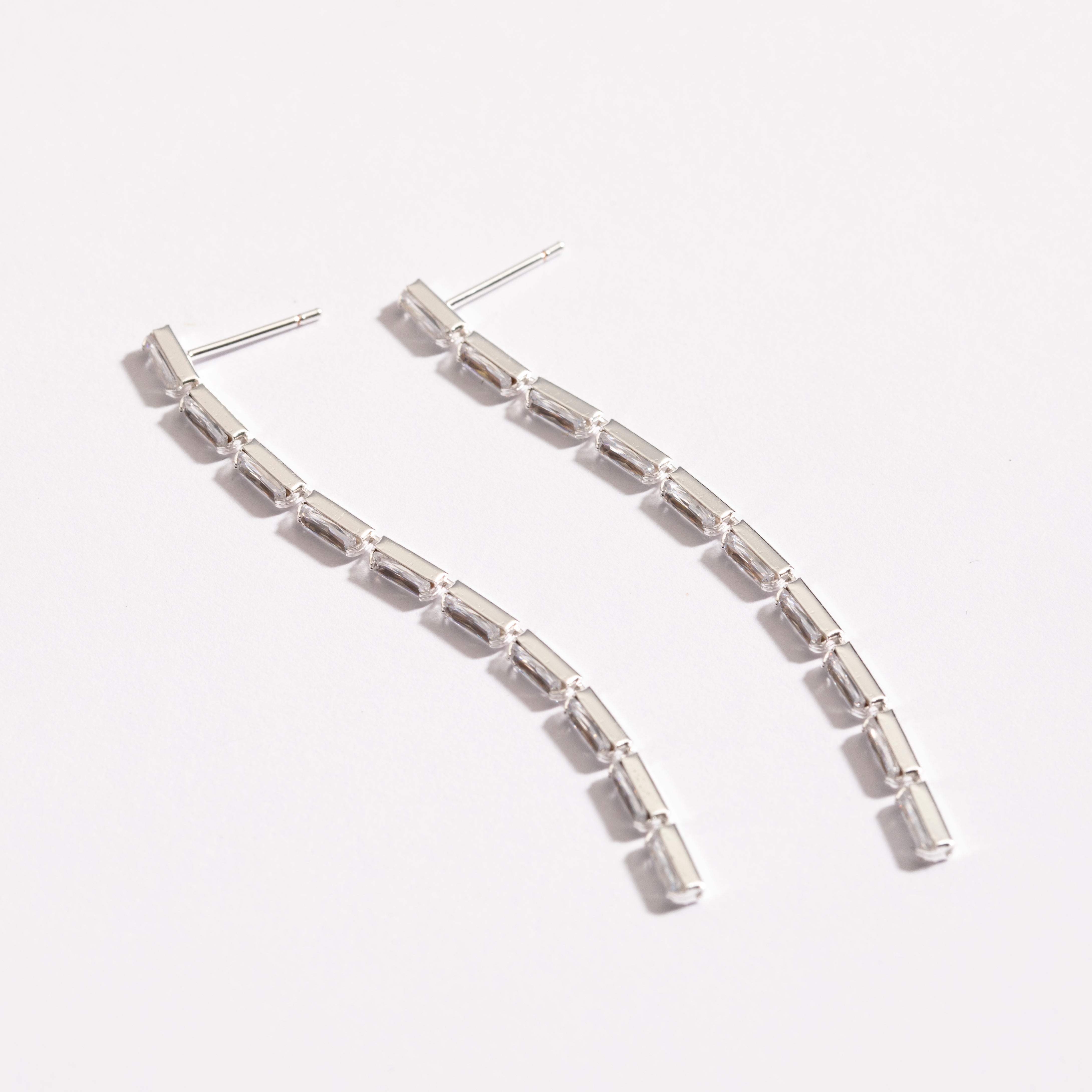עגילים ארוכים ומעודנים, משובצים אבני זירקון יוקרתיות בצורת בגט ללוק מרשים במיוחד. העגילים מעוצבים בעבודת יד ישראלית ומצופים זהב 14K.