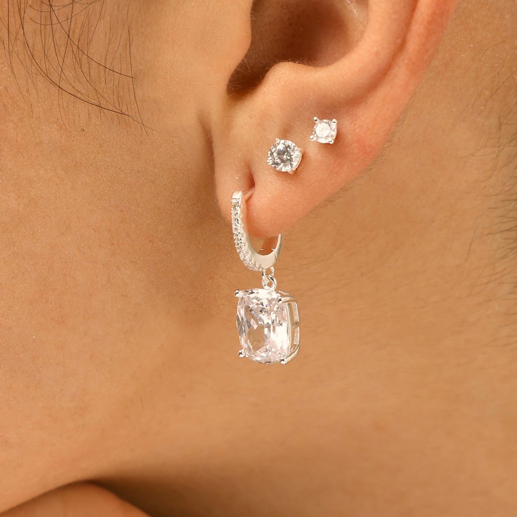 עגילי חישוק עדינים משובצים זירקונים קטנים עם אבן זירקון "קושן" מרובעת. תנועה קלילה וברק אלגנטי יוצרים מראה יוקרתי, נשי ועל־זמני. העגילים עשויים בעבודת יד ומצופים כסף טהור.