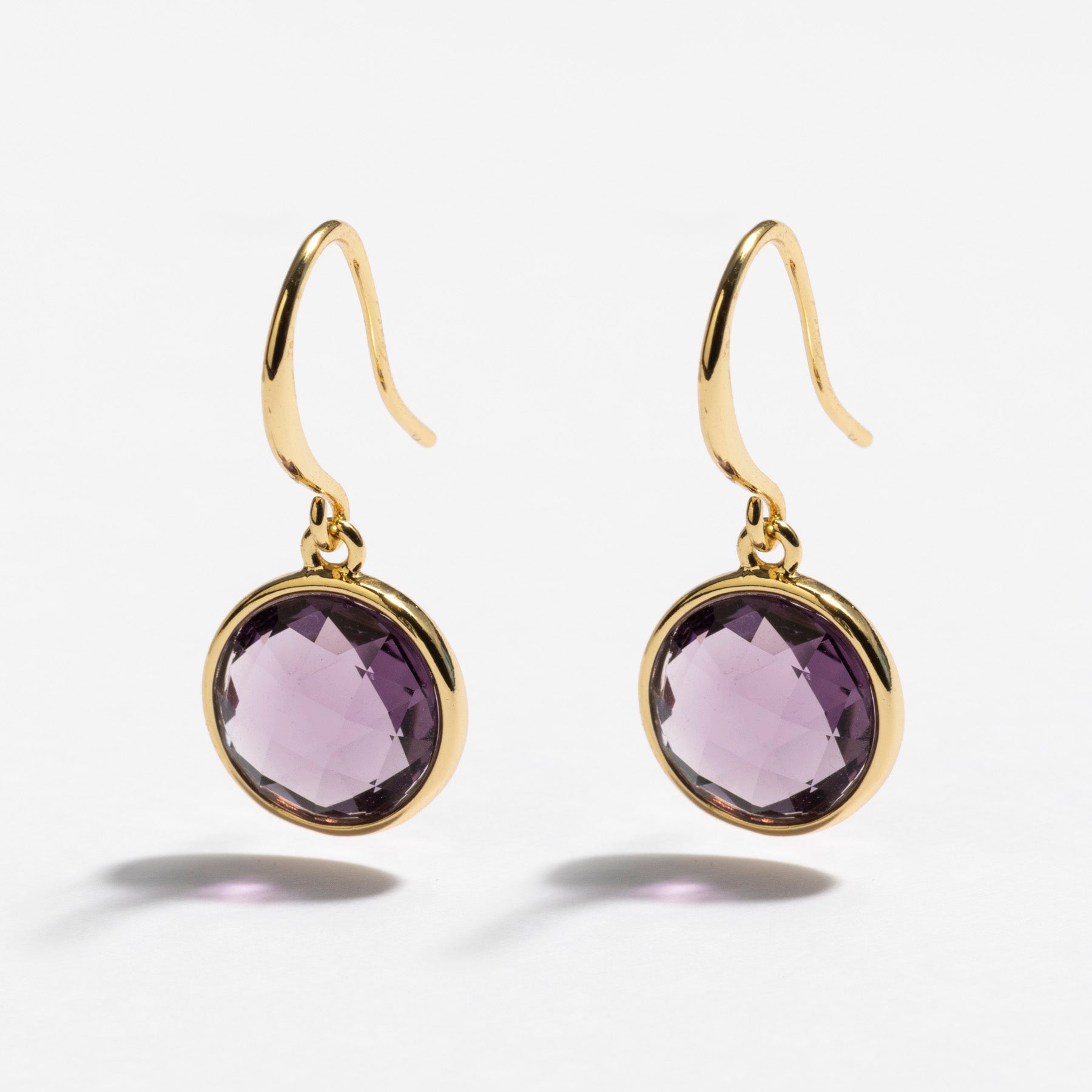 עגילים תלויים משובצים בקריסטלים סגולים, בעיצוב מדויק ומחמיא. העגילים עשויים בעבודת יד ומצופים בזהב 14K.