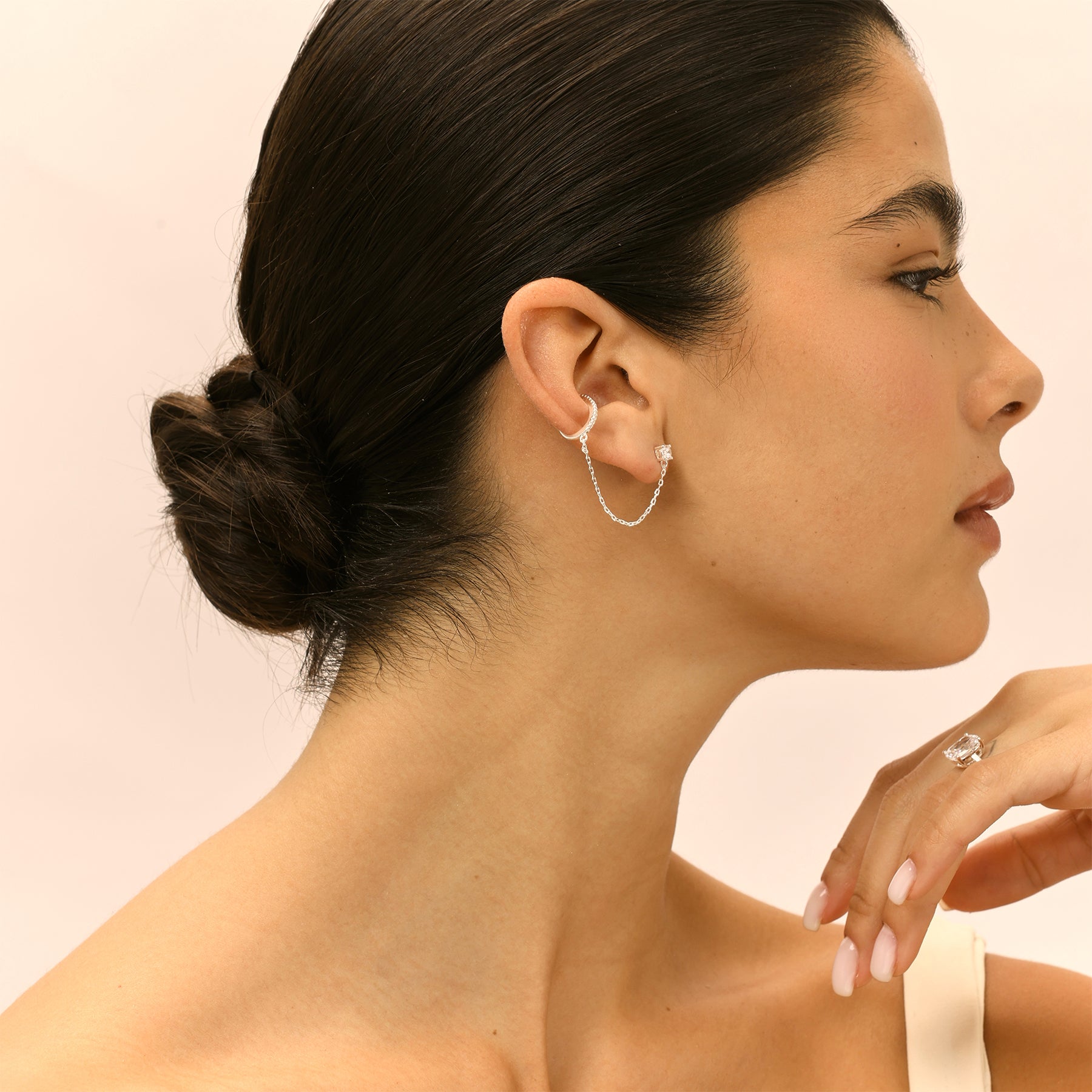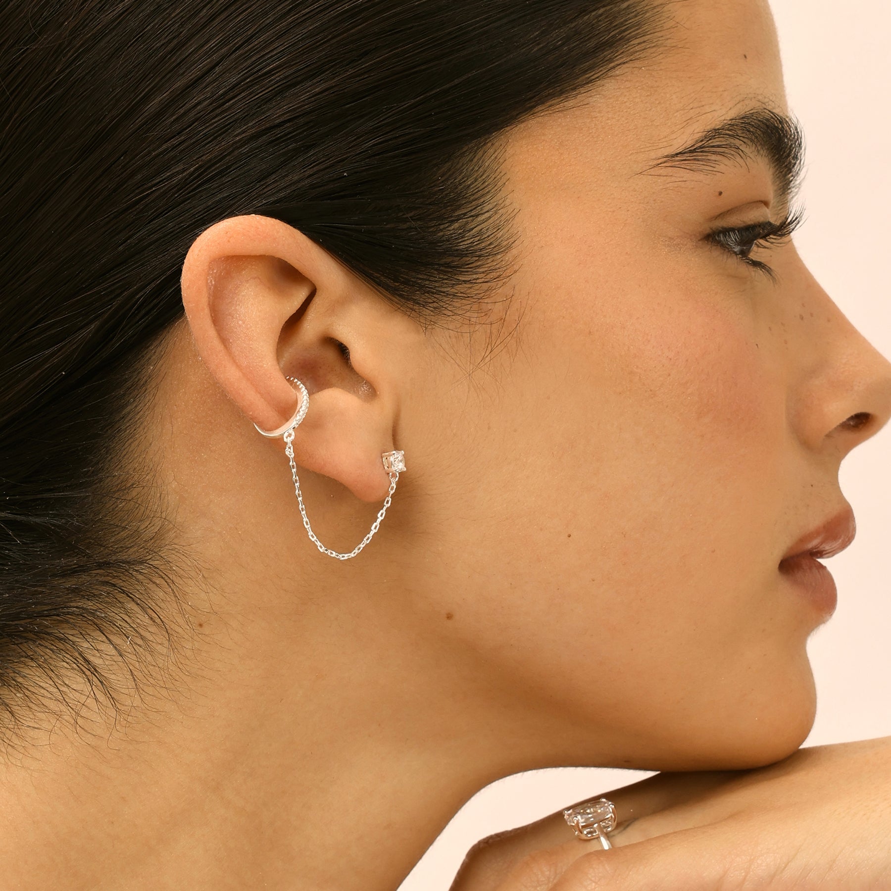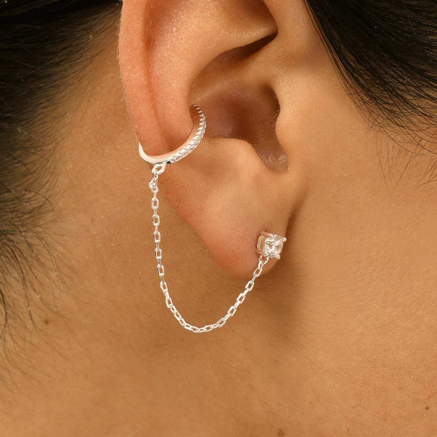 עגיל בודד המשלב זירקון בצורת טיפה וחישוק משובץ ובניהם שרשרת. מתאים במיוחד לעיצוב האוזן. העגיל עשוי בעבודת יד ומצופה כסף טהור.