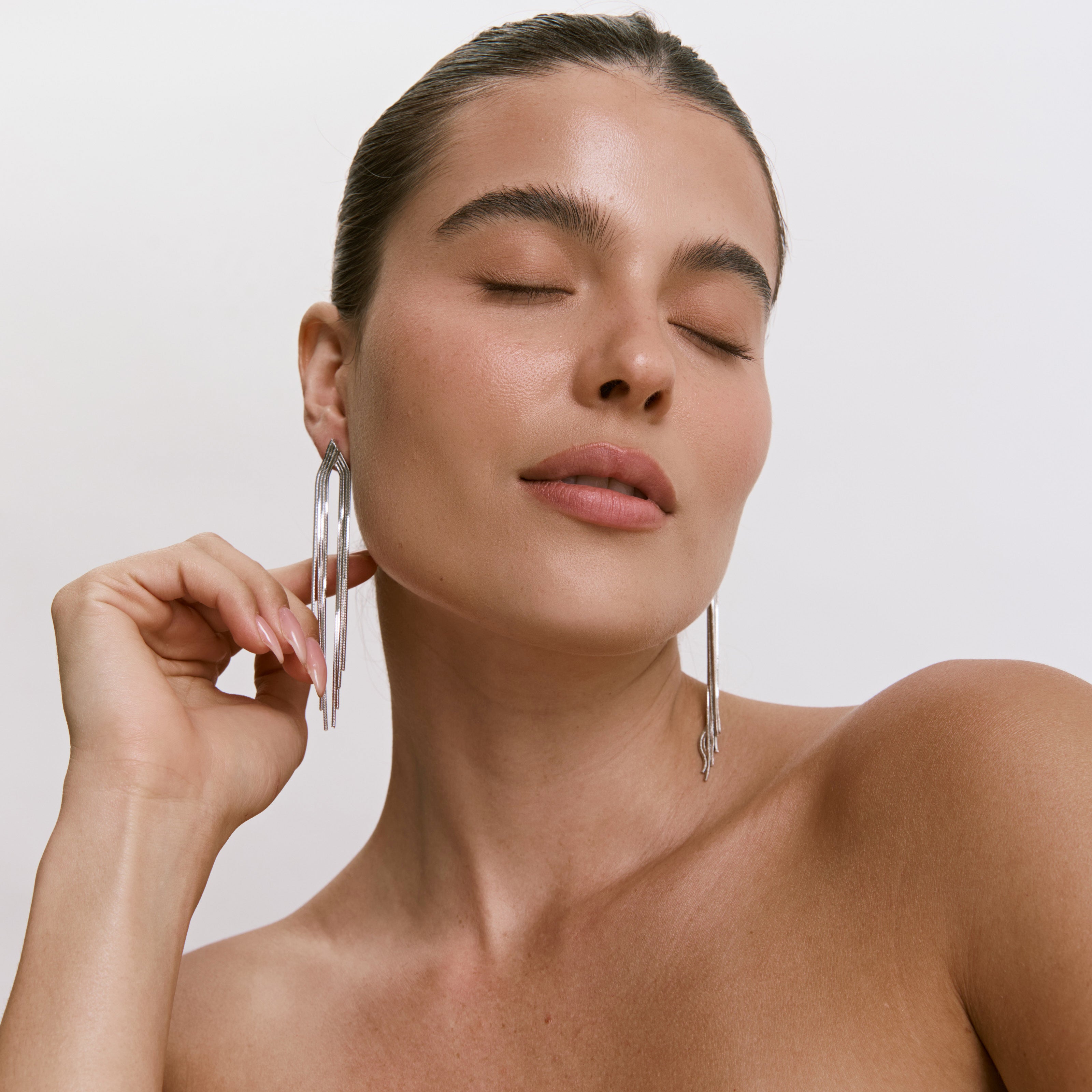 עגילים תלויים, ארוכים ומרשימים, בעיצוב קלאסי ויוקרתי. העגילים עשויים בעבודת יד ומצופים בכסף טהור.