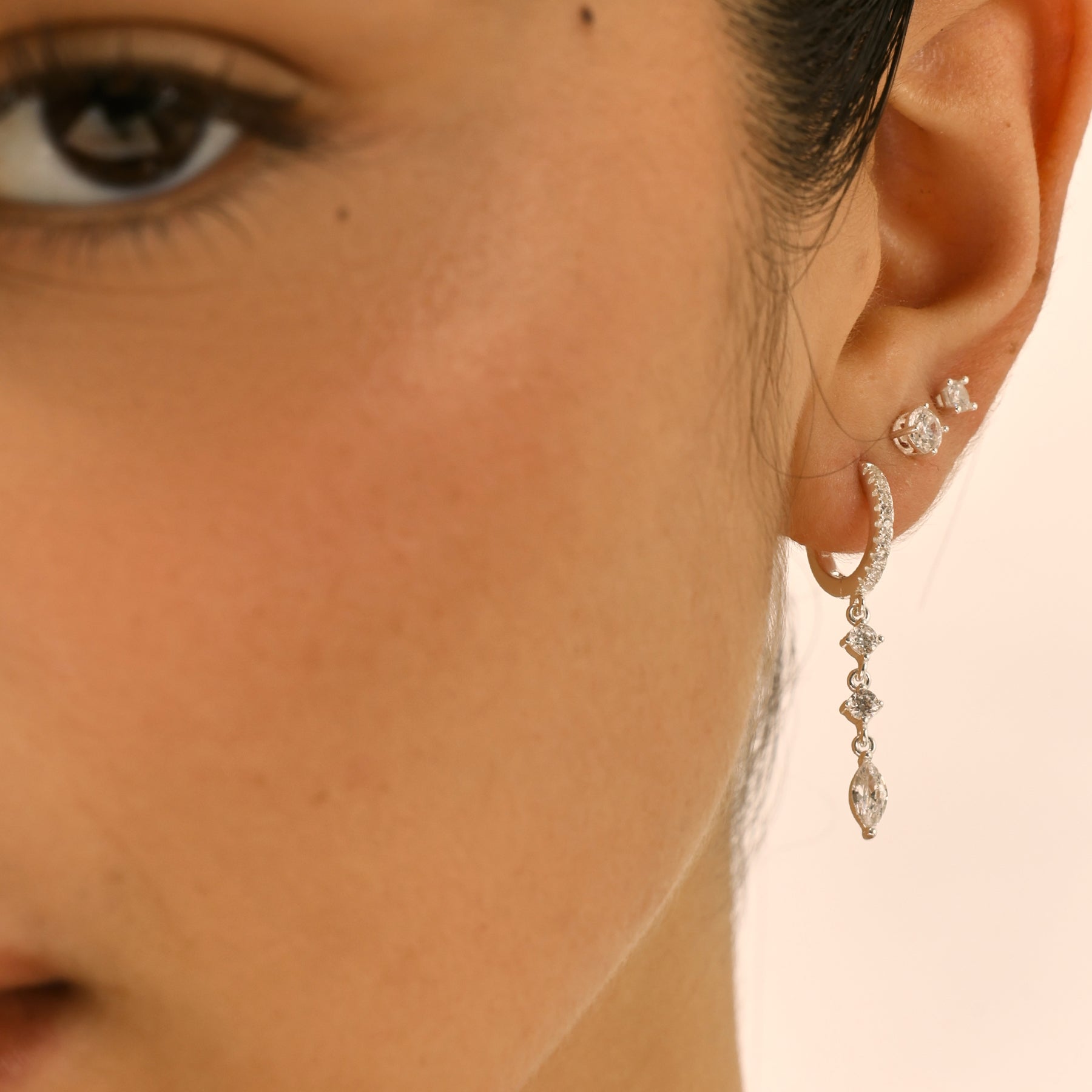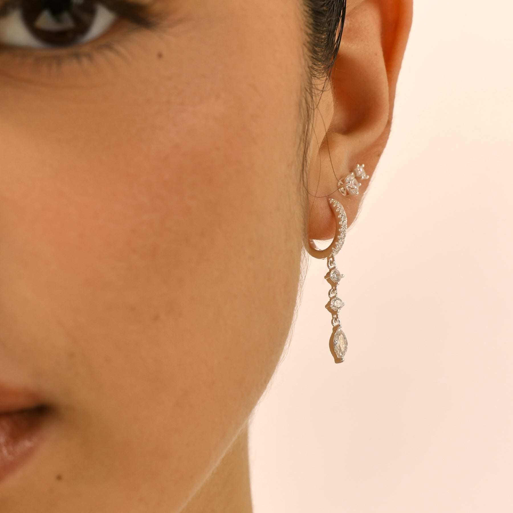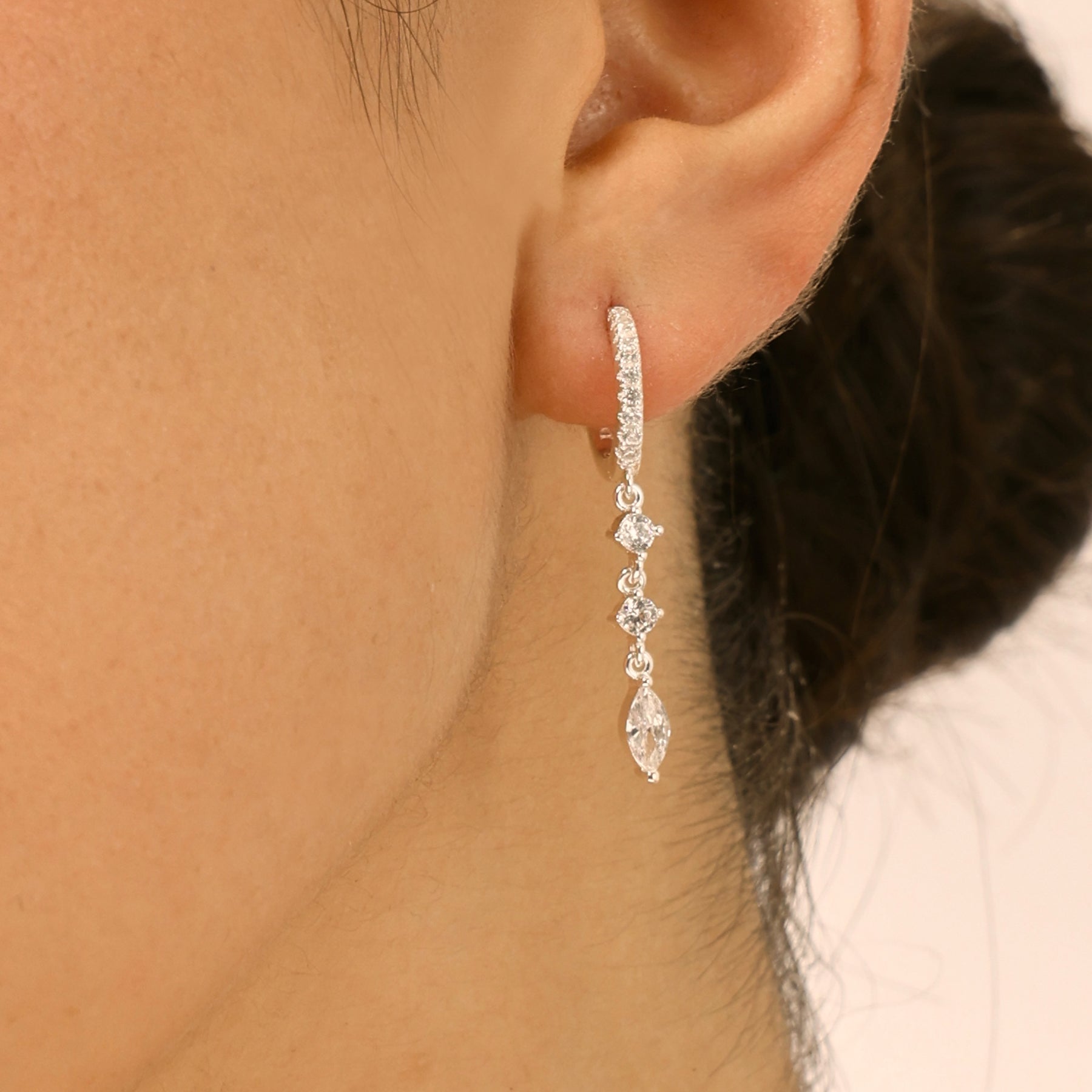 עגילי חישוק קטנים משובצים עם שלושה זירקונים תלויים. שילוב מושלם של אלגנטיות וסטייל, שמתאים במיוחד לעיצוב האוזן וליצירת מראה מוקפד ומלא שיק. העגילים עשויים בעבודת יד ומצופים כסף טהור.