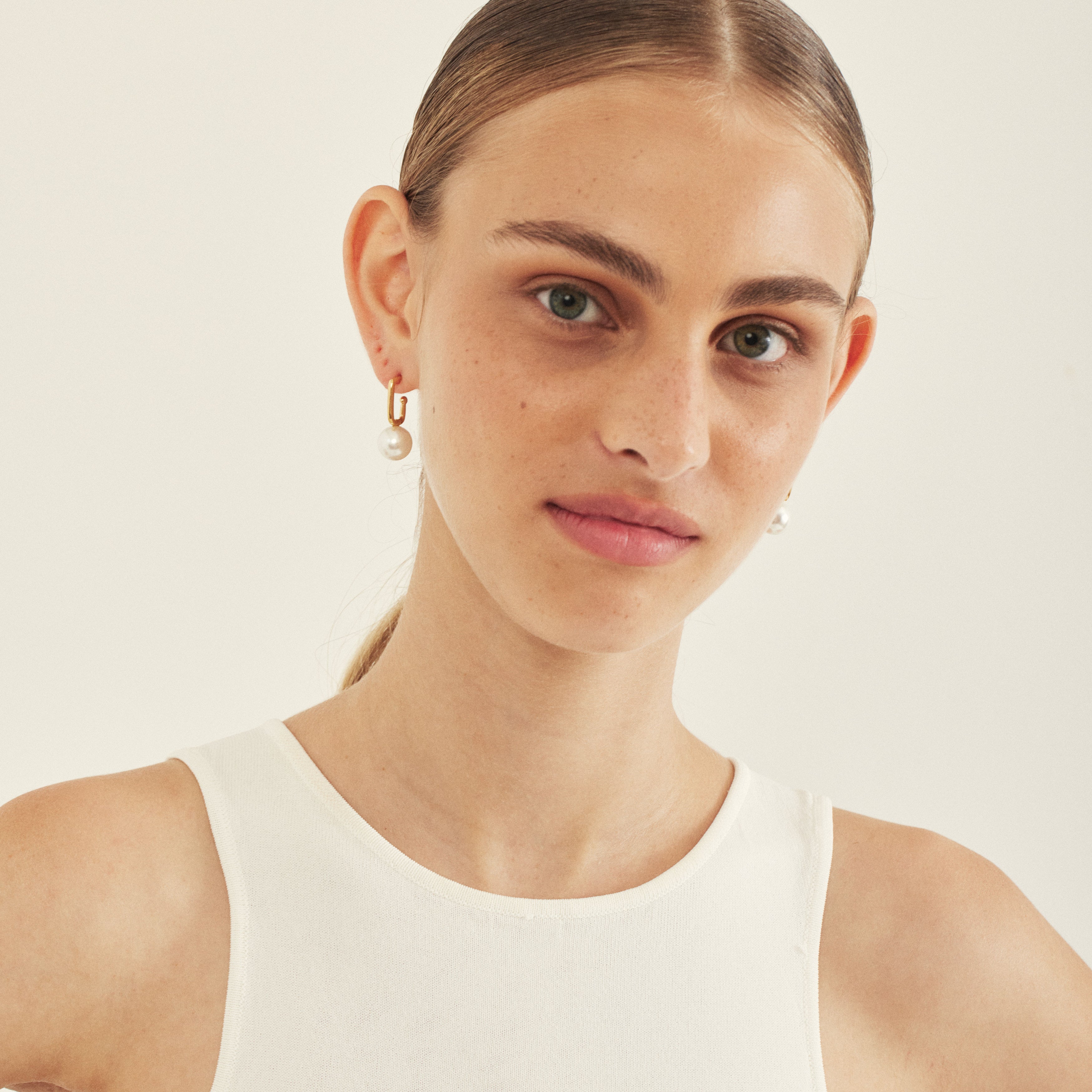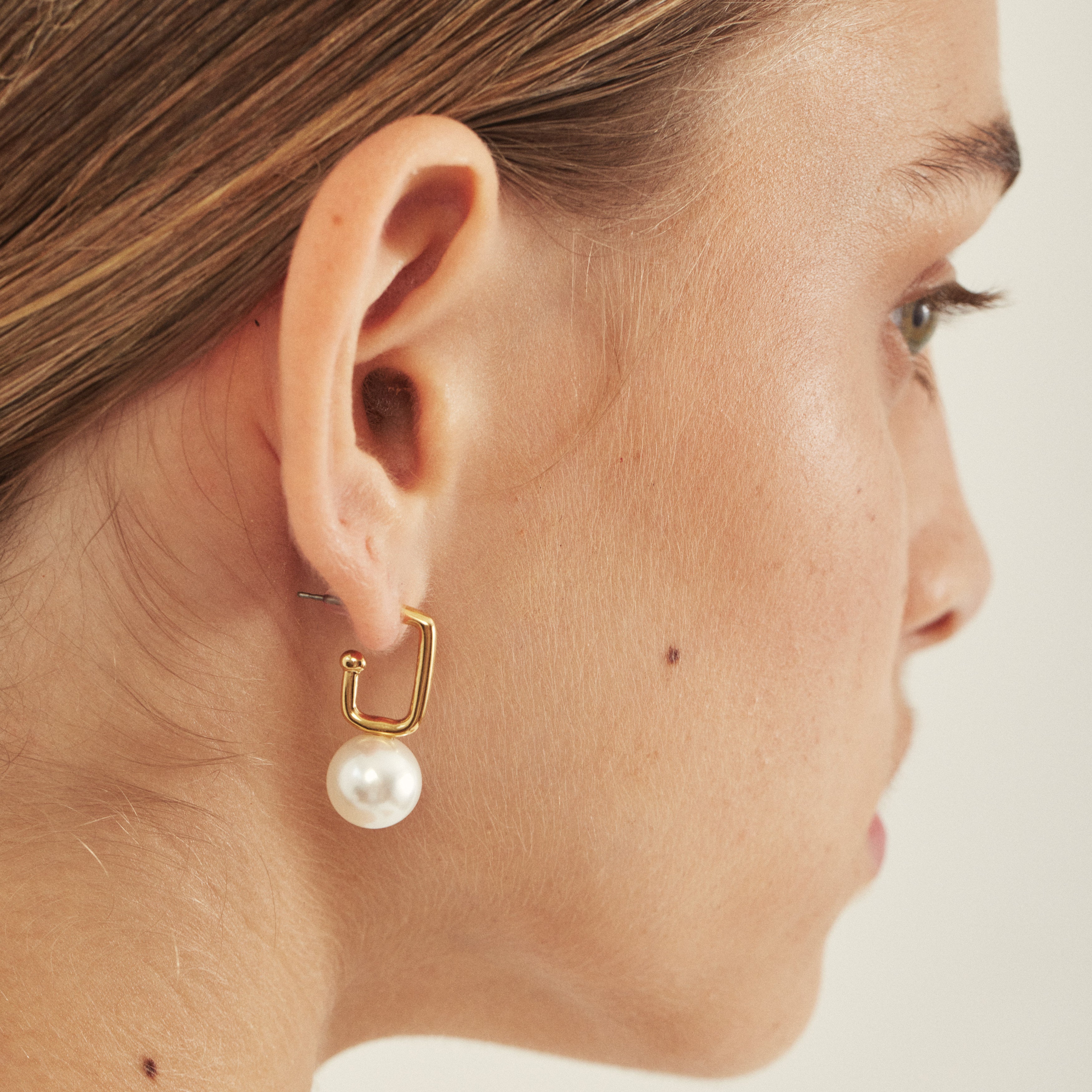 עגיל תלוי בעיצוב גאומטרי, מעוטר בפנינת מים מתוקים ומצופה זהב 24K.