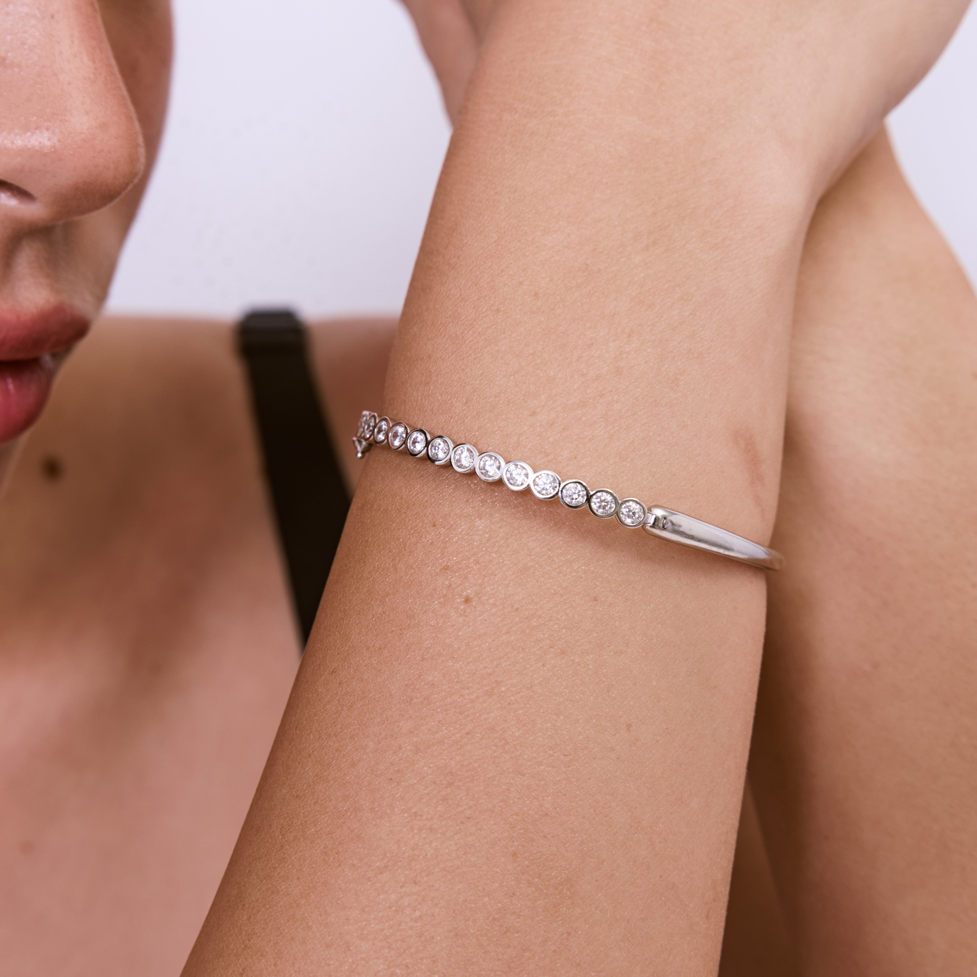 צמיד חצי טניס קשיח משובץ בזירקונים נוצצים, בעיצוב יוקרתי ונועז, ללוק בלתי נשכח. הצמיד עשוי בעבודת יד ומצופה בכסף טהור.