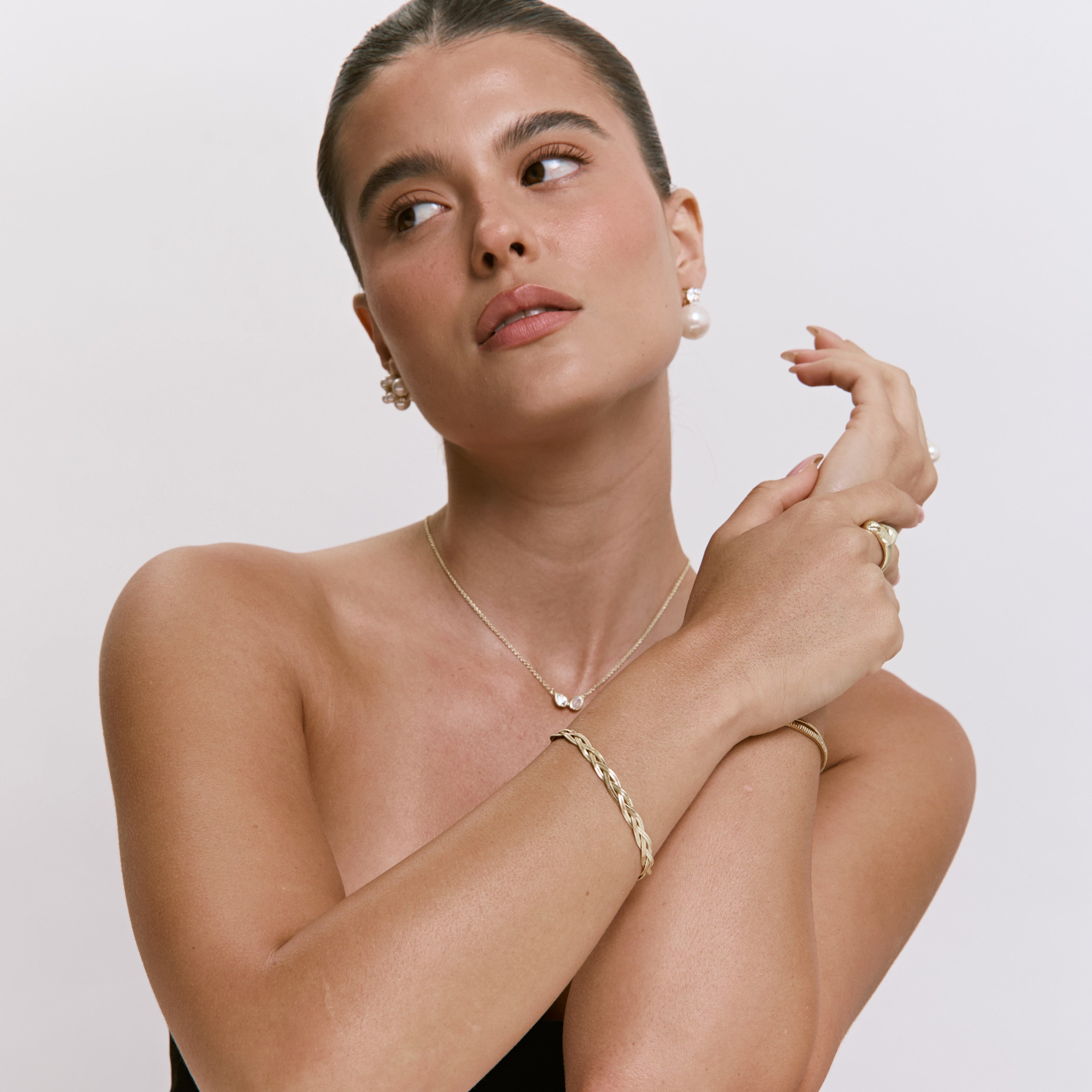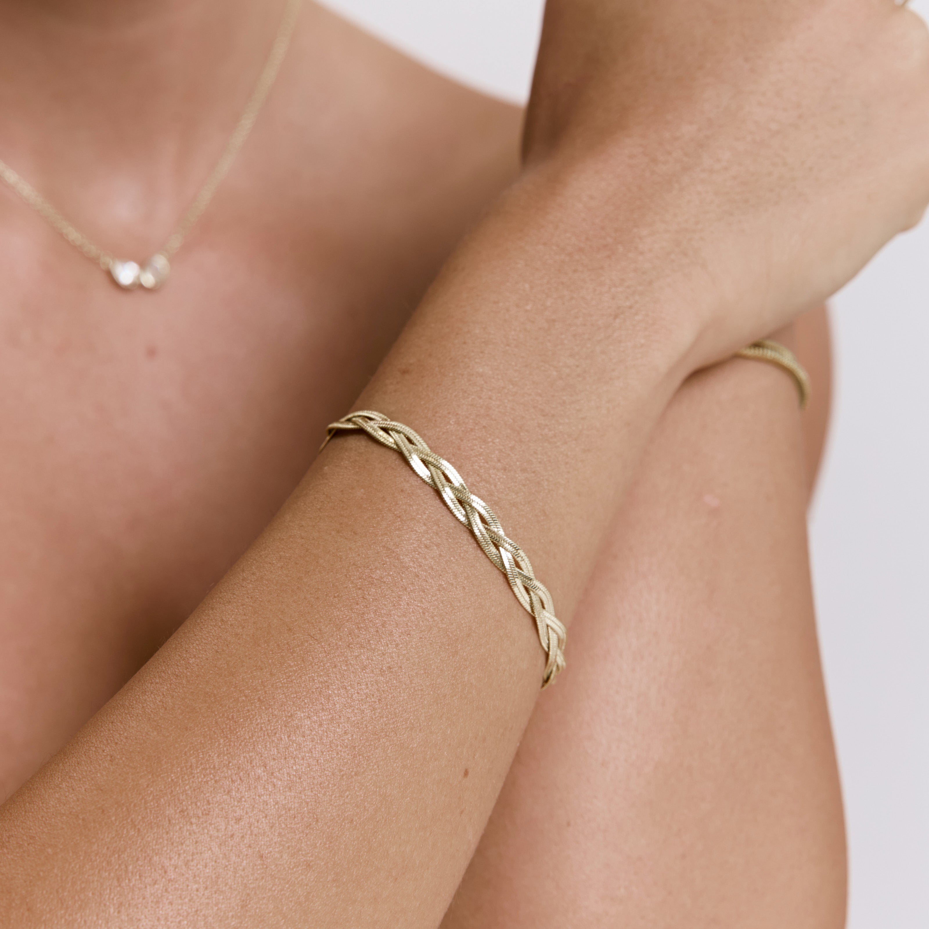 צמיד עשוי שרשרת נחש קלועה לצמה, בעיצוב נקי, מדויק ומלא סטייל. הצמיד עשוי בעבודת יד ומצופה בזהב 14K.