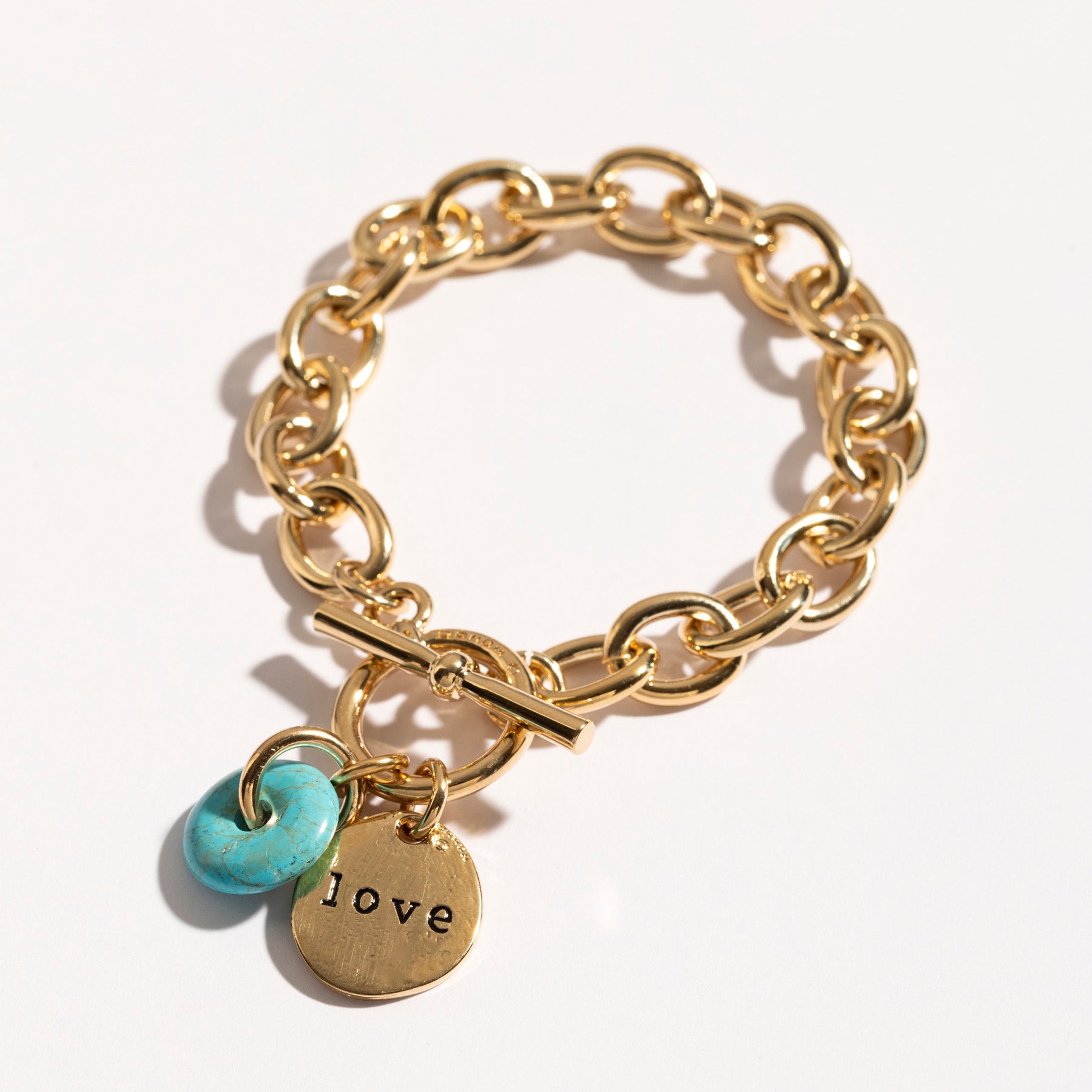 צמיד צ'אנקי, מצופה זהב 24 קראט, עשוי חוליות אובליות גדולות וסוגר טי, שעליו תליון עגול עם ציור לב והכיתוב "Love" מוטבע מאחור וכן גלגל טורקיז, שמעניק לו עוד טאצ' של צבעוניות וגם נחשב כצבע בעל סגולות לשמירה ולהגנה מפני עין הרע.