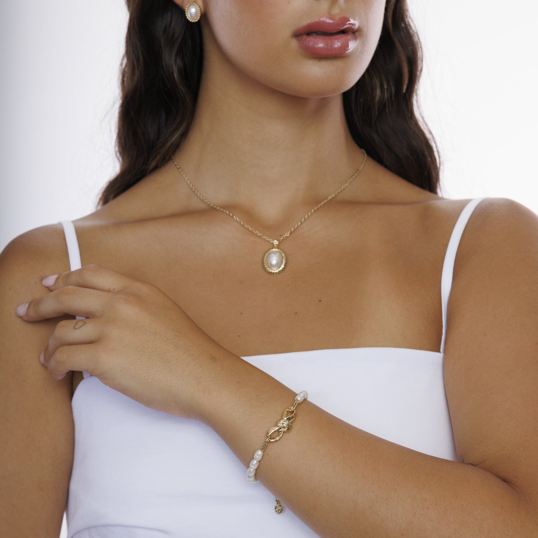 צמיד פנינים אמיתיות טרנדי במראה וינטאג' שייתן לך לוק מדויק, נשי ורומנטי. במרכז הצמיד פפיון העשוי בעבודת יד ומצופה זהב 24K. הצמיד הוא חלק מקולקציית Nostalgia שמבוססת על דגמים ישנים ואהובים, שעוצבו אצלנו בעבודת יד בשנות ה-70, ה- 80 וה-90, מעניקה להם חיים חדשים ומחזירה אותם לקדמת הבמה.