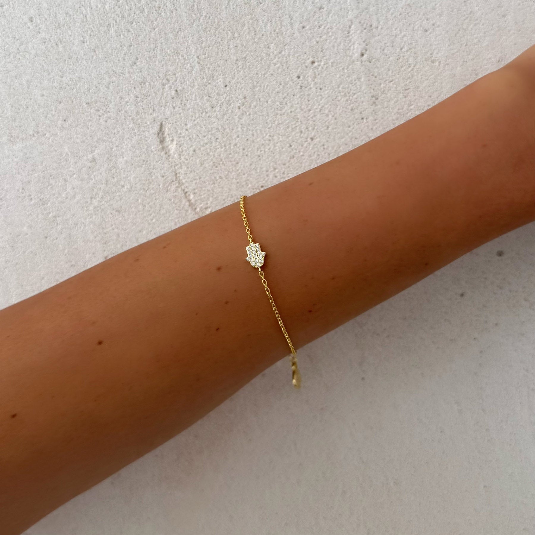 צמיד עדין עם חמסה מנצנצת משובצת בזירקונים. הצמיד עשוי בעבודת יד מכסף סטרלינג 925 ומצופה בזהב 14K.