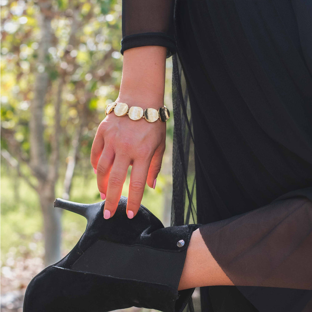 צמיד יפהפה שמורכב מפלטות עגולות מרוקעות, בציפוי זהב 24K.