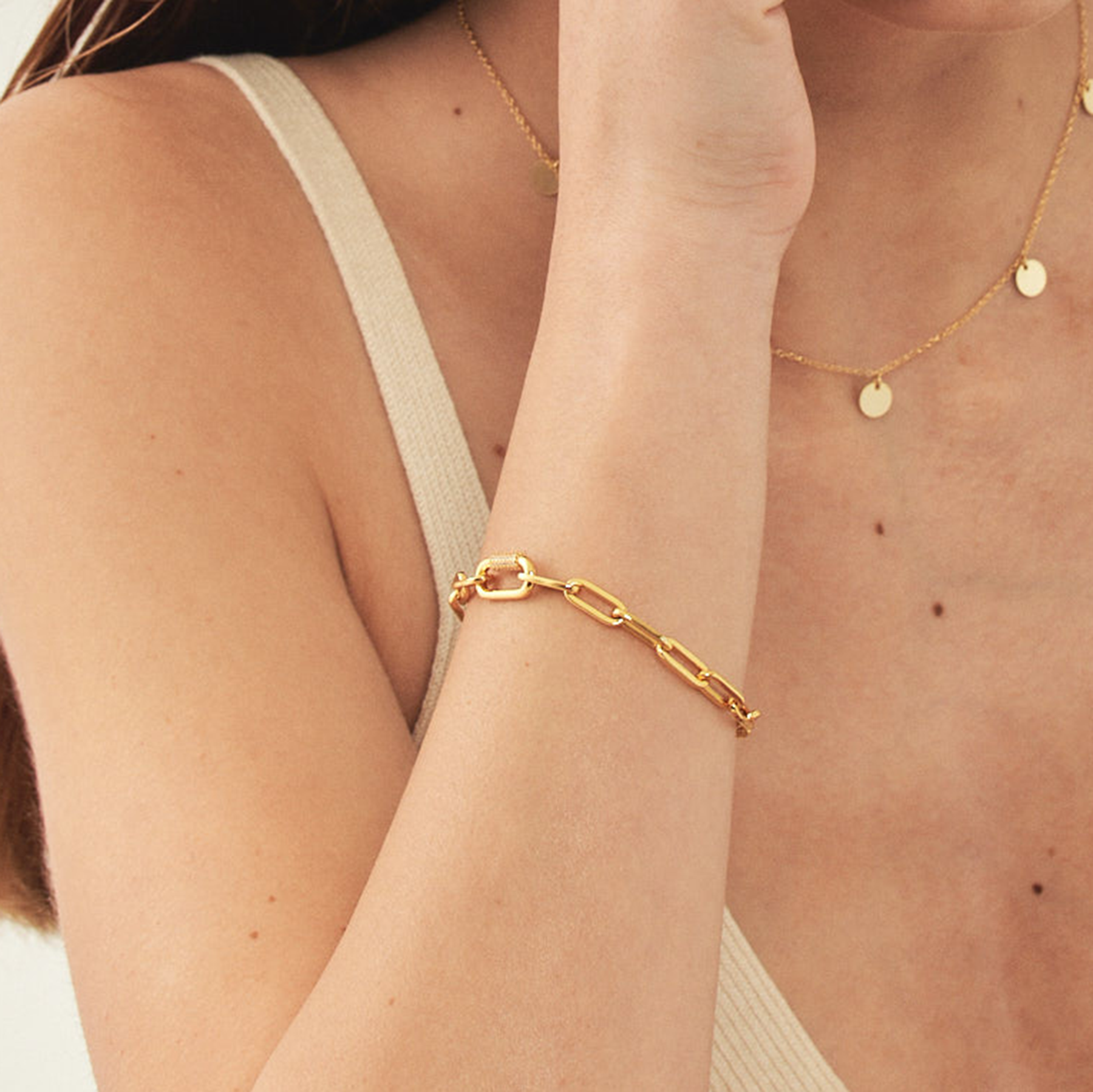 צמיד מעודן עשוי חוליות אובליות, שאחת מהן משובצת אבני זירקון קטנות ומלאות ברק. צמיד טרנדי, שעשוי בעבודת יד מפליז ומצופה זהב K14.