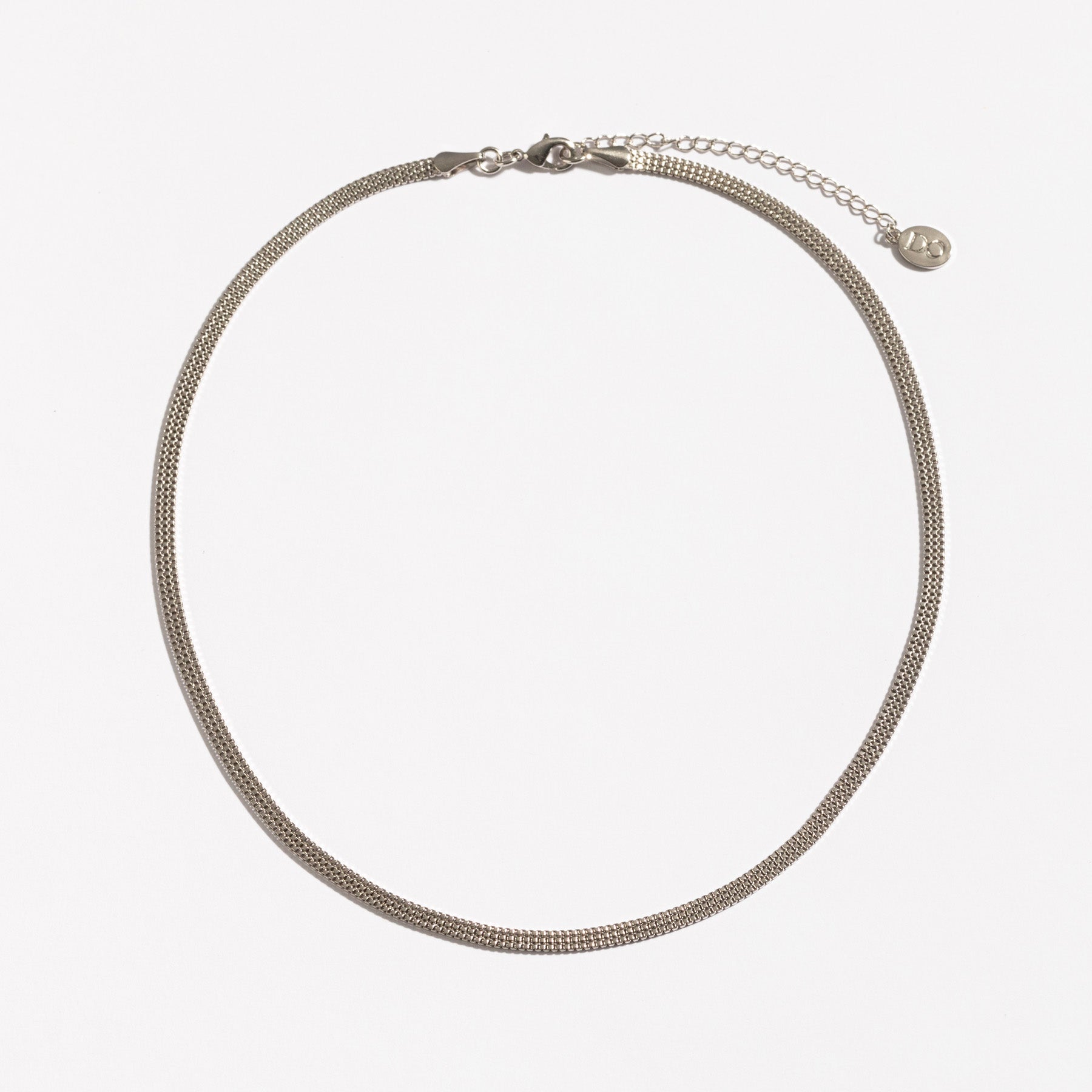 שרשרת שטוחה, מרשימה ונוכחת, מושלמת לענידה לבד או כחלק מלוק שכבות טרנדי. השרשרת עשויה בעבודת יד ומצופה ברודיום.