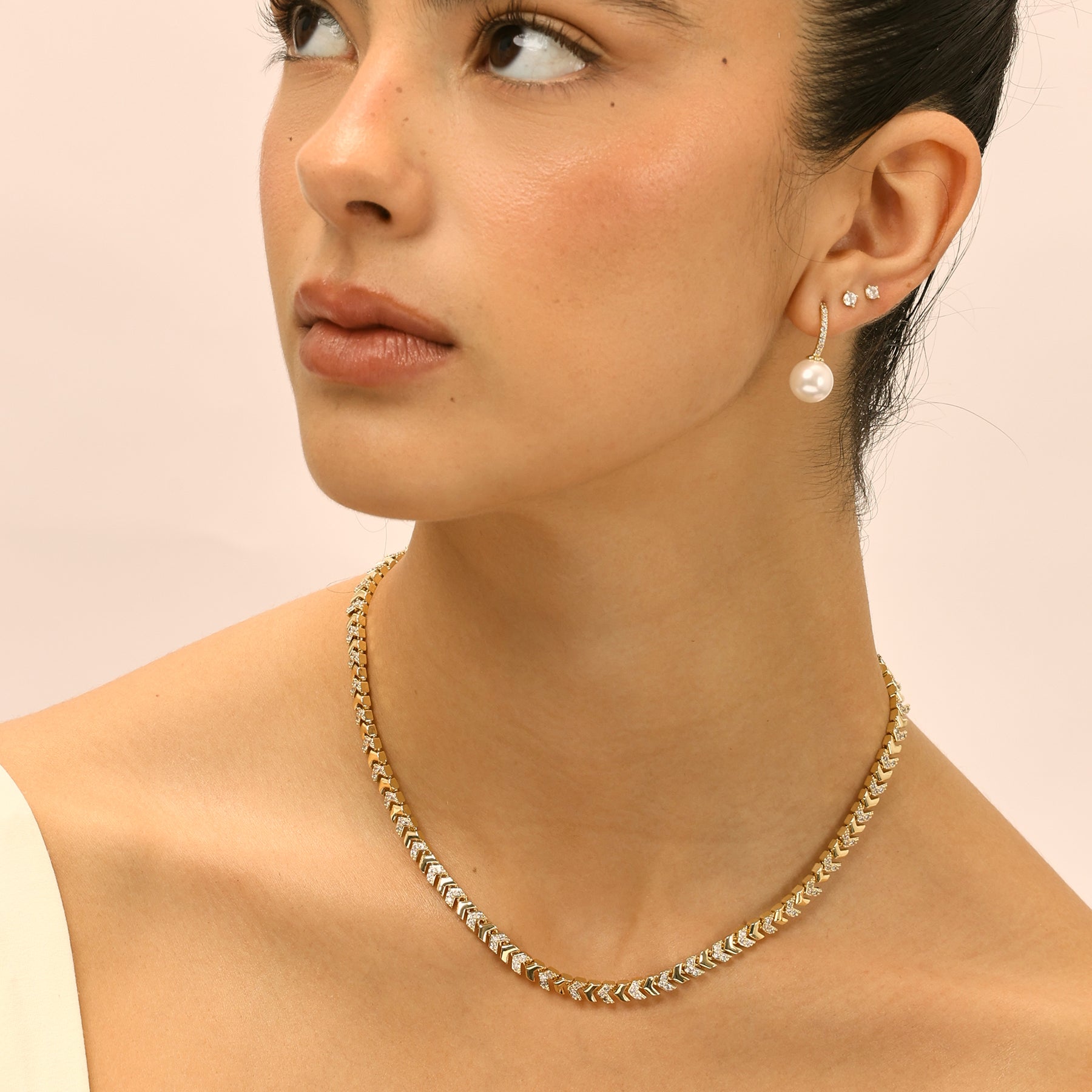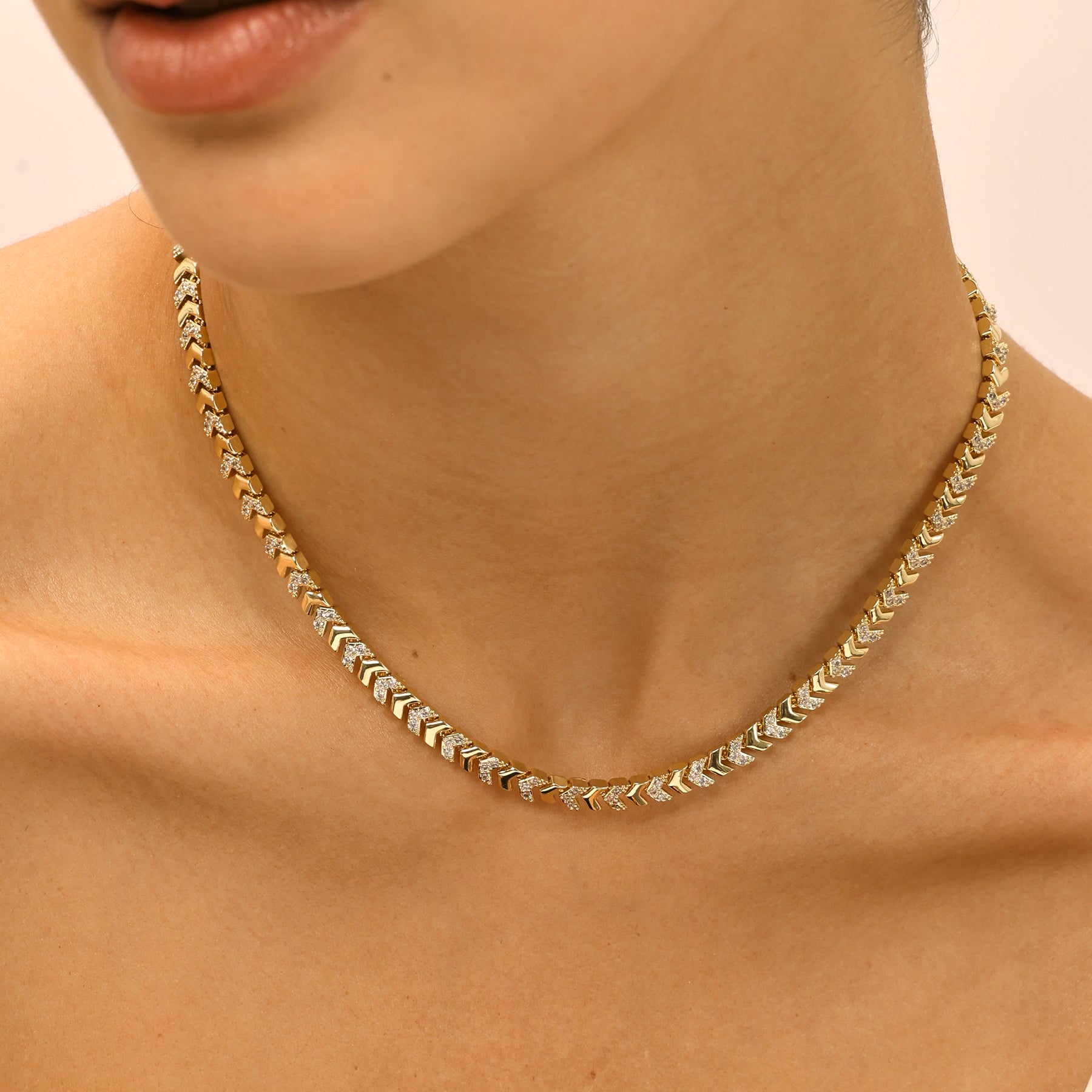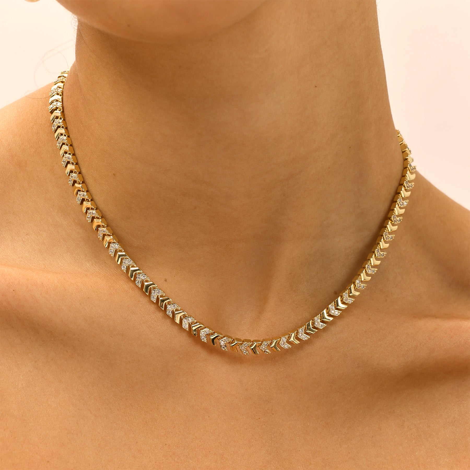 שרשרת סטייטמנט בעיצוב גיאומטרי עם נגיעות וינטג’, משובצת זירקונים נוצצים למראה עשיר ובעל נוכחות. שילוב של קלאסיות על־זמנית ואלגנטיות מודרנית, שמעניק טאץ’ יוקרתי לכל לוק. השרשרת עשויה בעבודת יד ומצופה זהב 14K.