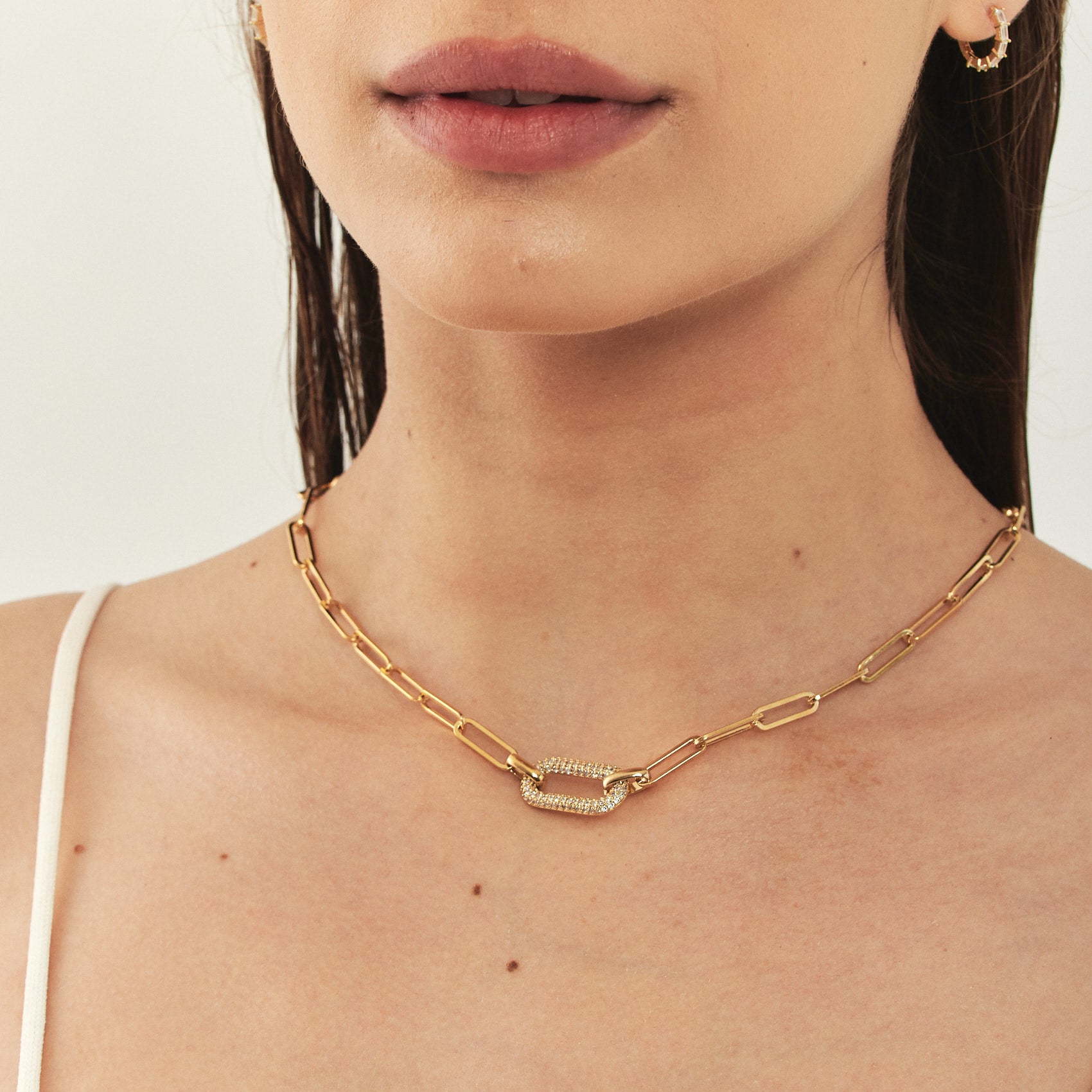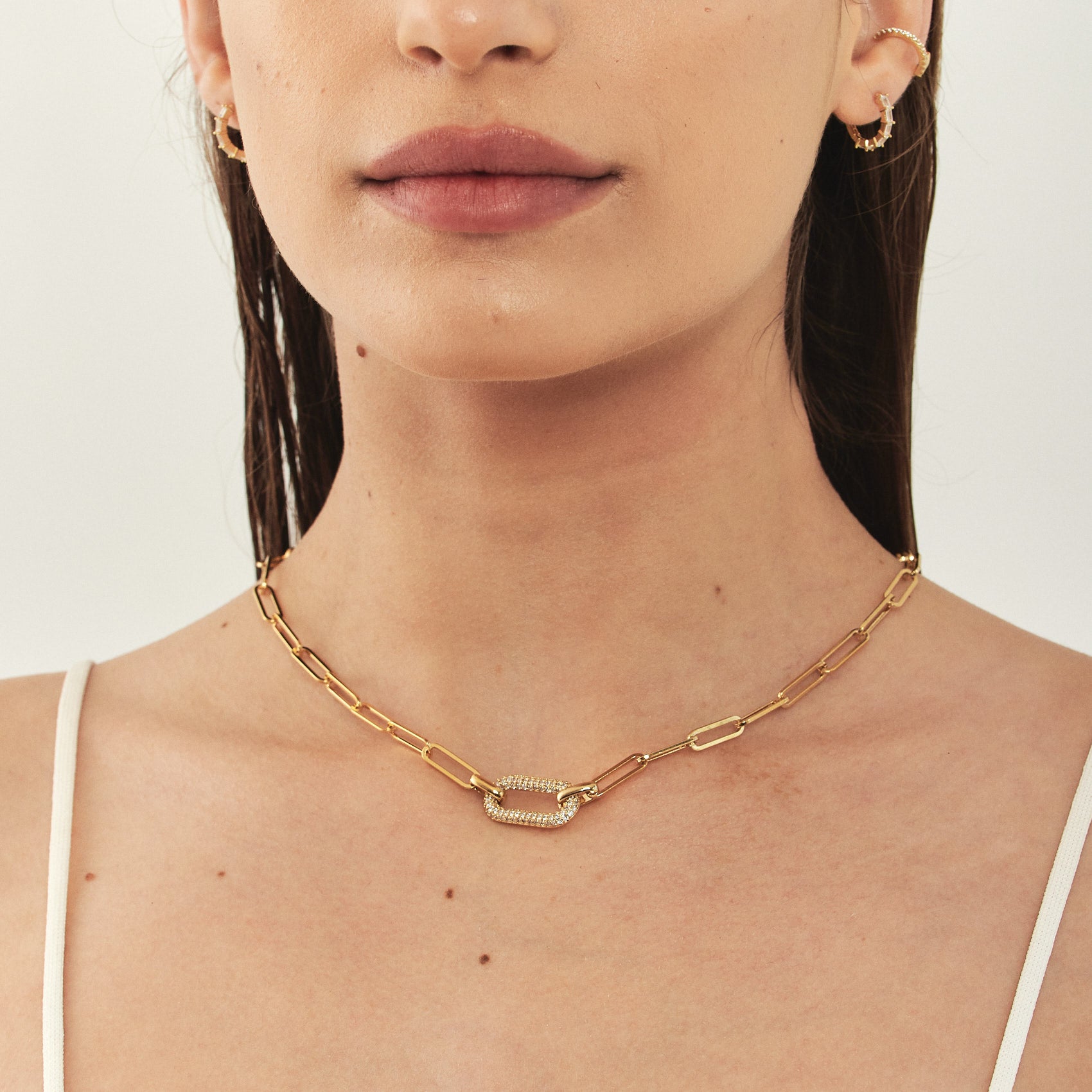 שרשרת חוליות מלבניות טרנדית עם סנטר-פיס מלבני משובץ אבני קריסטל נוצצת. השרשרת מיוצרת בעבודת יד ישראלית ומצופה זהב 24K.