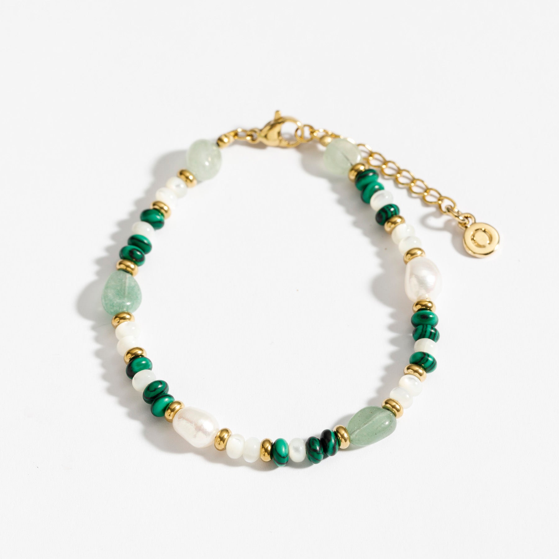 צמיד חרוזים מאבנים טבעיות, עליו מושחלות פנינים, אוונטורין, מלכיט וצדף, משולבות עם חרוזי זהב, ללוק מלא סטייל וצבע. הצמיד עשוי בעבודת יד ומצופה בזהב 14K.