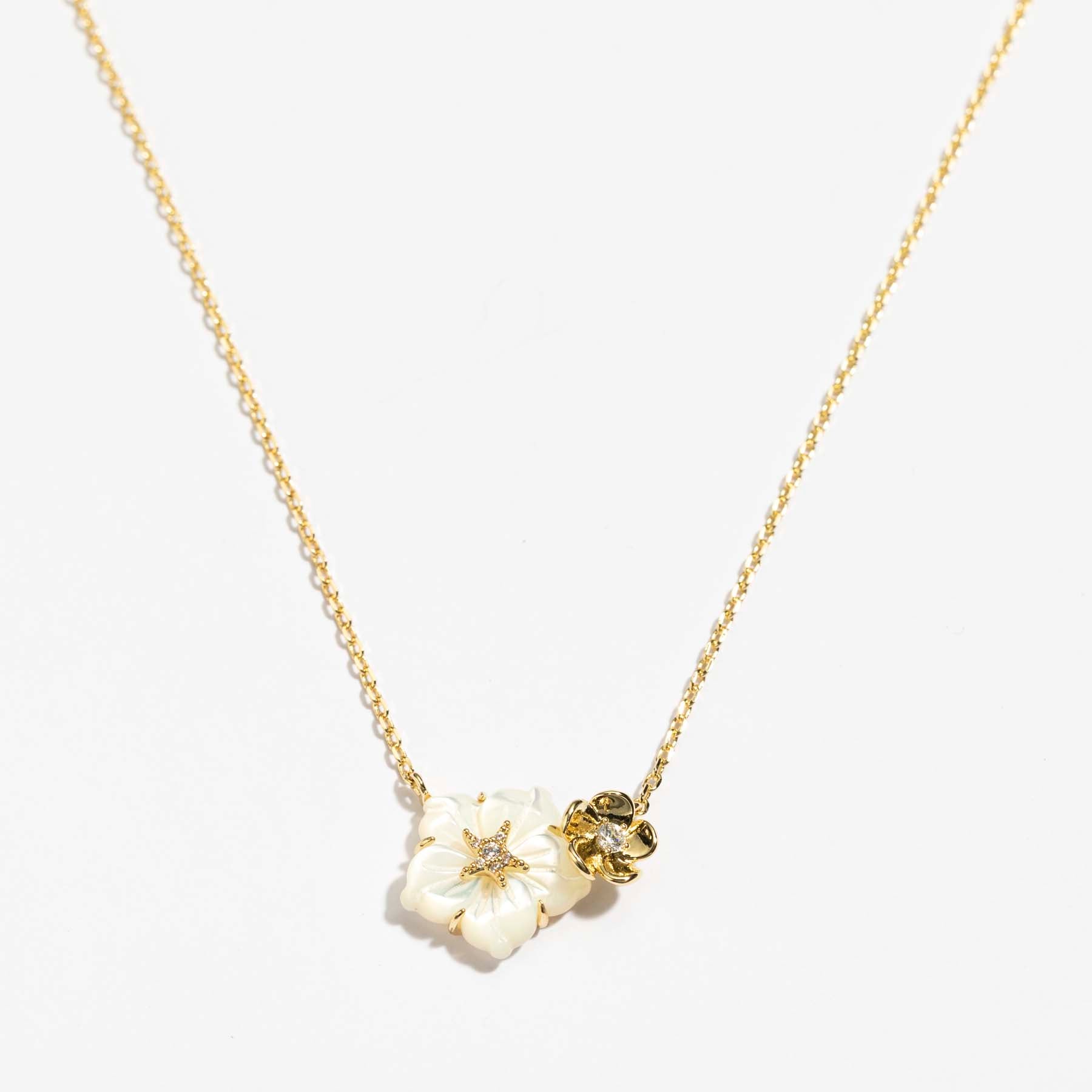 שרשרת פרח עדינה, מעוצבת מאם הפנינה ומשובצת בזירקונים. השרשרת עשויה בעבודת יד ומצופה בזהב 14K.