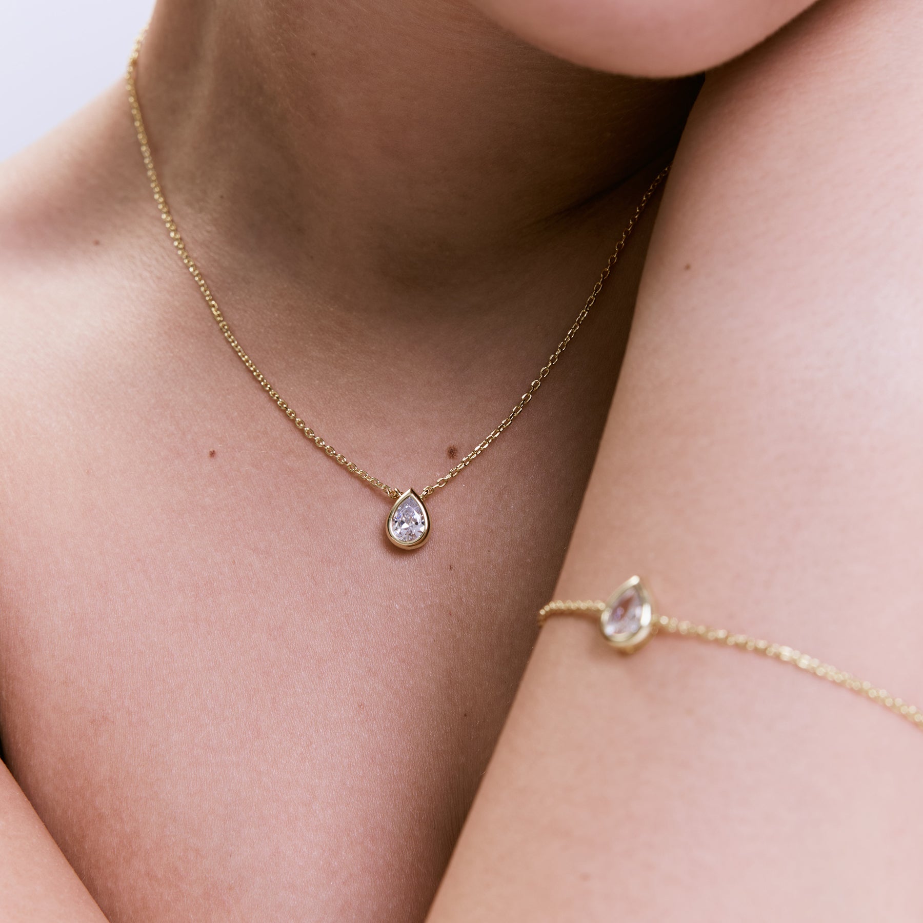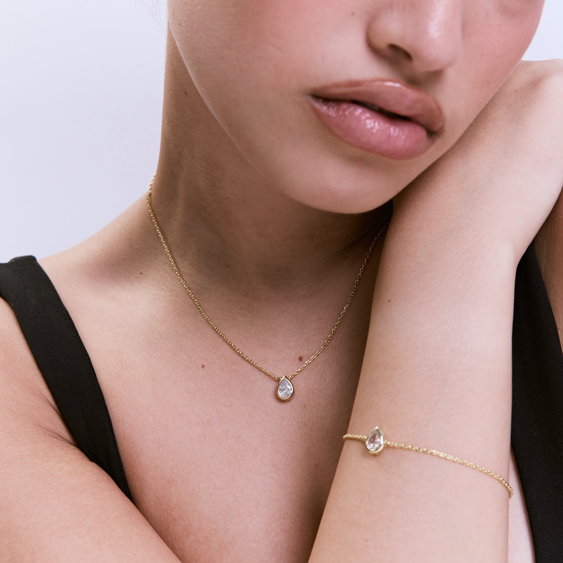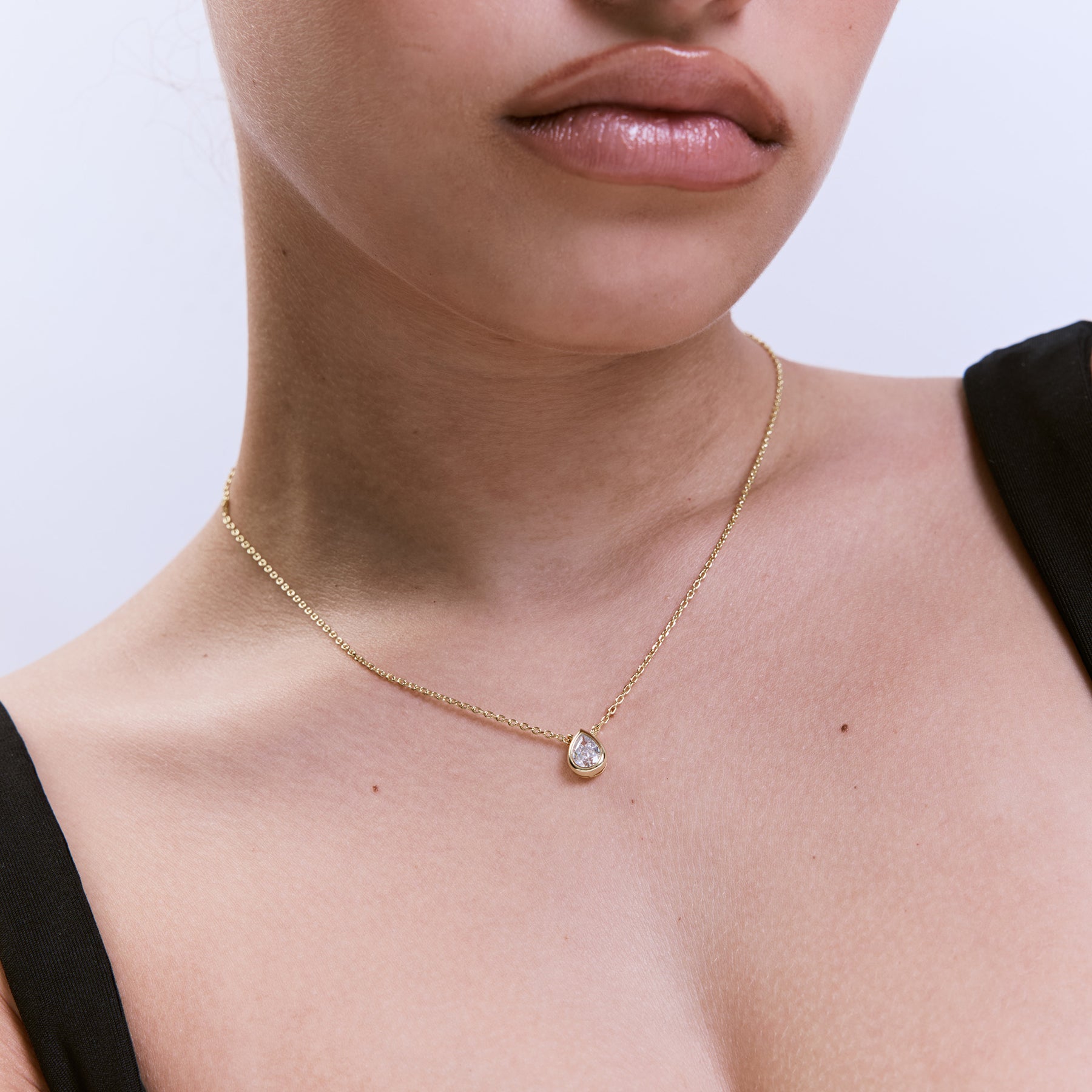 שרשרת קלאסית עדינה עם תליון משובץ בזירקון בצורת טיפה, בעיצוב נקי ואלגנטי. השרשרת עשויה בעבודת יד ומצופה בזהב 14K.