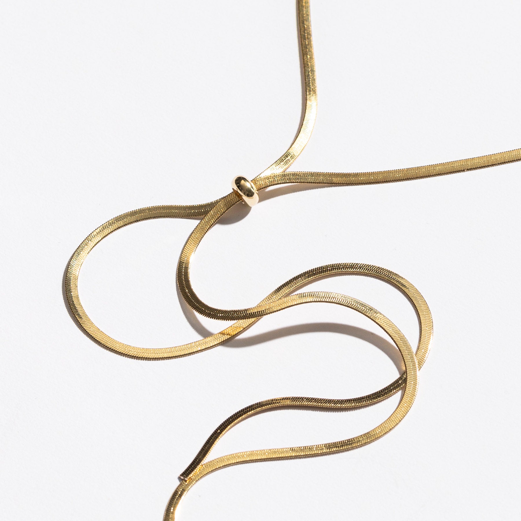 שרשרת עניבה ארוכה בעיצוב נקי, מינימליסטי ויחמיא, ללוק טרנדי ומלא סטייל. השרשרת עשויה בעבודת יד ומצופה בזהב 14K.
