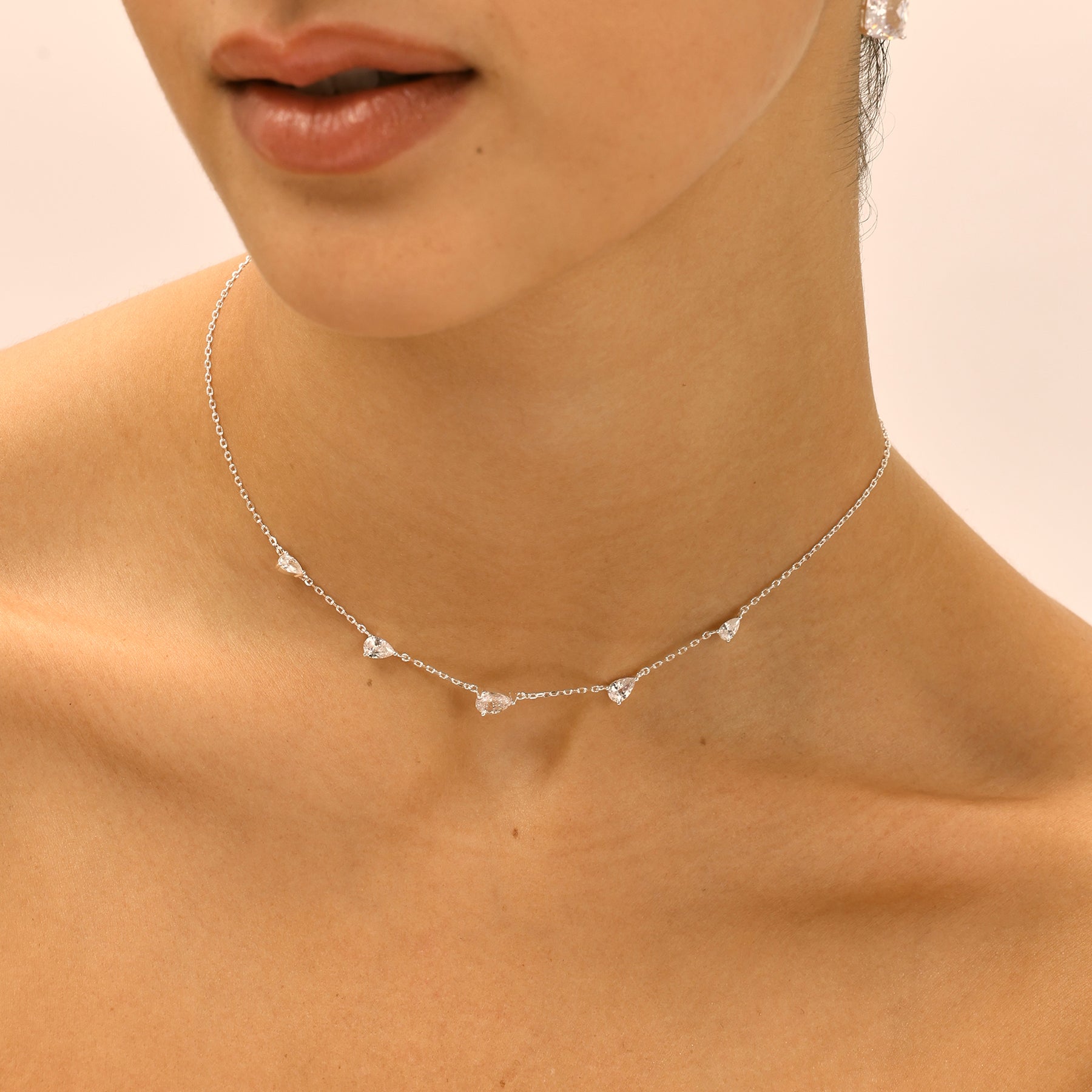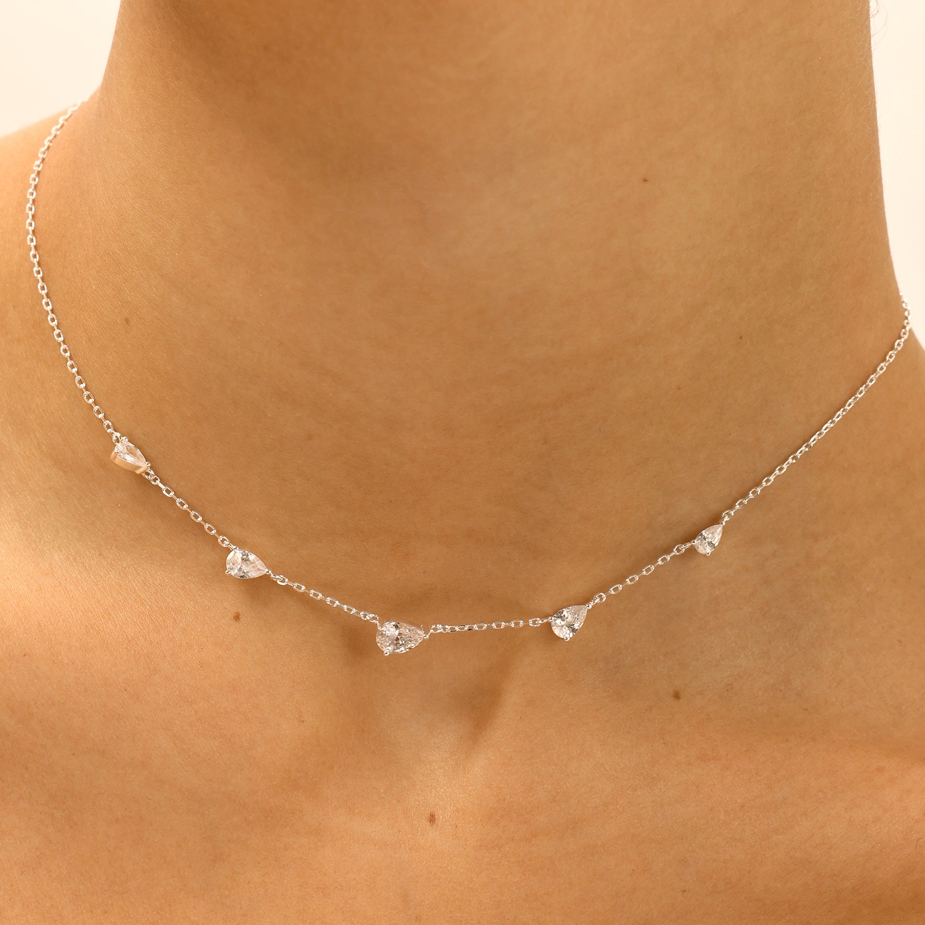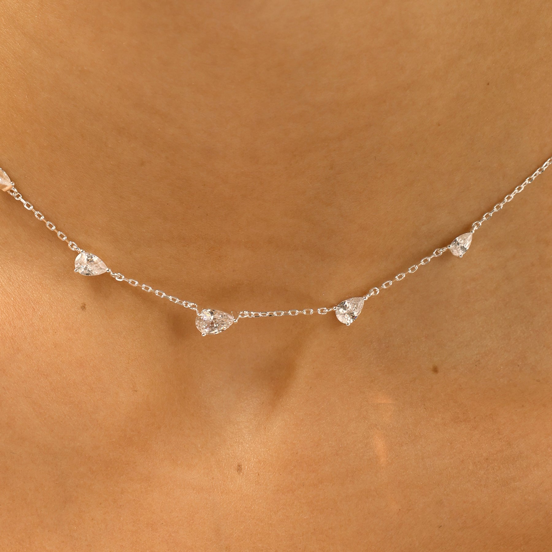 שרשרת אלגנטית וקלילה, משולבת אבני זירקון בצורת טיפה, הפזורות בעדינות לאורך השרשרת. ברק רך ומינימליסטי שמוסיף נגיעה זוהרת ומתאים גם ללוק יומיומי וגם למראה ערב. השרשרת עשויה בעבודת יד ומצופה כסף טהור.