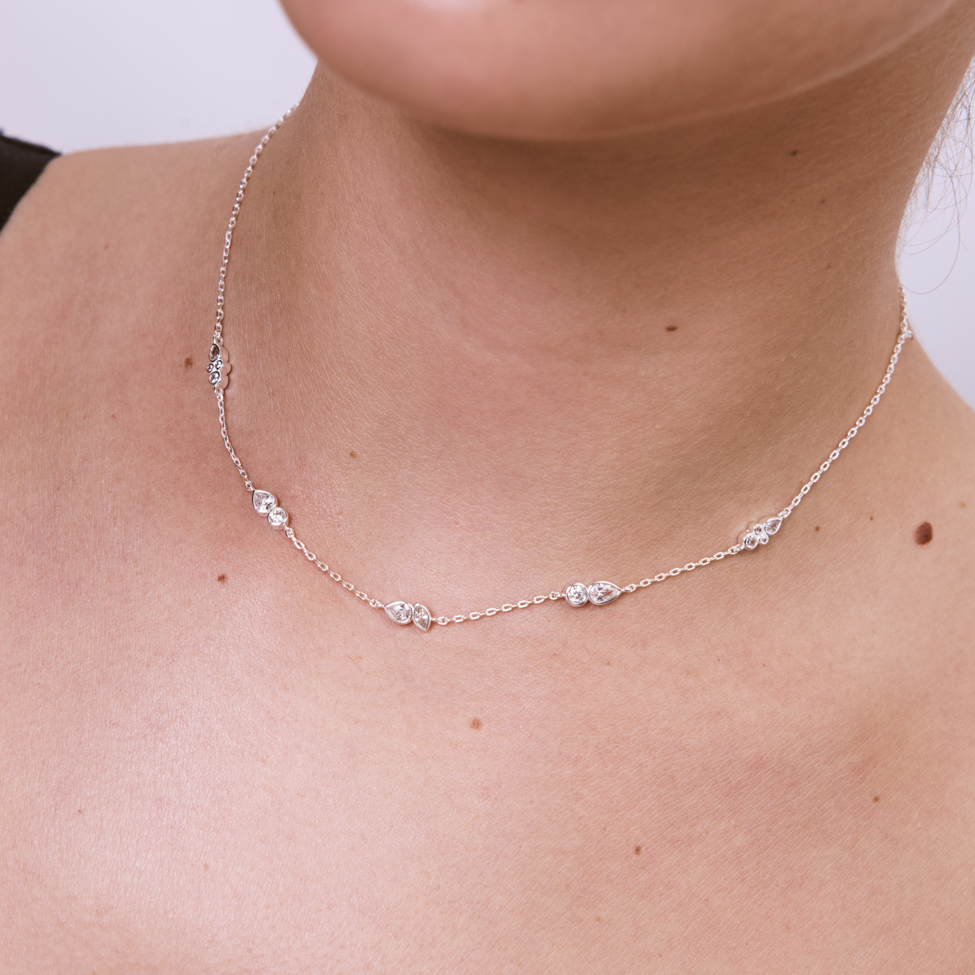שרשרת עדינה משובצת בזירקונים במגוון צורות ושילובים, בעיצוב רענן, יוקרתי ומלא קסם. השרשרת עשויה בעבודת יד ומצופה בכסף טהור.