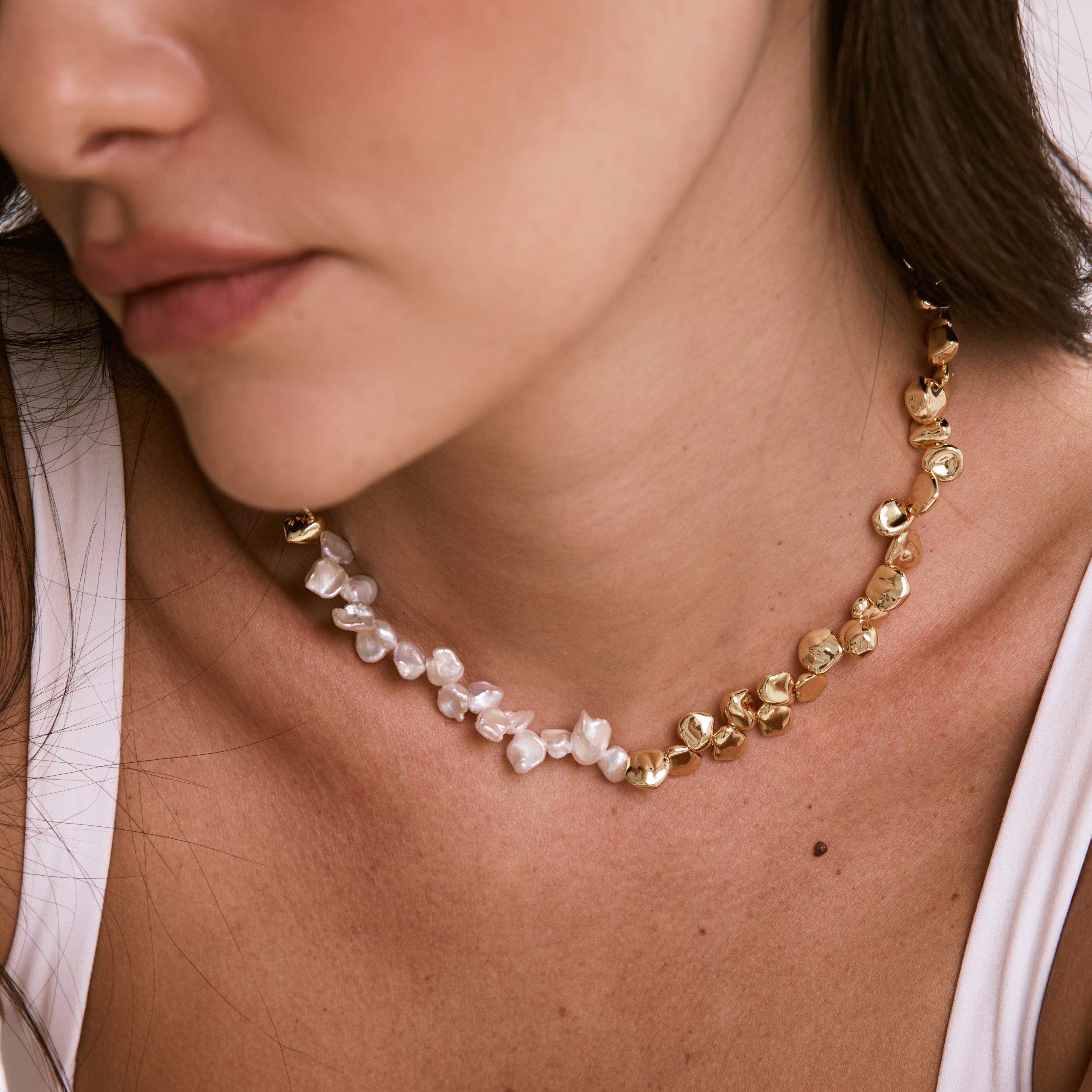 מחרוזת יוקרתית המשלבת פנינים פראיות טבעיות ואלמנטים מוזהבים, בעיצוב אלגנטי, עשיר ומלא נוכחות. המחרוזת עשויה בעבודת יד ומצופה בזהב 14K.