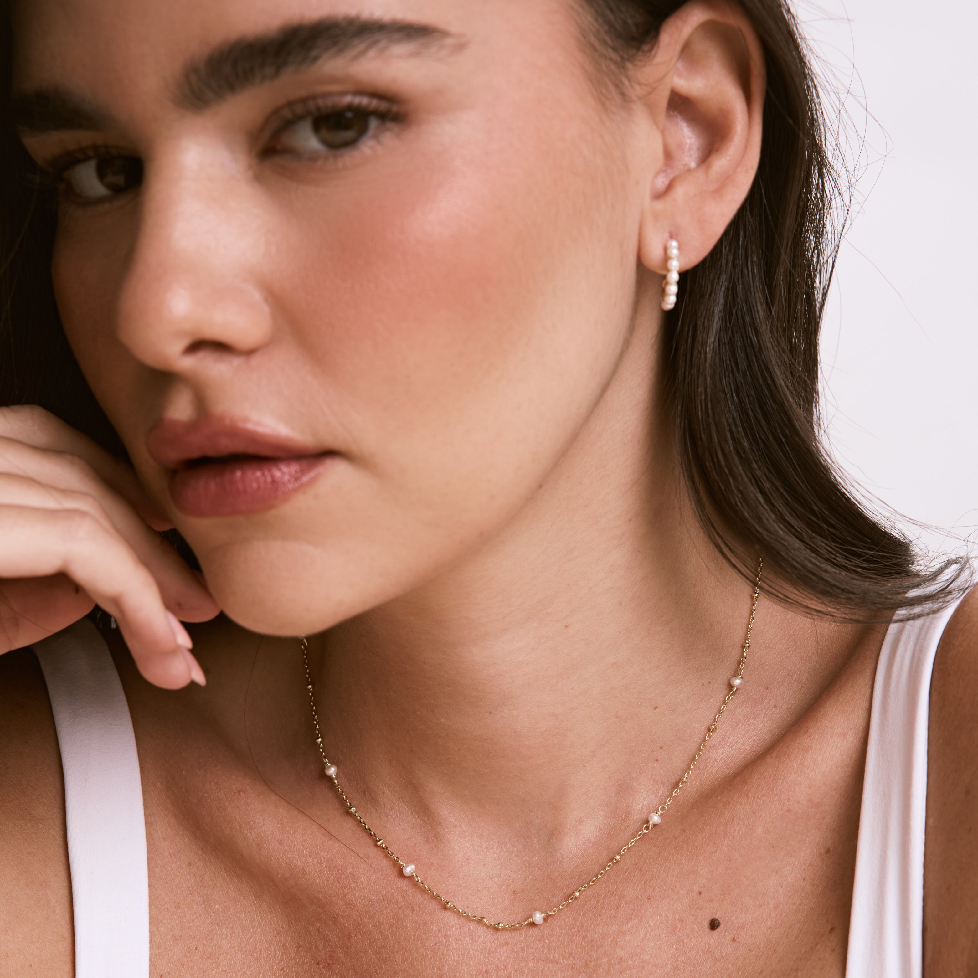 שרשרת חוליות עדינה משולבת חרוזי זהב ופנינים קטנות, בעיצוב רענן, מחמיא ומלא סטייל. השרשרת עשויה בעבודת יד ומצופה בזהב 14K.