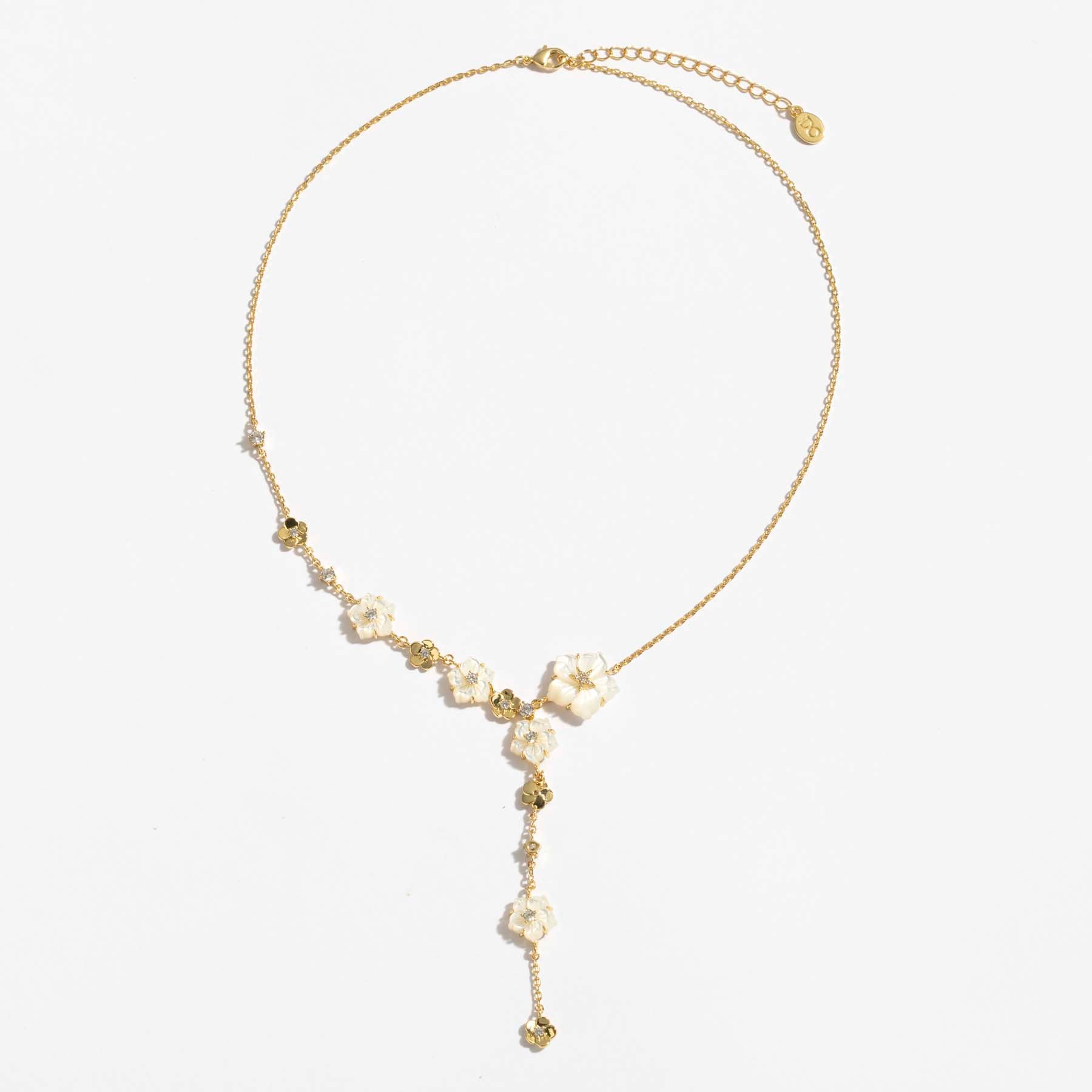 שרשרת Y פרחים, מעוצבת מאם הפנינה ומשובצת בזירקונים. השרשרת עשויה בעבודת יד ומצופה בזהב 14K.