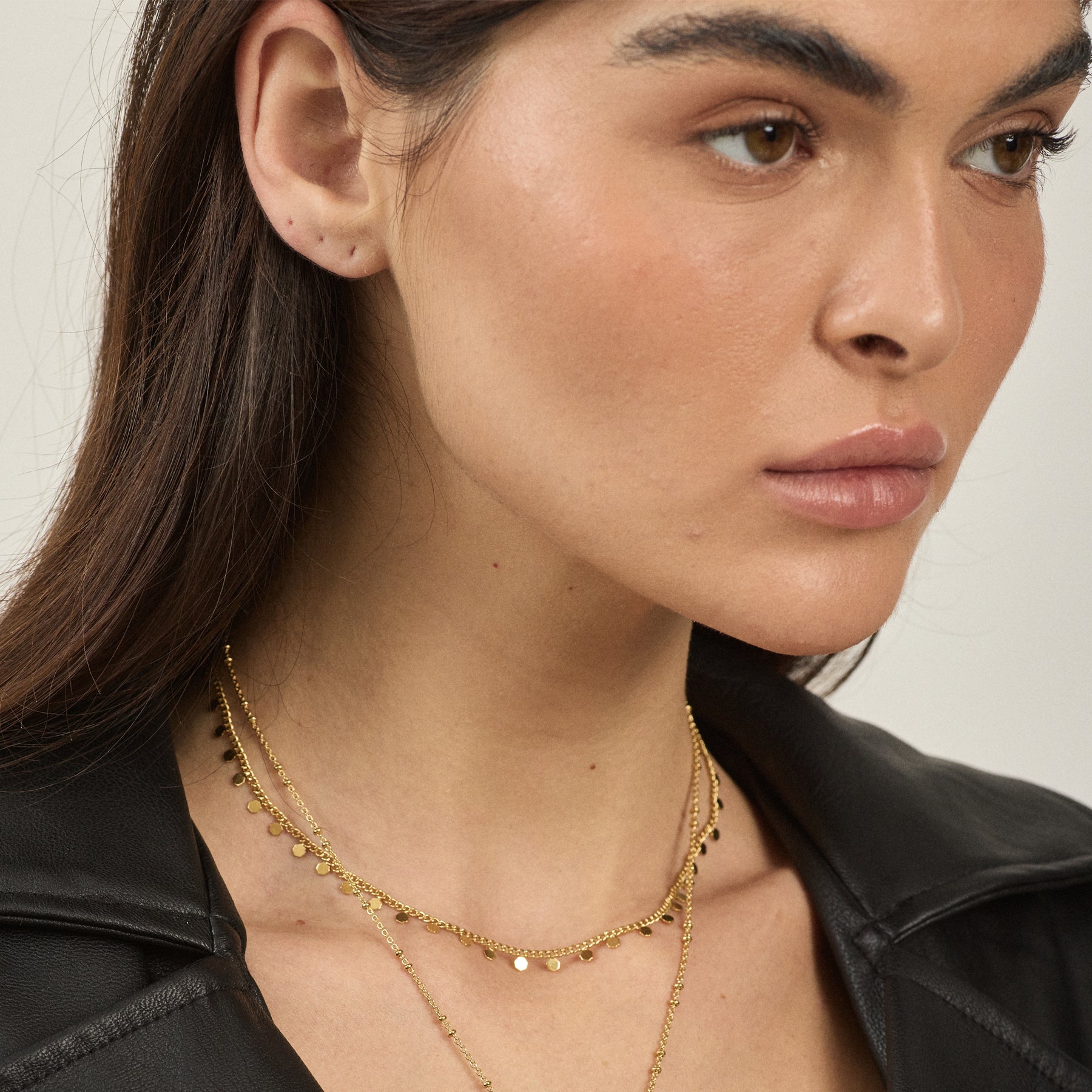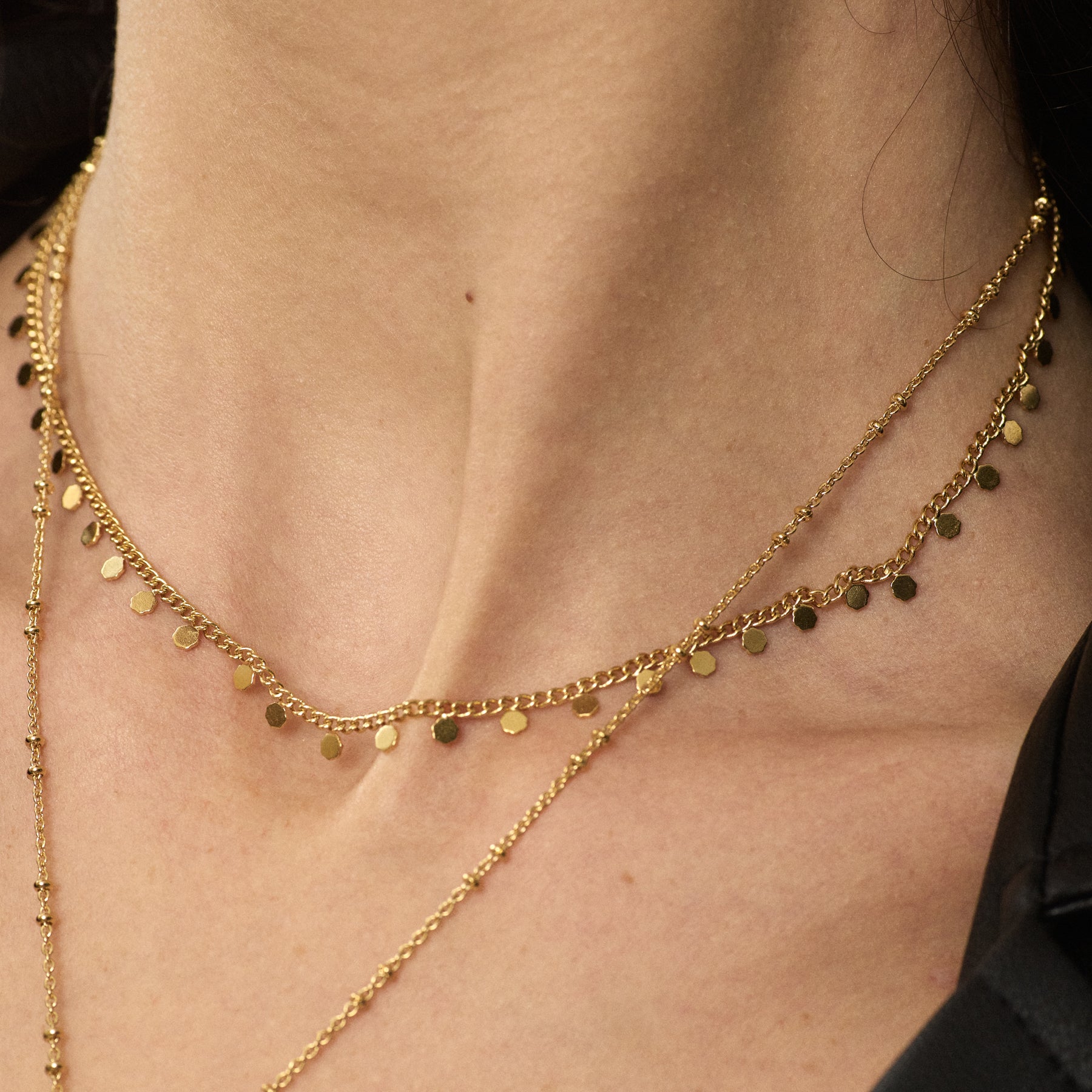שרשרת איוס היא שרשרת קולר סופר-טרנדית בדוגמת גורמט עדינה במיוחד, שממנה נופלות דסקיות פרחים קטנטנות.