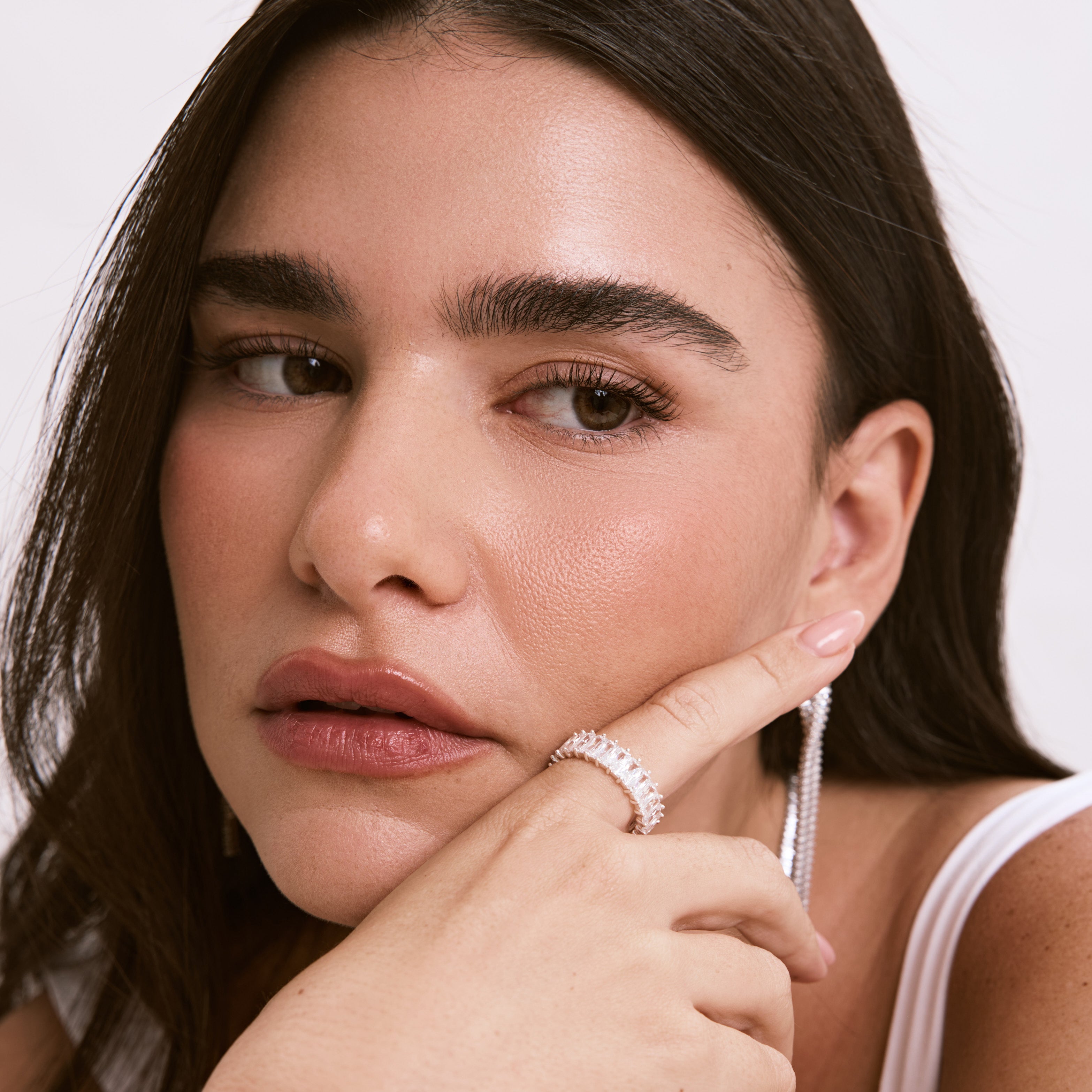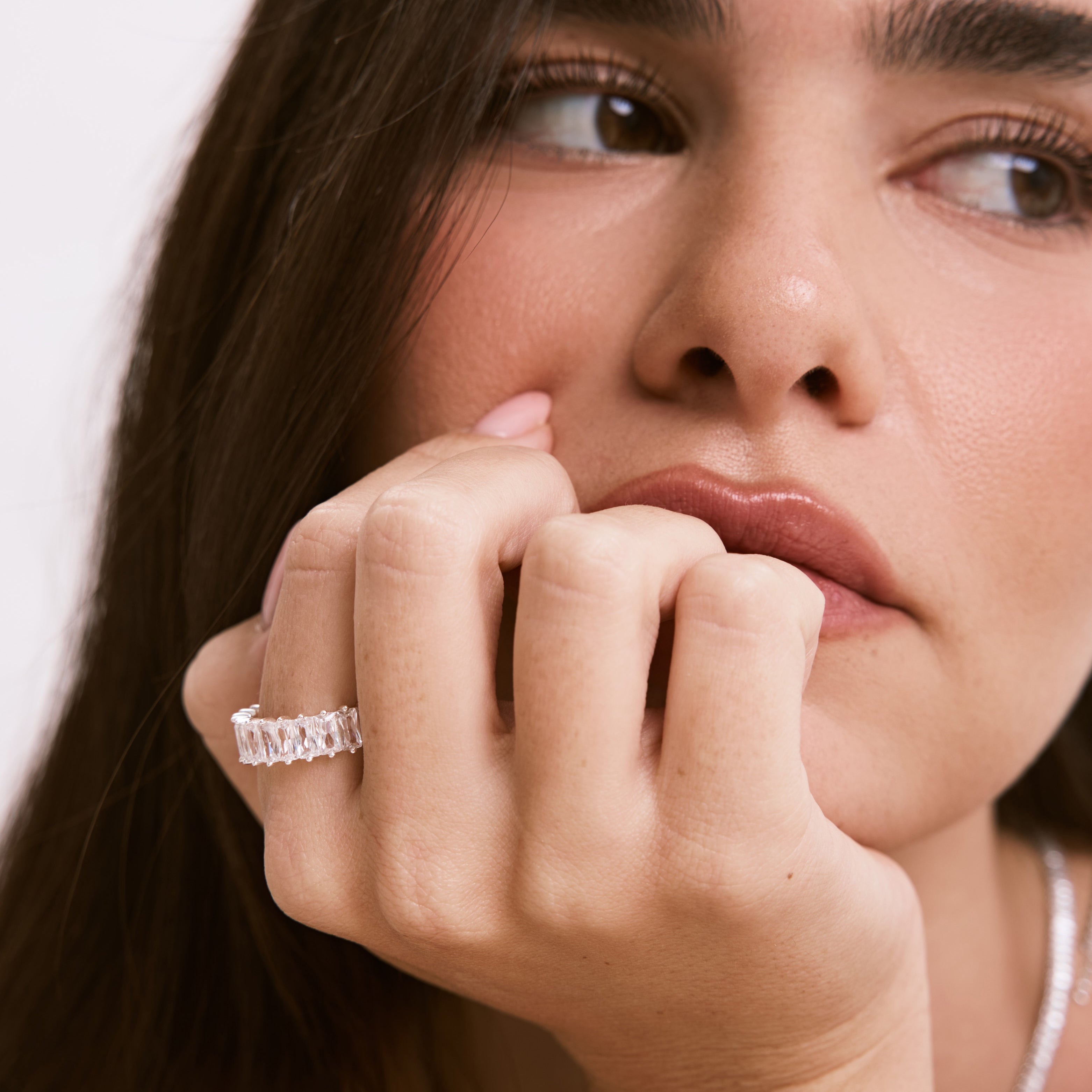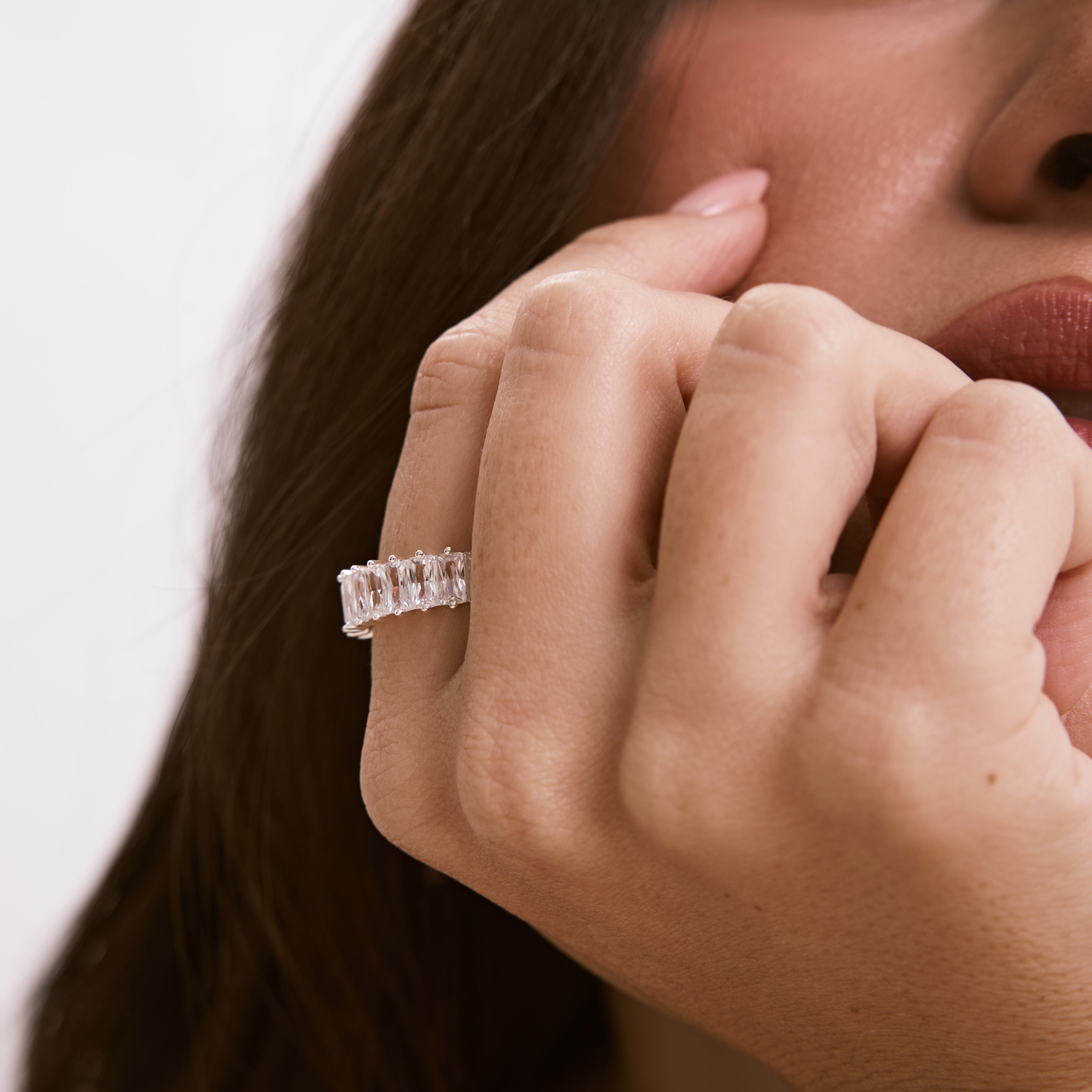 טבעת יוקרתית משובצת כולה בזירקונים מלבניים מרהיבים, ללוק עשיר ובלתי נשכח. הטבעת עשויה בעבודת יד ומצופה ברודיום.