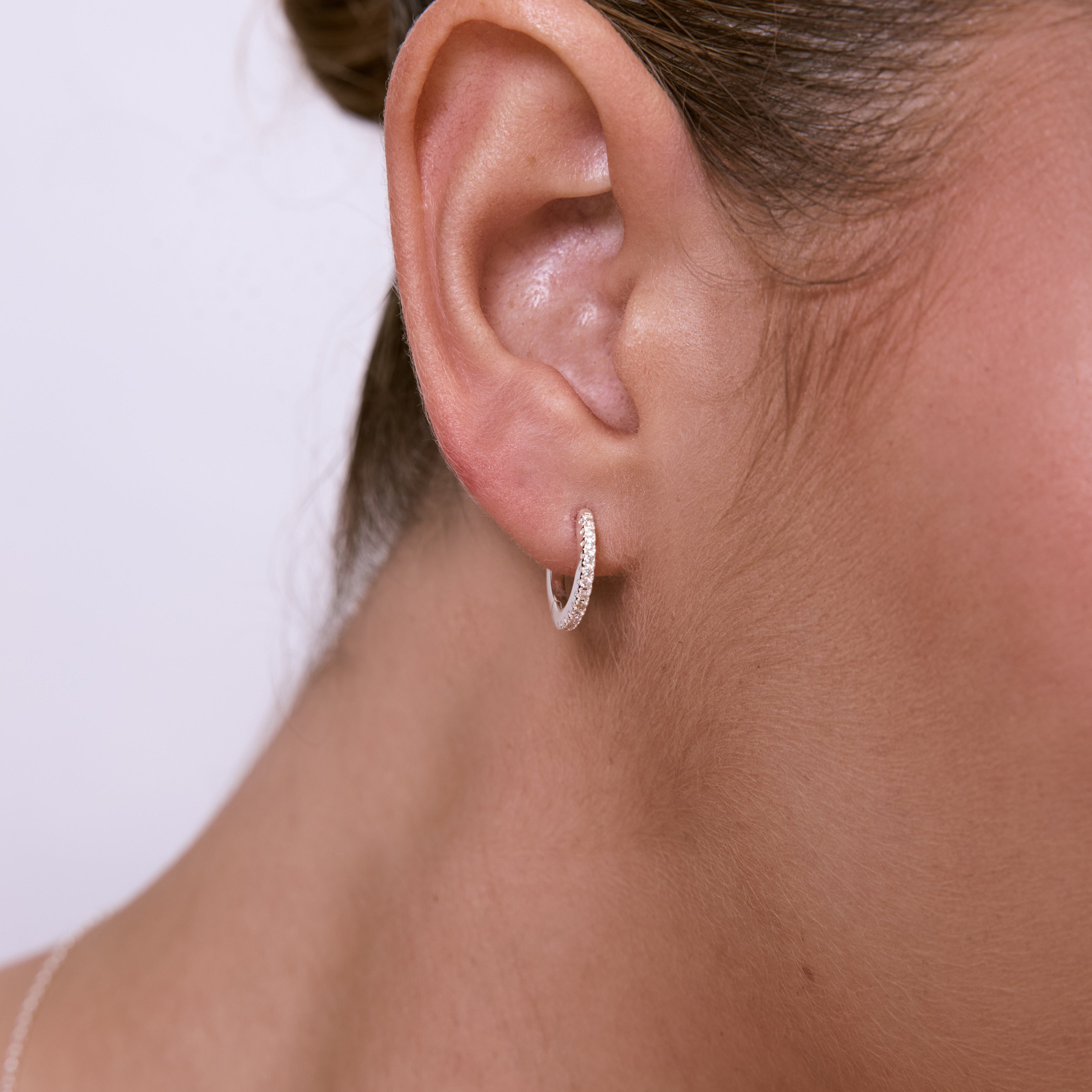 עגילי חישוק משובצים זירקונים מנצנצים בעיצוב קלאסי ואלגנטי, שלא ירדו לך מהאוזן. גודל בינוני. העגילים עשויים בעבודת יד ומצופים בכסף טהור.