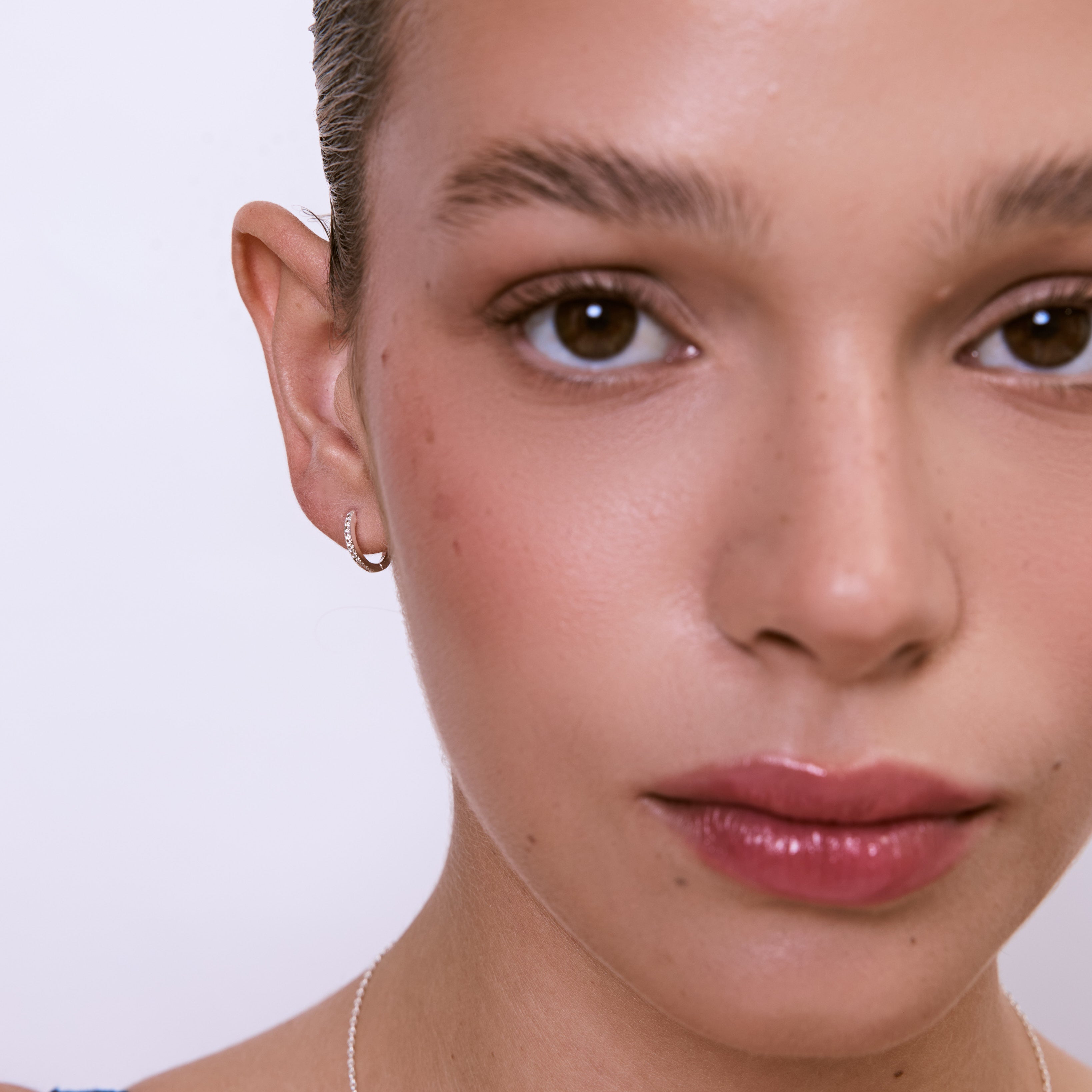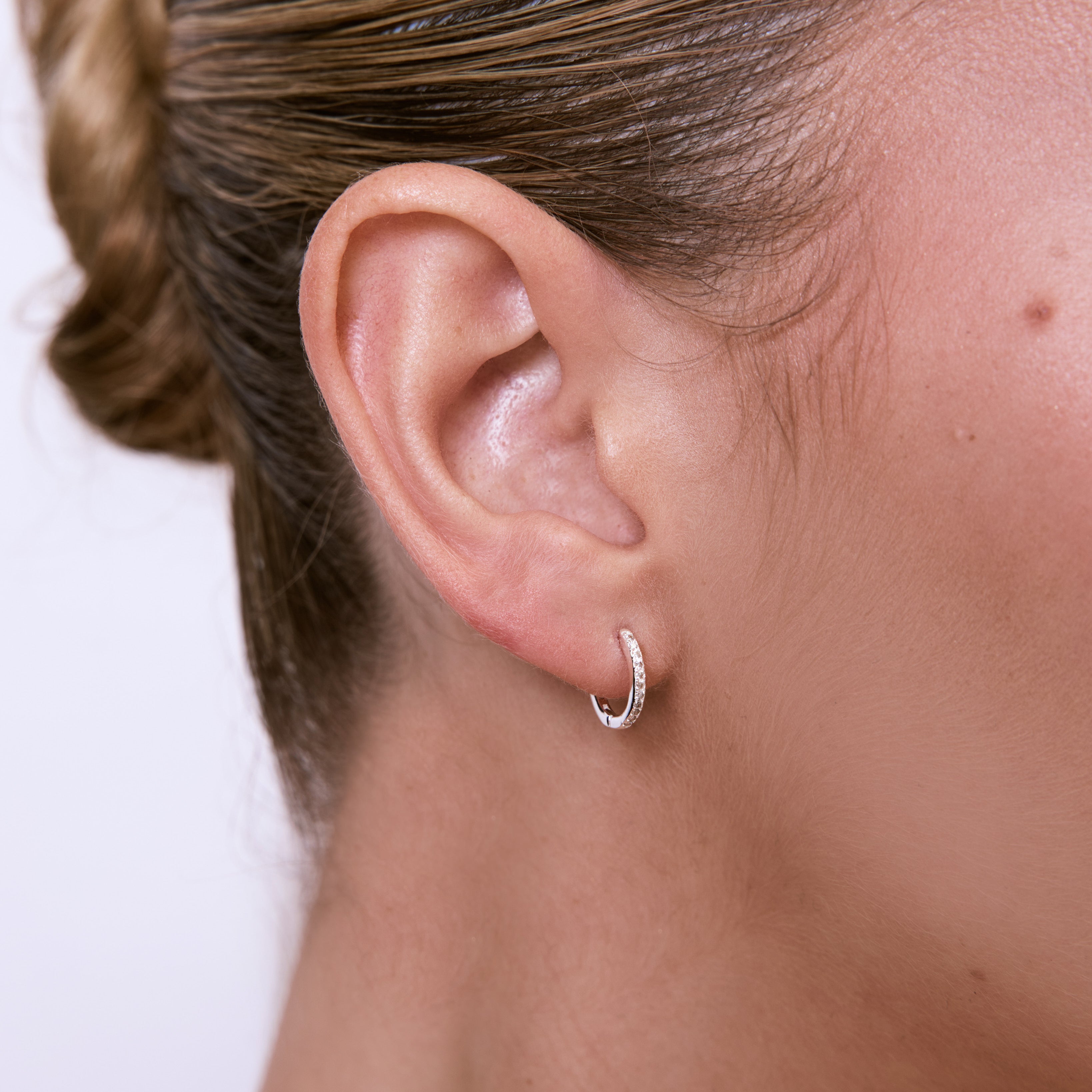 עגילי חישוק משובצים זירקונים מנצנצים בעיצוב קלאסי ואלגנטי, שלא ירדו לך מהאוזן. גודל קטן. העגילים עשויים בעבודת יד ומצופים בכסף טהור.
