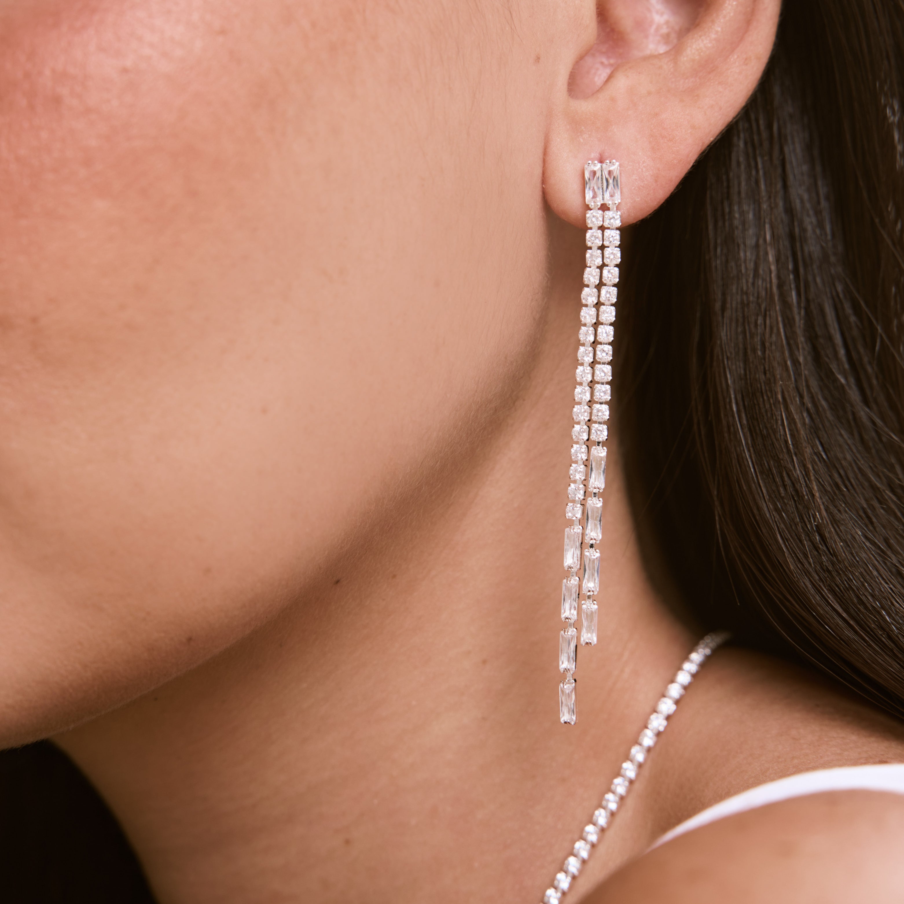 עגילים תלויים ארוכים, משובצים בזירקונים עגולים ומלבניים, בעיצוב אלגנטי ומלא גלאם. העגילים עשויים בעבודת יד ומצופים בכסף טהור.