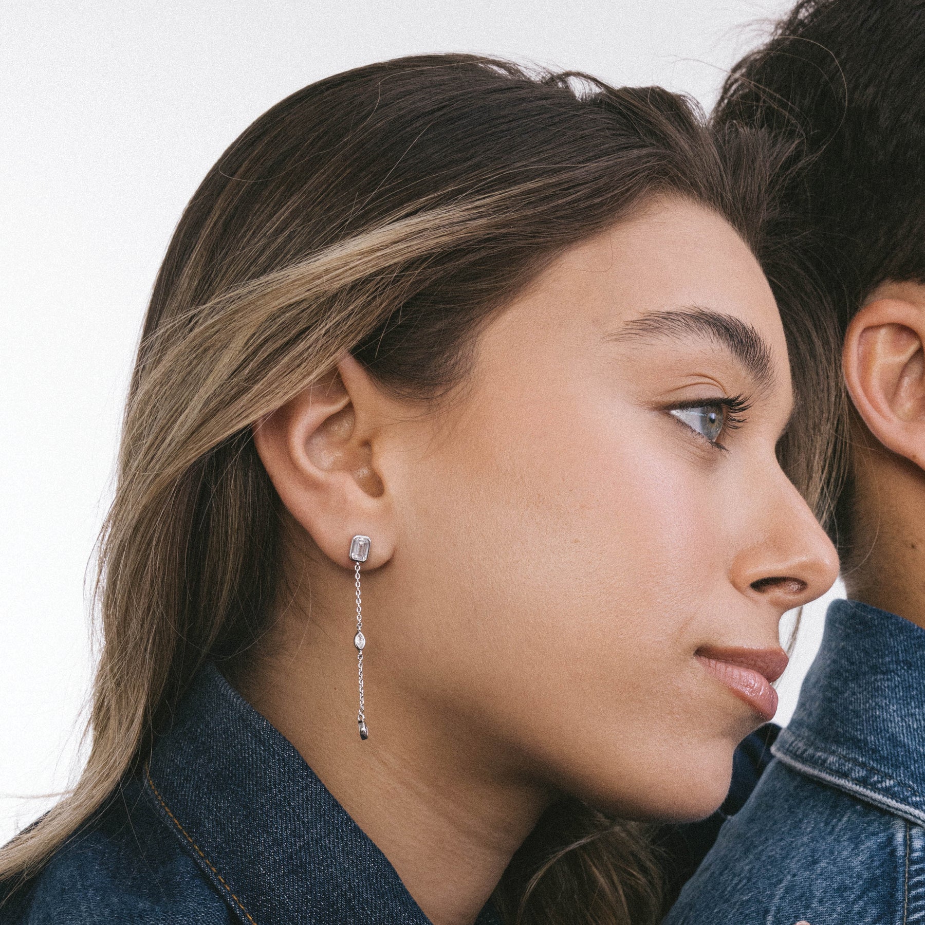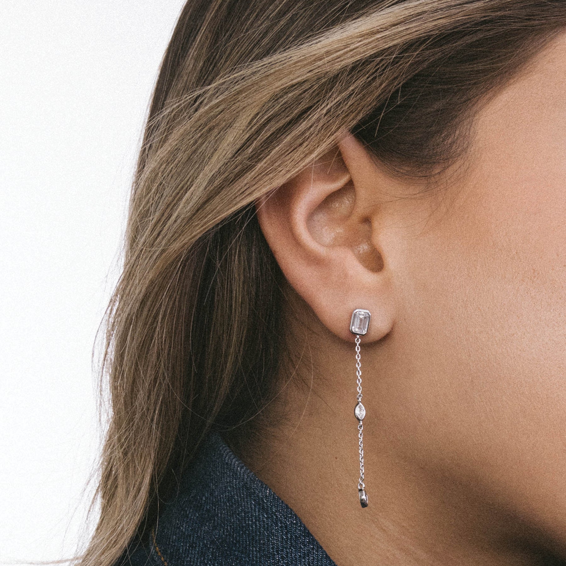 עגילים ארוכים עשויים שלוש אבני זירקון יוקרתיות, שהופכות אותם מתאימים במיוחד לערב או לאירועים מיוחדים. העגילים עשויים בעבודת יש ומצופים רודיום.