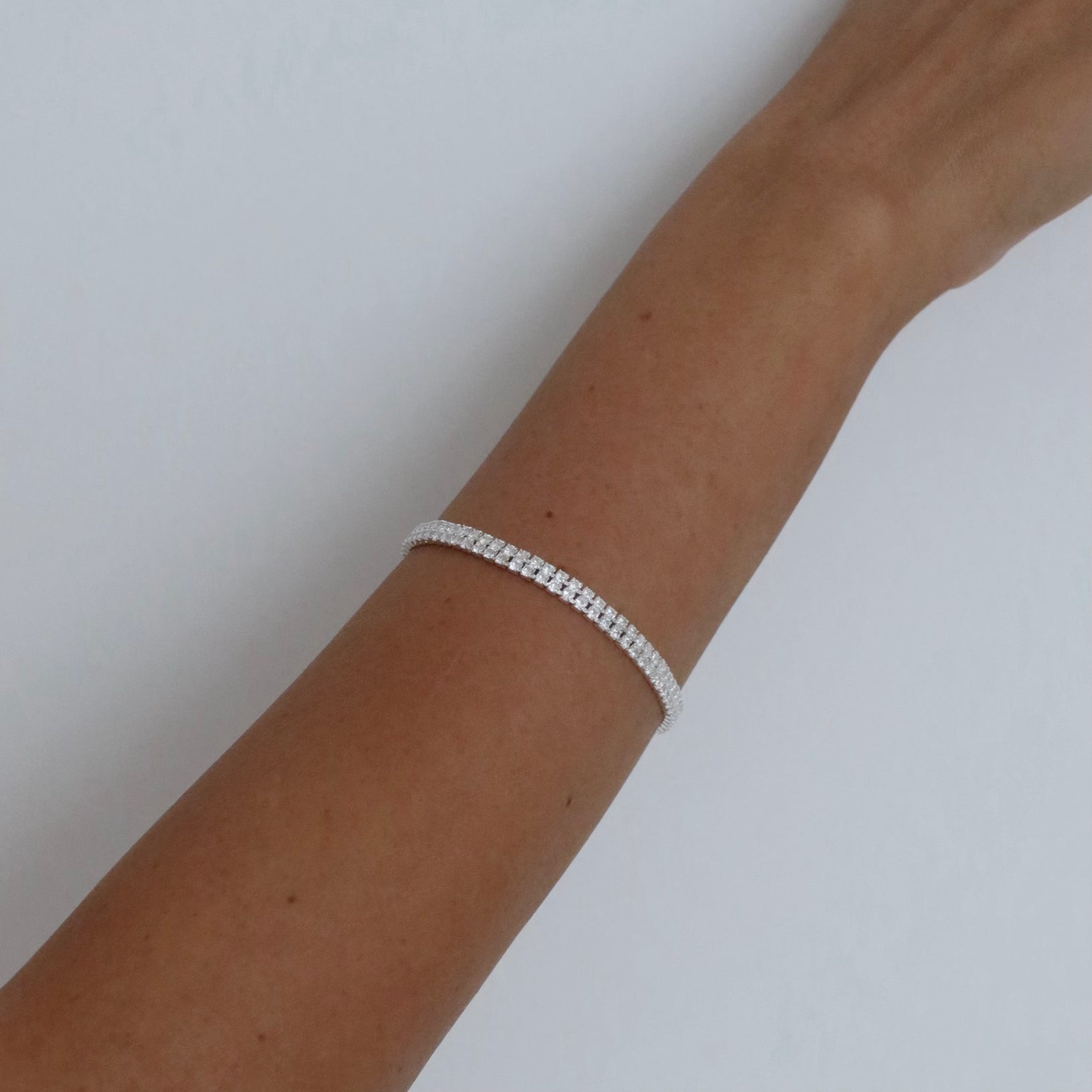 צמיד טניס כפול משובץ בזירקונים, בעיצוב אלגנטי ומלא גלאם. הצמיד עשוי בעבודת יד ומצופה בכסף טהור.