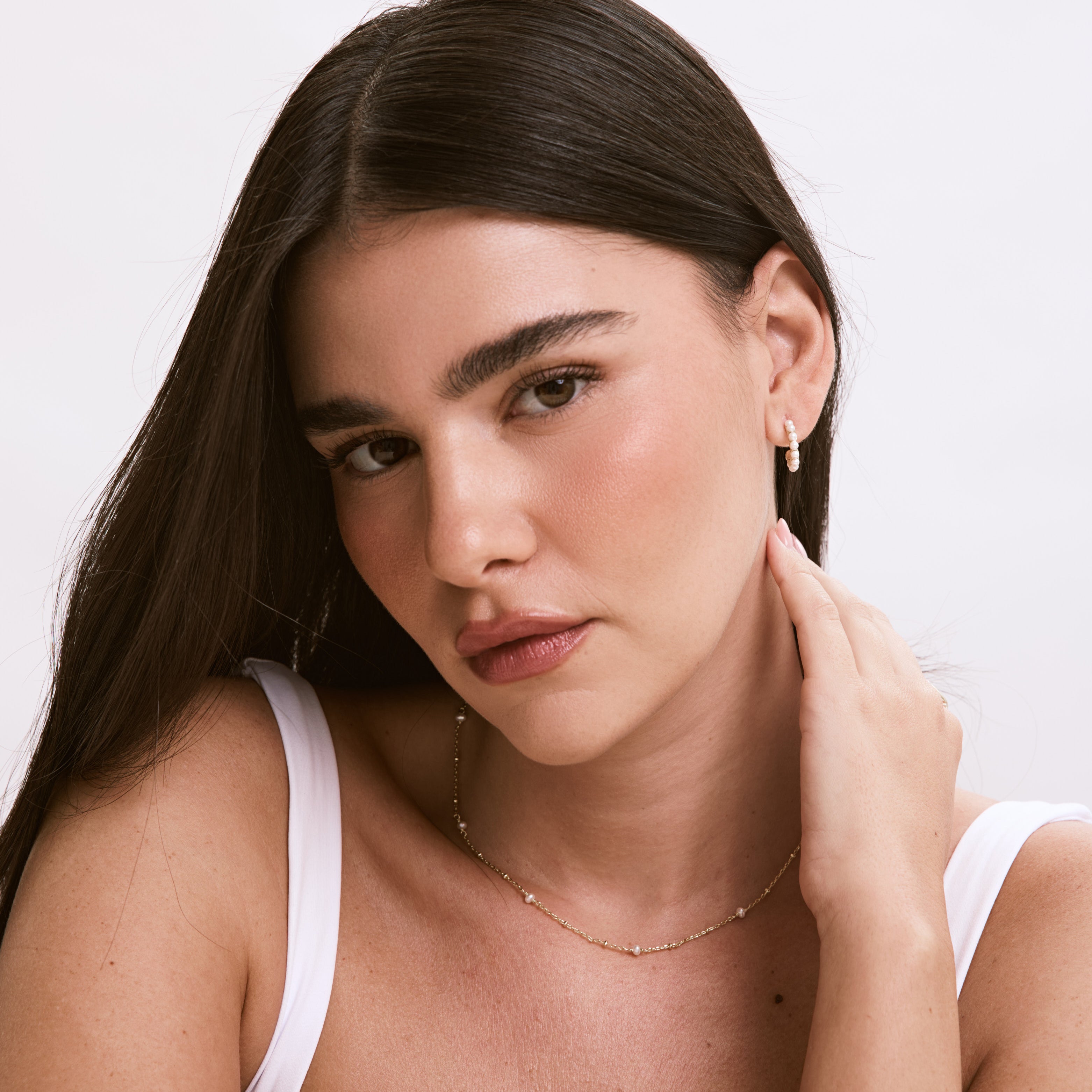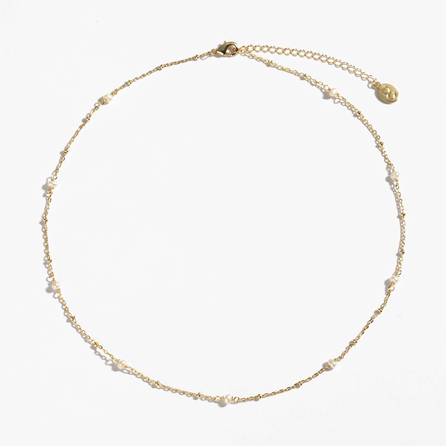 שרשרת חוליות עדינה משולבת חרוזי זהב ופנינים קטנות, בעיצוב רענן, מחמיא ומלא סטייל. השרשרת עשויה בעבודת יד ומצופה בזהב 14K.