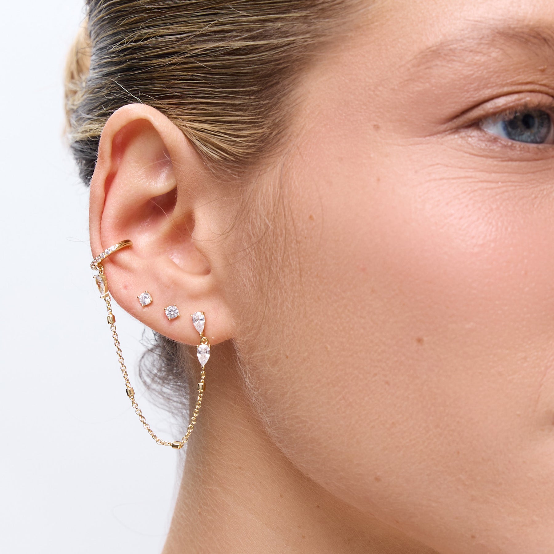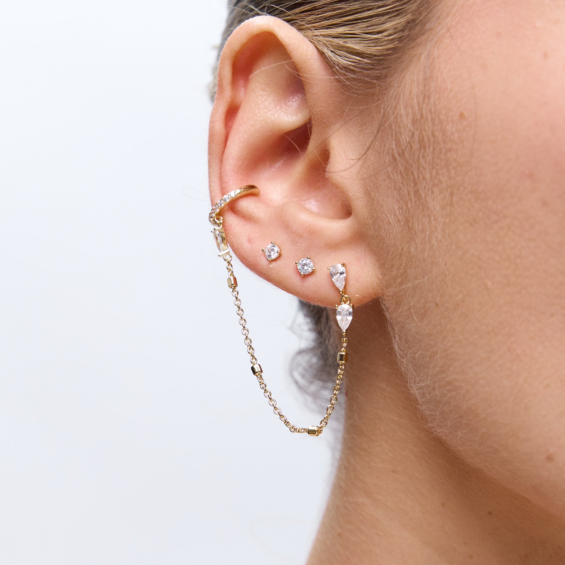 עגיל בודד משובץ זירקונים, עם שרשרת עדינה ומנצנצת שמחוברת לקאף מלא בשיבוצים, ללוק טרנדי ומלא גלאם. העגיל עשוי בעבודת יד ומצופה בזהב 14K.