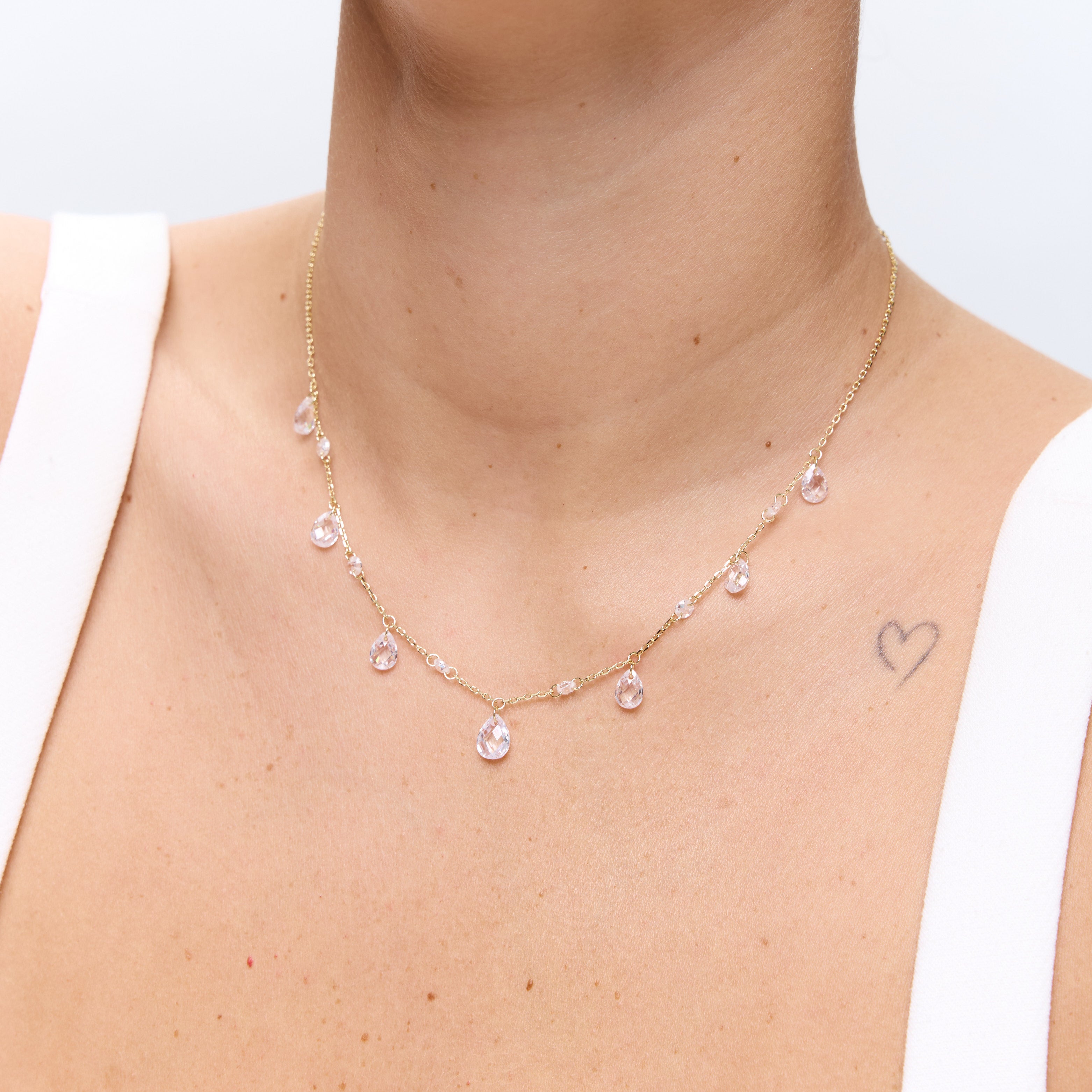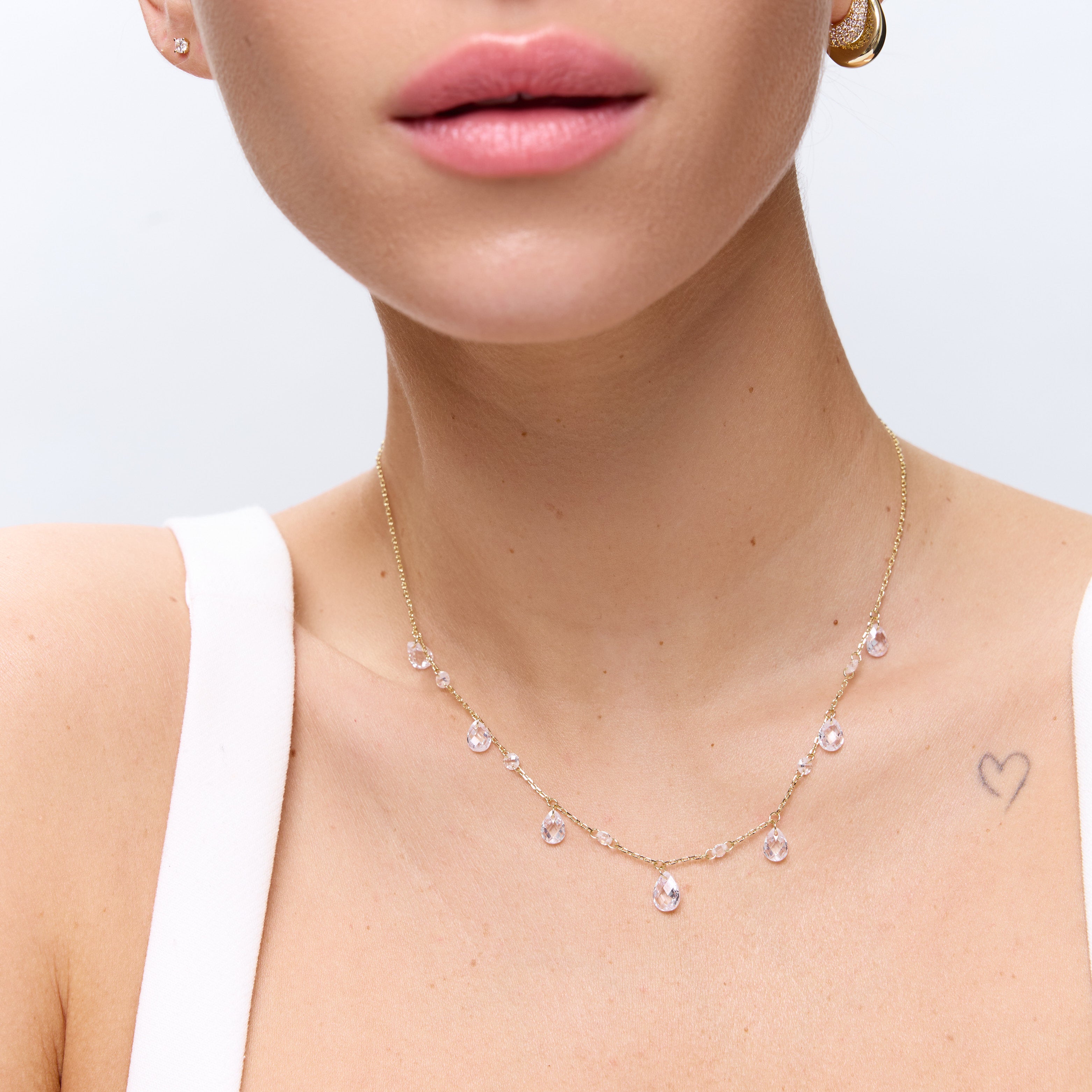 שרשרת עם תליוני זירקונים בצורת טיפה, בינהם משולבים זירקונים עגולים עדינים, בעיצוב מחמיא ונוצץ. השרשרת עשויה בעבודת יד ומצופה בזהב 14K.
