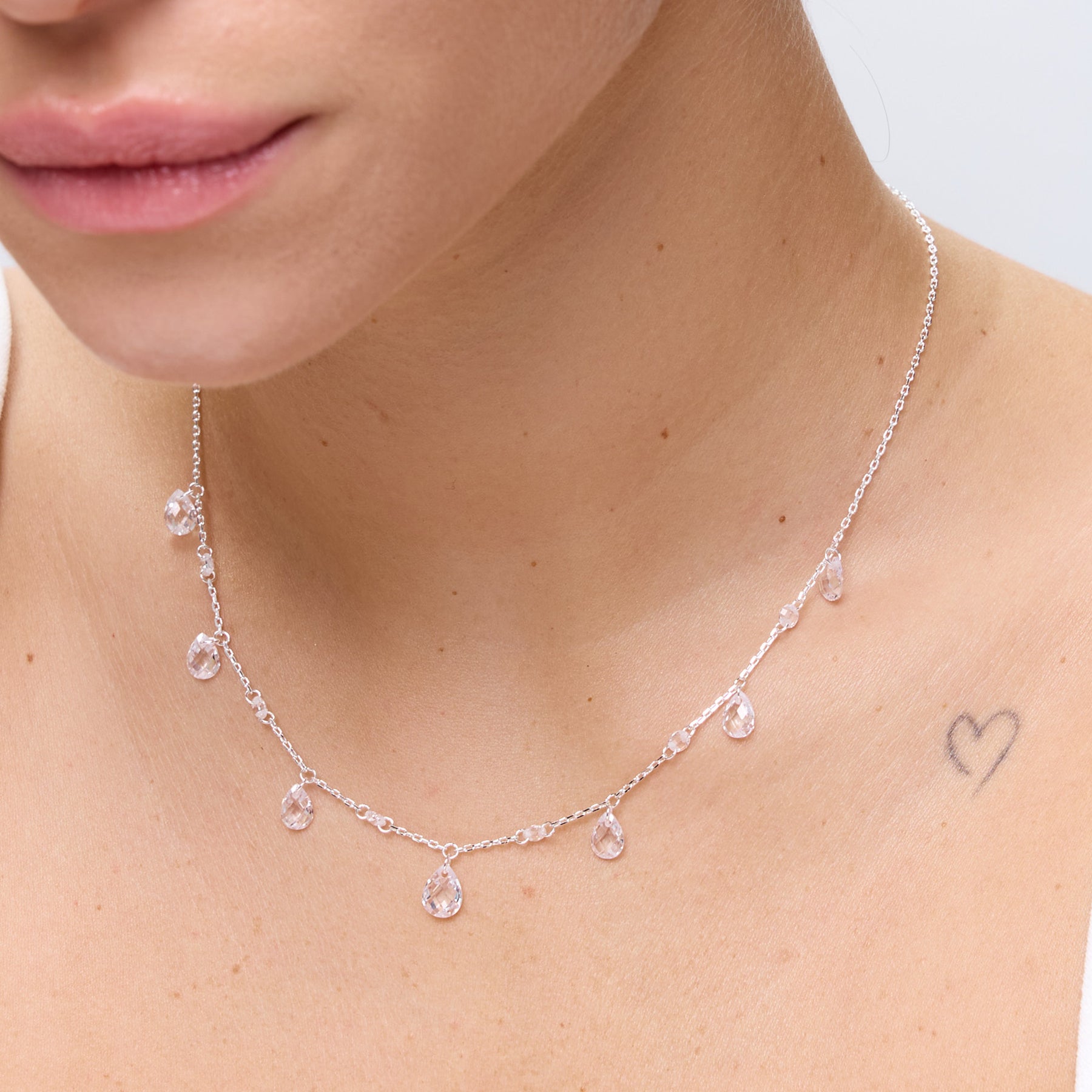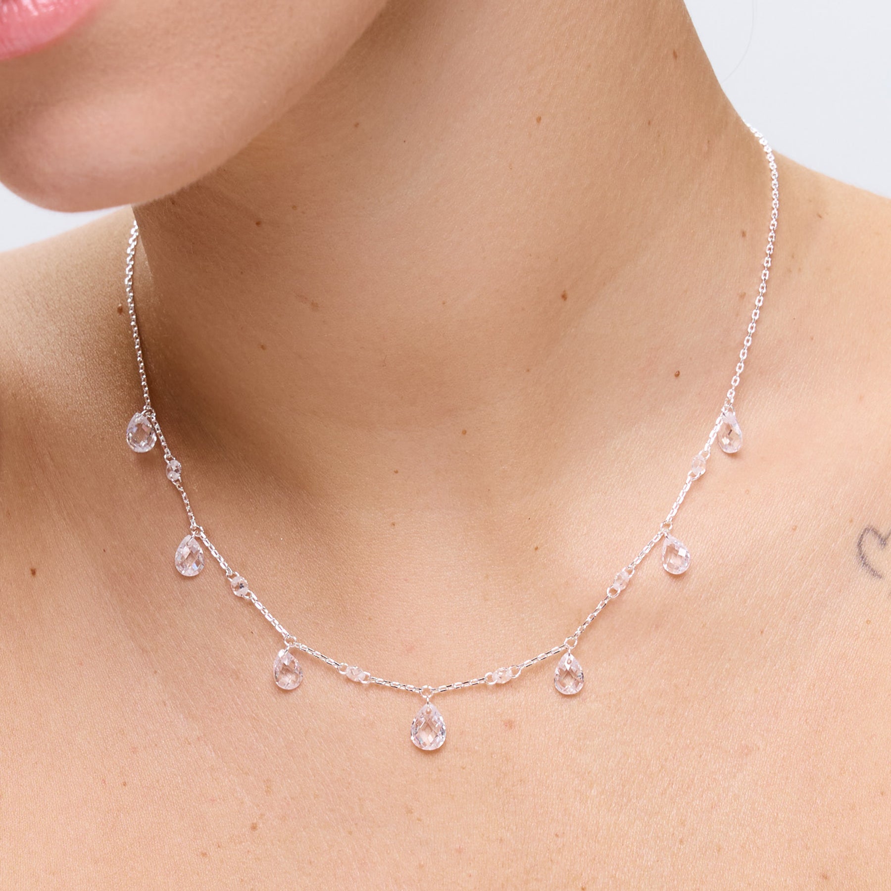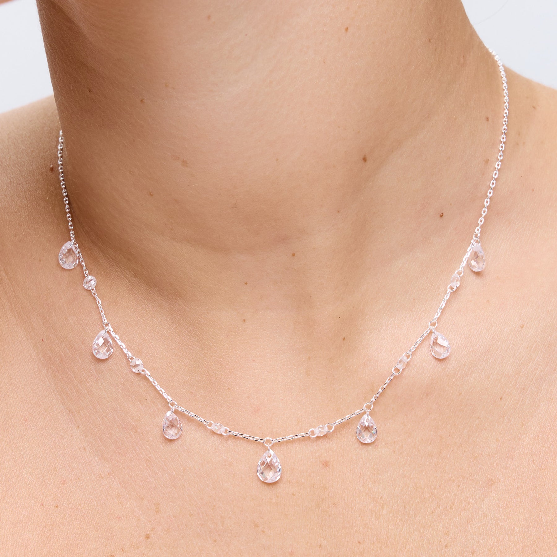 שרשרת עם תליוני זירקונים בצורת טיפה, בינהם משולבים זירקונים עגולים עדינים, בעיצוב מחמיא ונוצץ. השרשרת עשויה בעבודת יד ומצופה בכסף טהור.