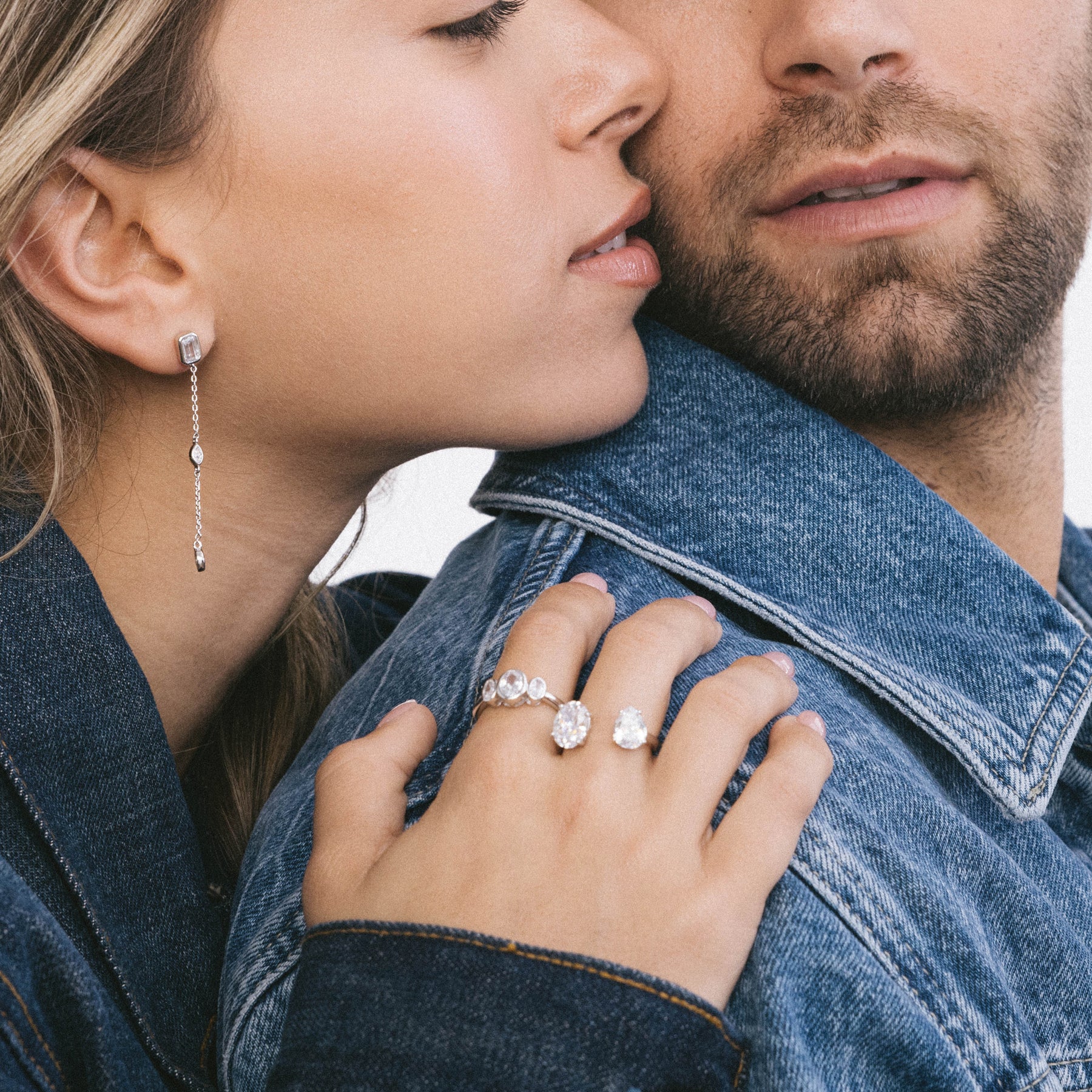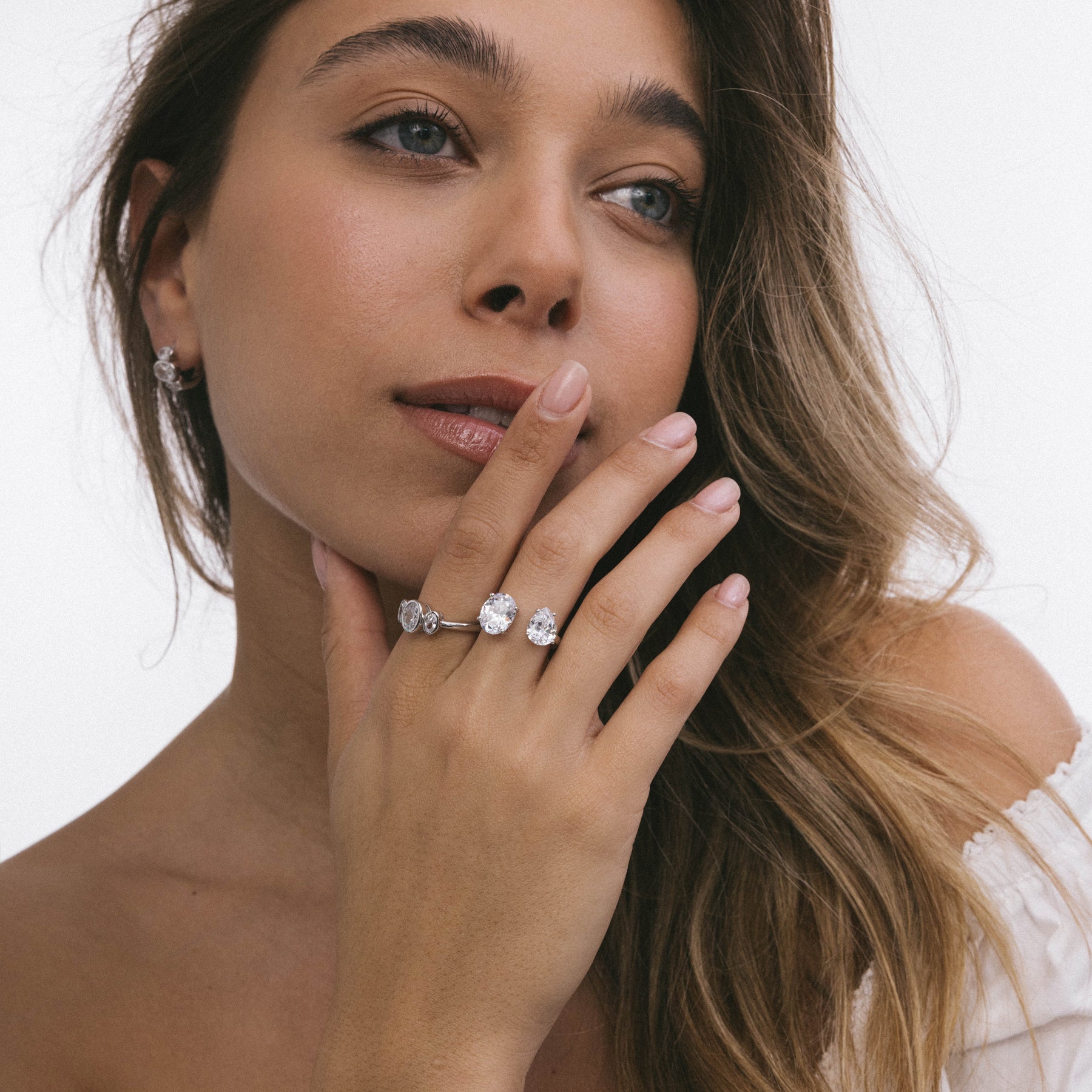טבעת עדינה ויוקרתית, עשויה שלוש אבני זירקון אובליות שמעניקות לה מראה קלאסי ואלגנטי במיוחד. הטבעת עשויה בעבודת יד והיא מצופה רודיום.