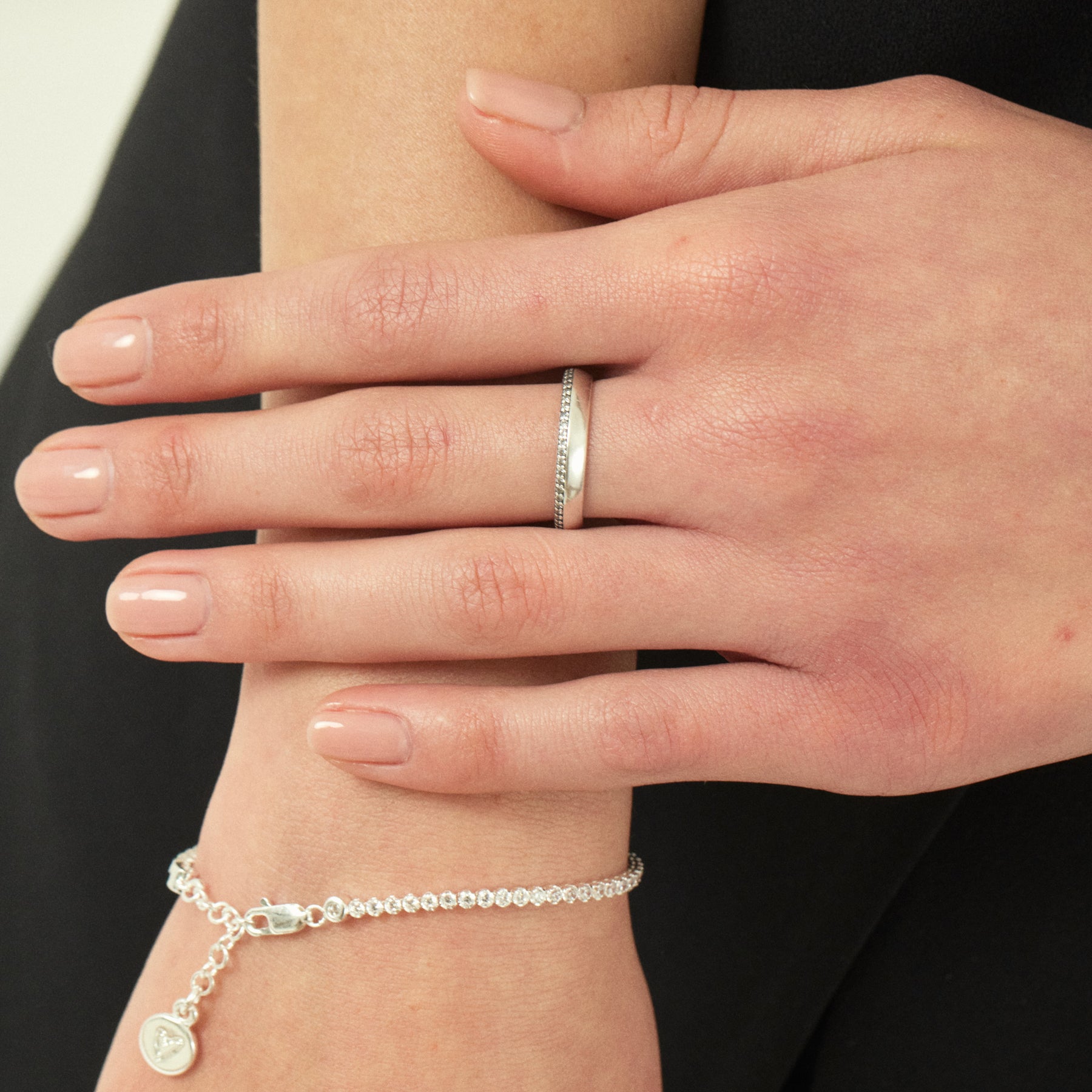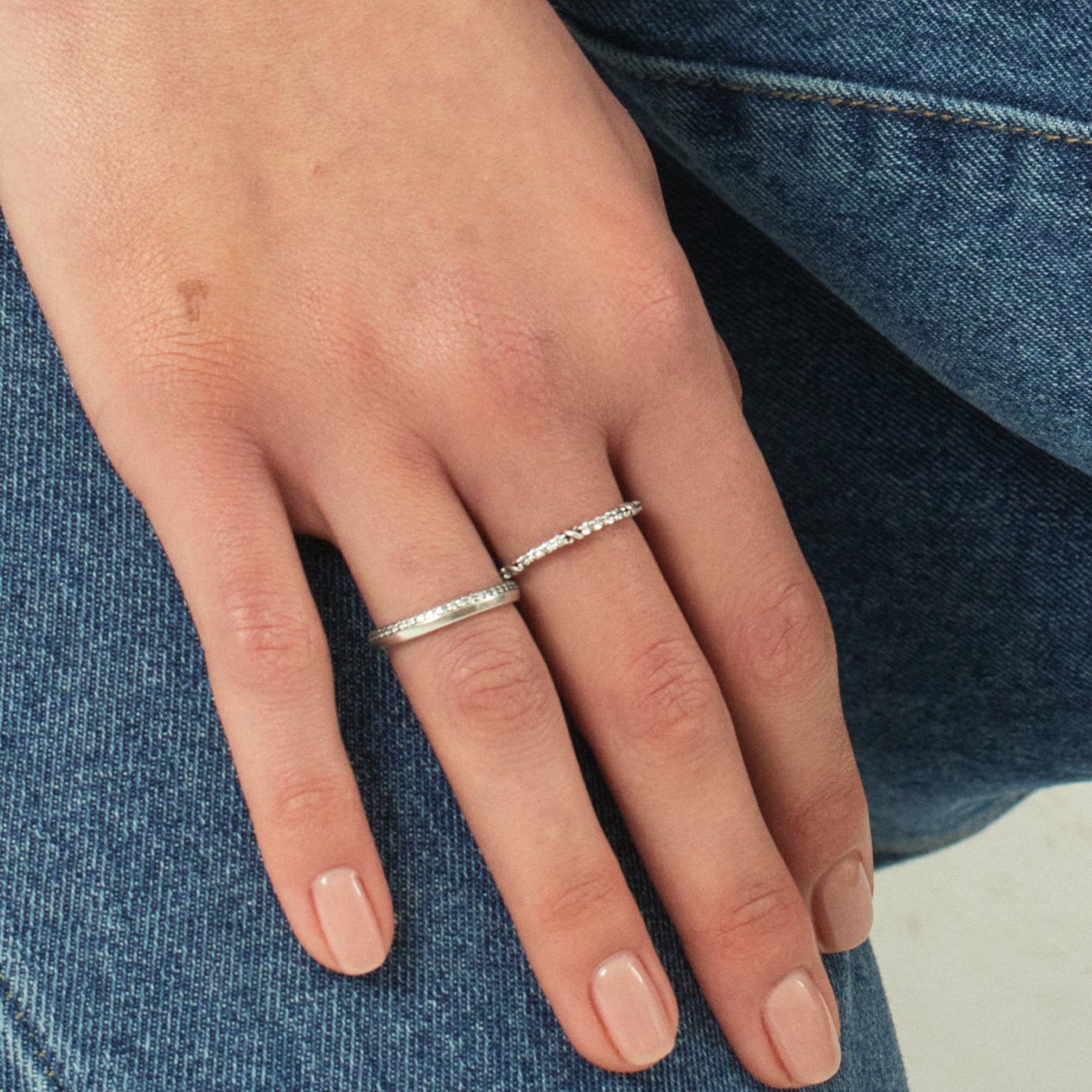 טבעת בעיצוב מדויק ואופנתי, משובצת קריסטלים זעירים ומצופה כסף טהור.