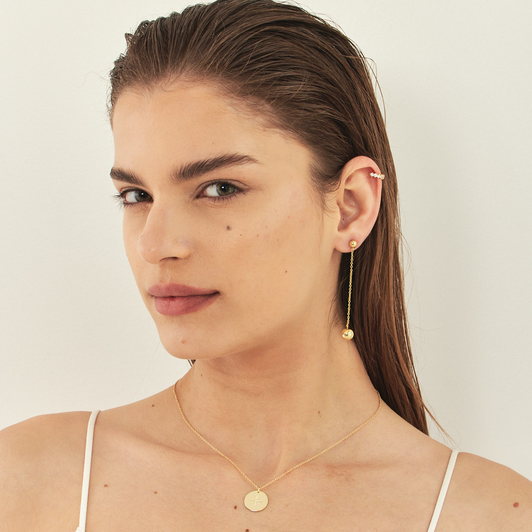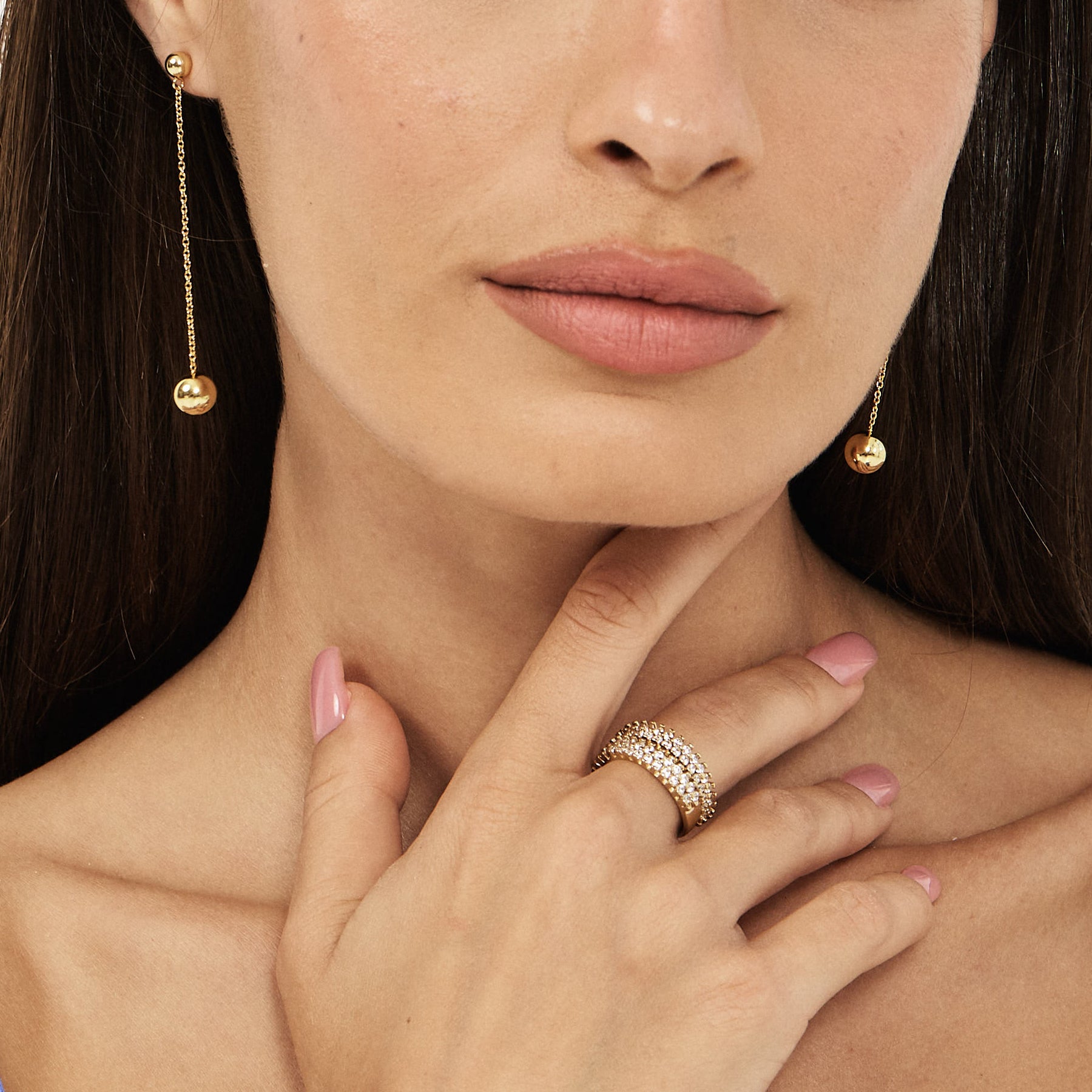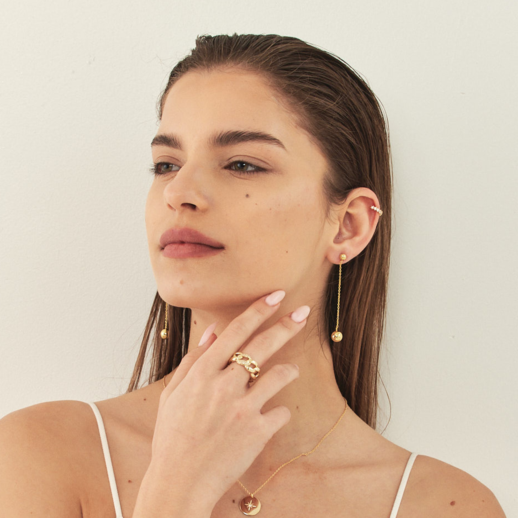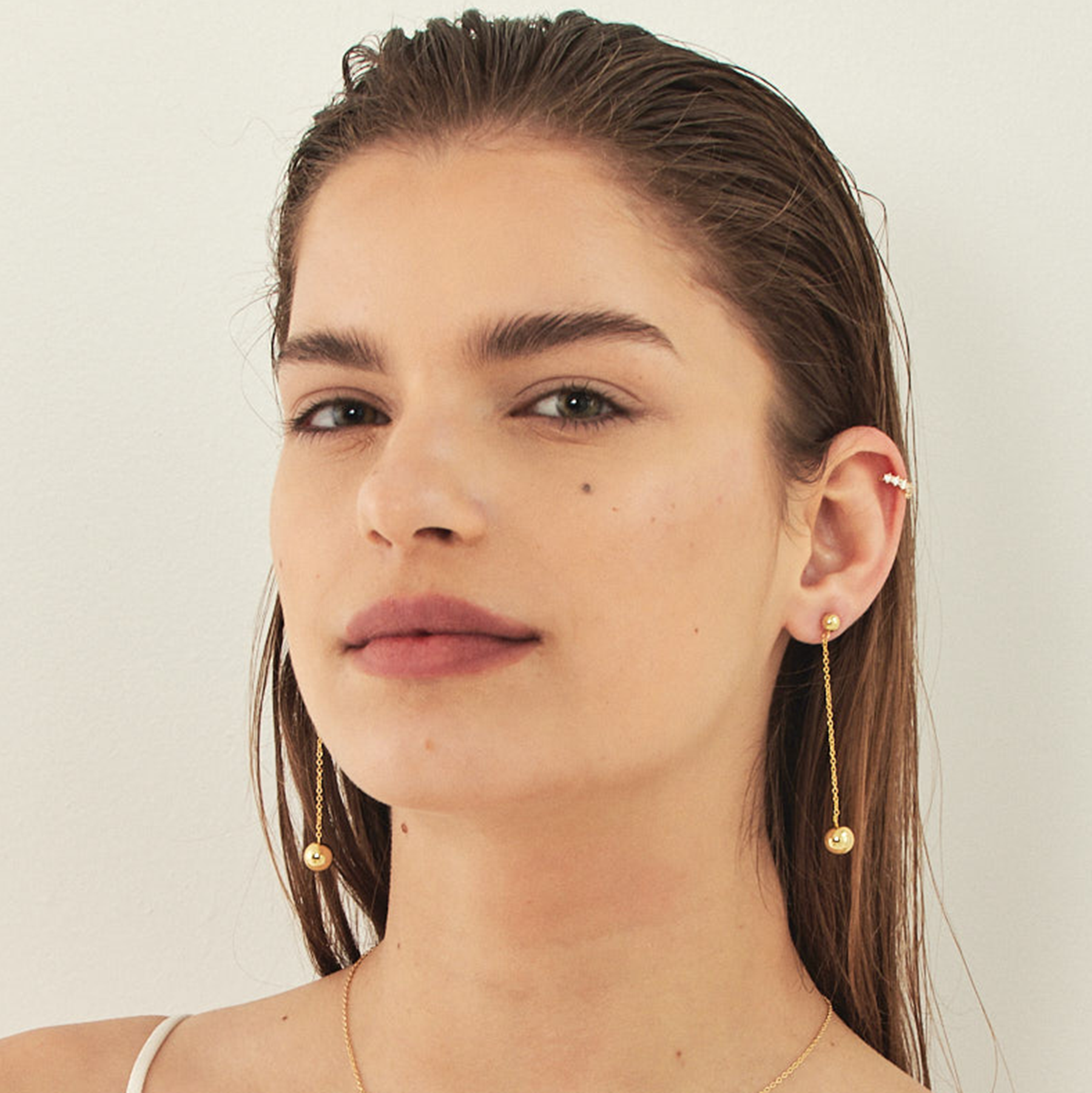 עגיל תלוי מלא שיק אופנתי בציפוי זהב K14 או כסף טהור. העגיל עשוי בעבודת יד משני כדורי פליז, שמחוברים ביניהם בשרשרת דקיקה, שמעניקה להם לוק טרנדי במיוחד. העגילים מהווים חלק מקולקציית Summer Candies - קולקציה שהיא אוסף מושלם של "ממתקי-תכשיטים",