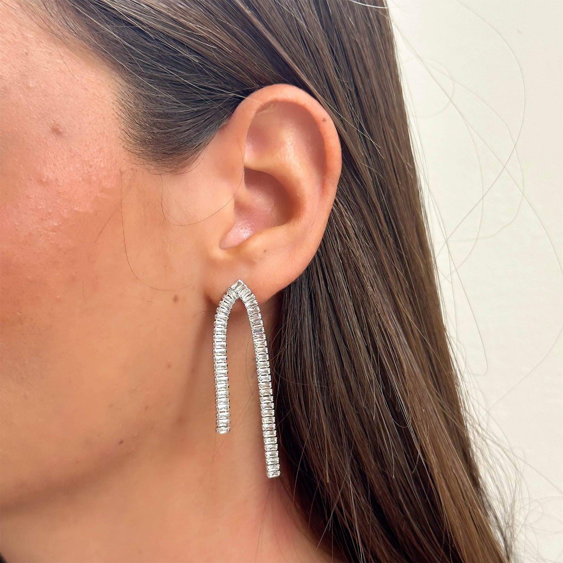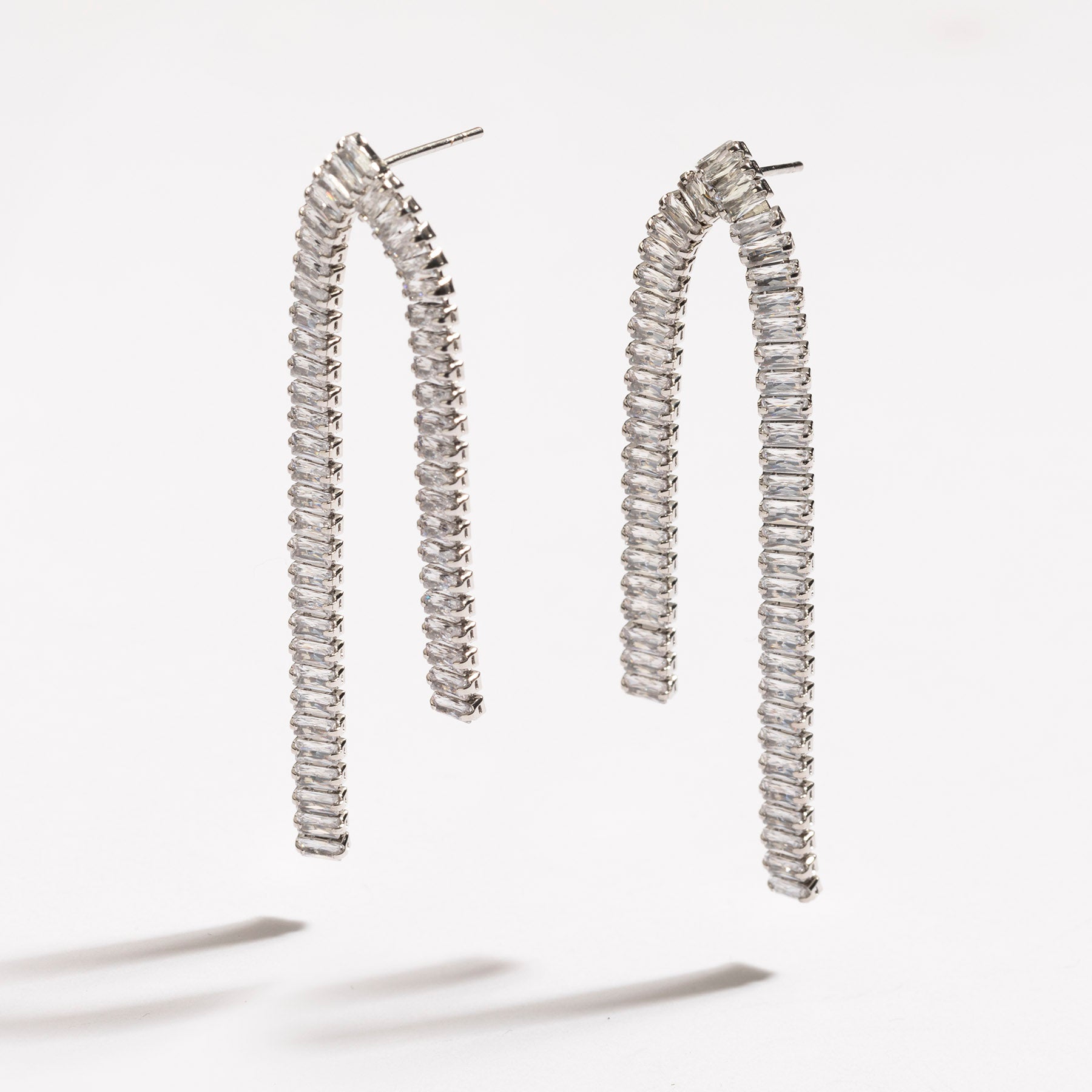 עגילי טניס אלגנטיים, תלויים בצורת V ומשובצים בזירקונים מלבניים מרהיבים. לעגילים עיצוב טיימלס יוקרתי ומלא סטייל והם עשויים בעבודת יד ומצופים ברודיום.