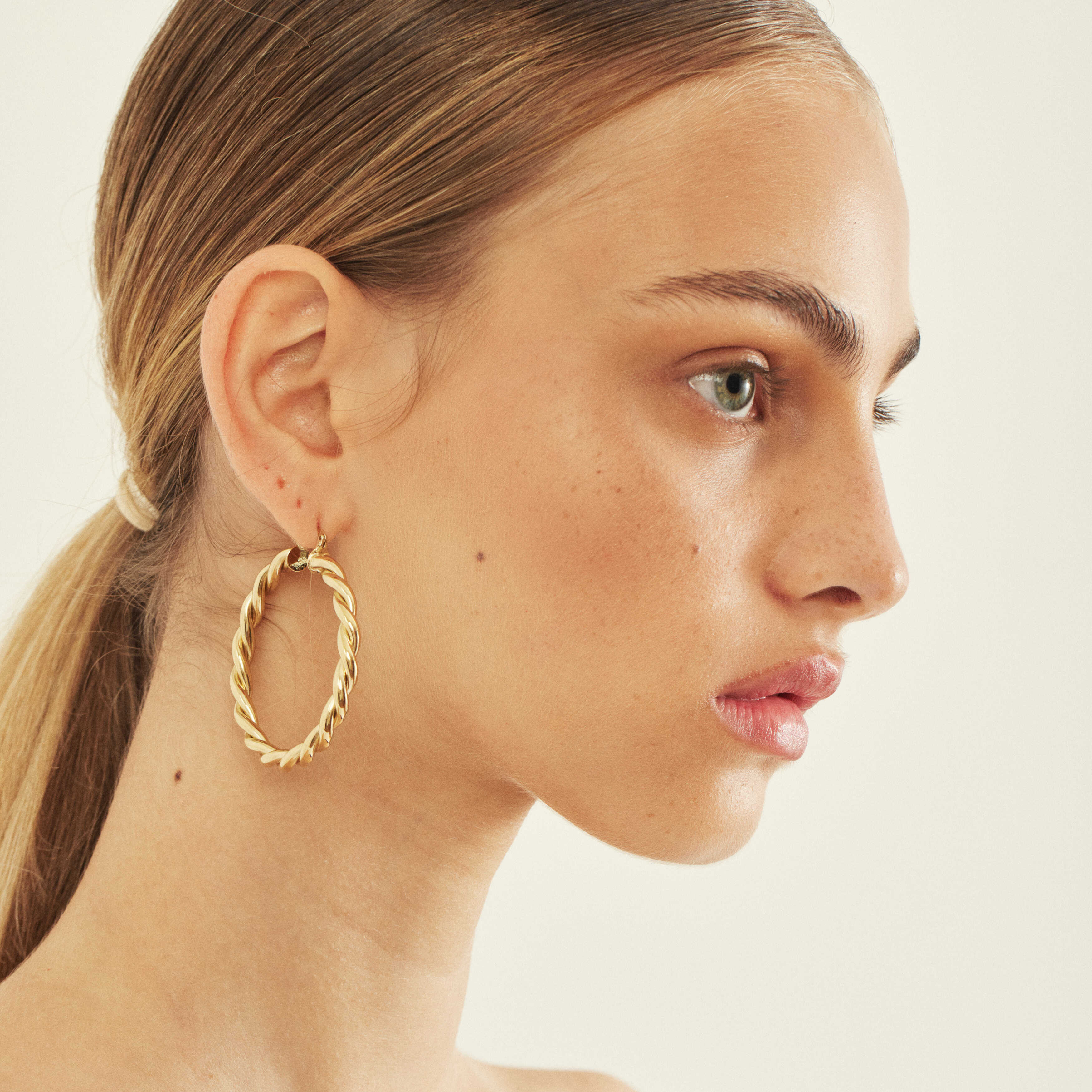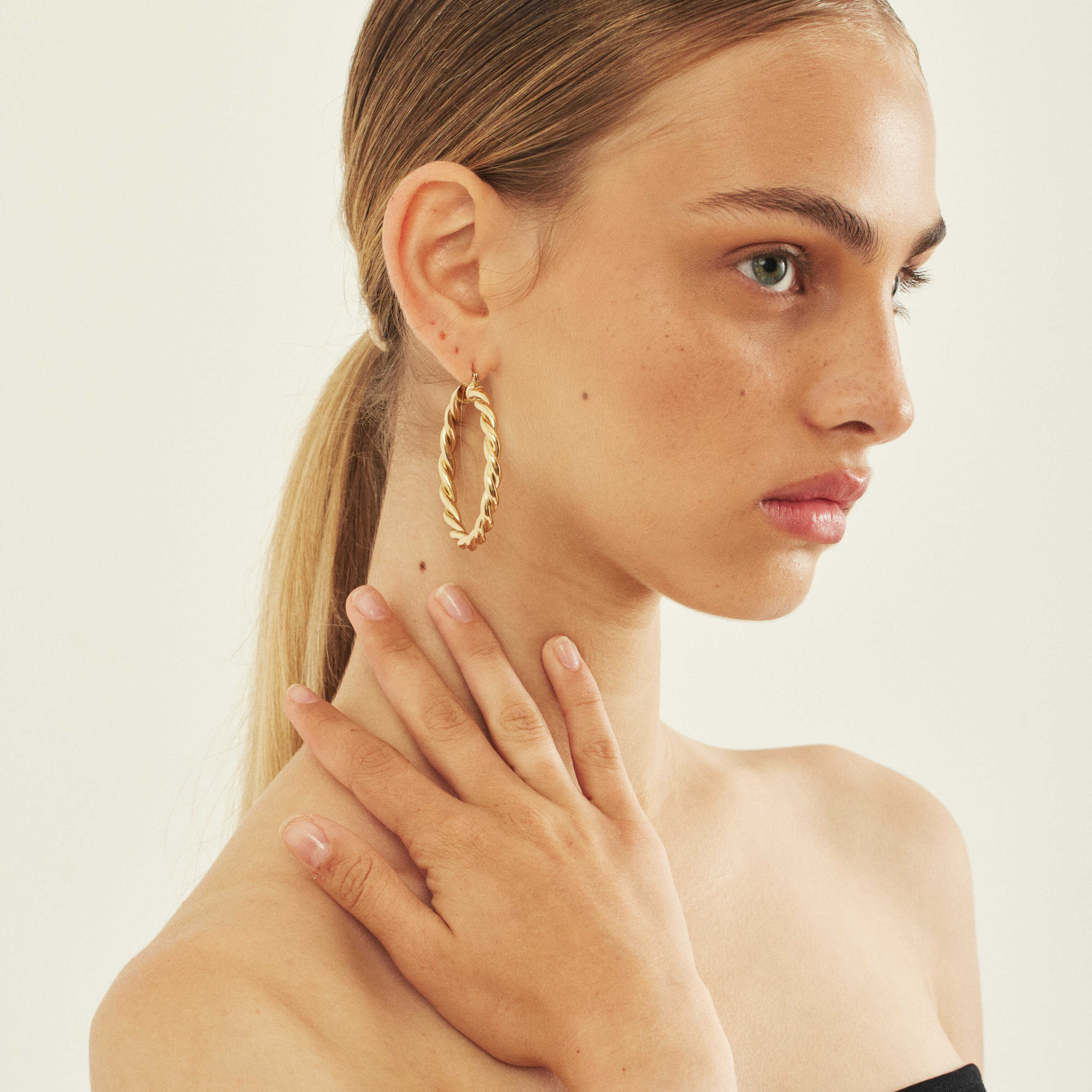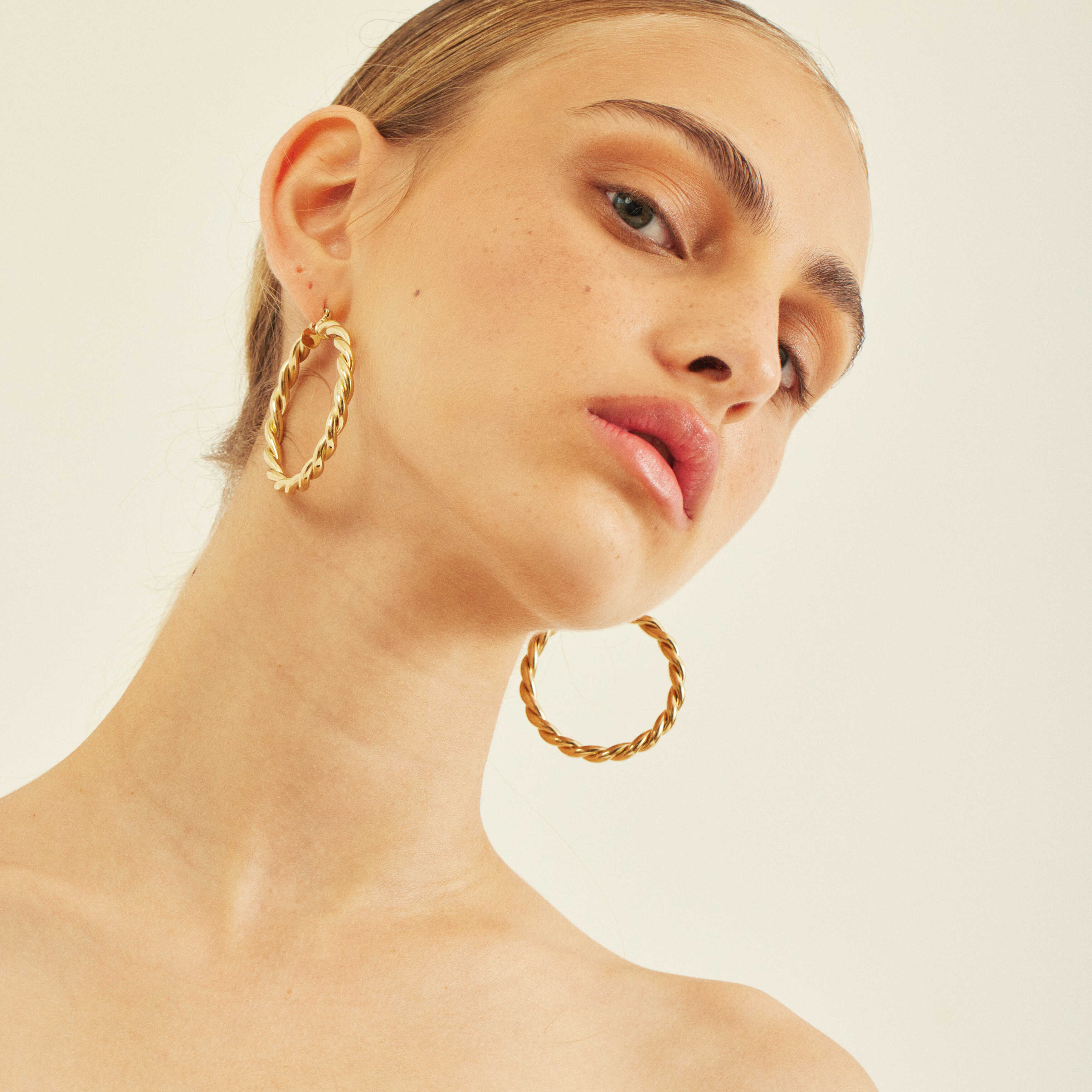 עגילי חישוק נועזים ואדג'ים בדוגמת חבל, מצופים זהב 24K.