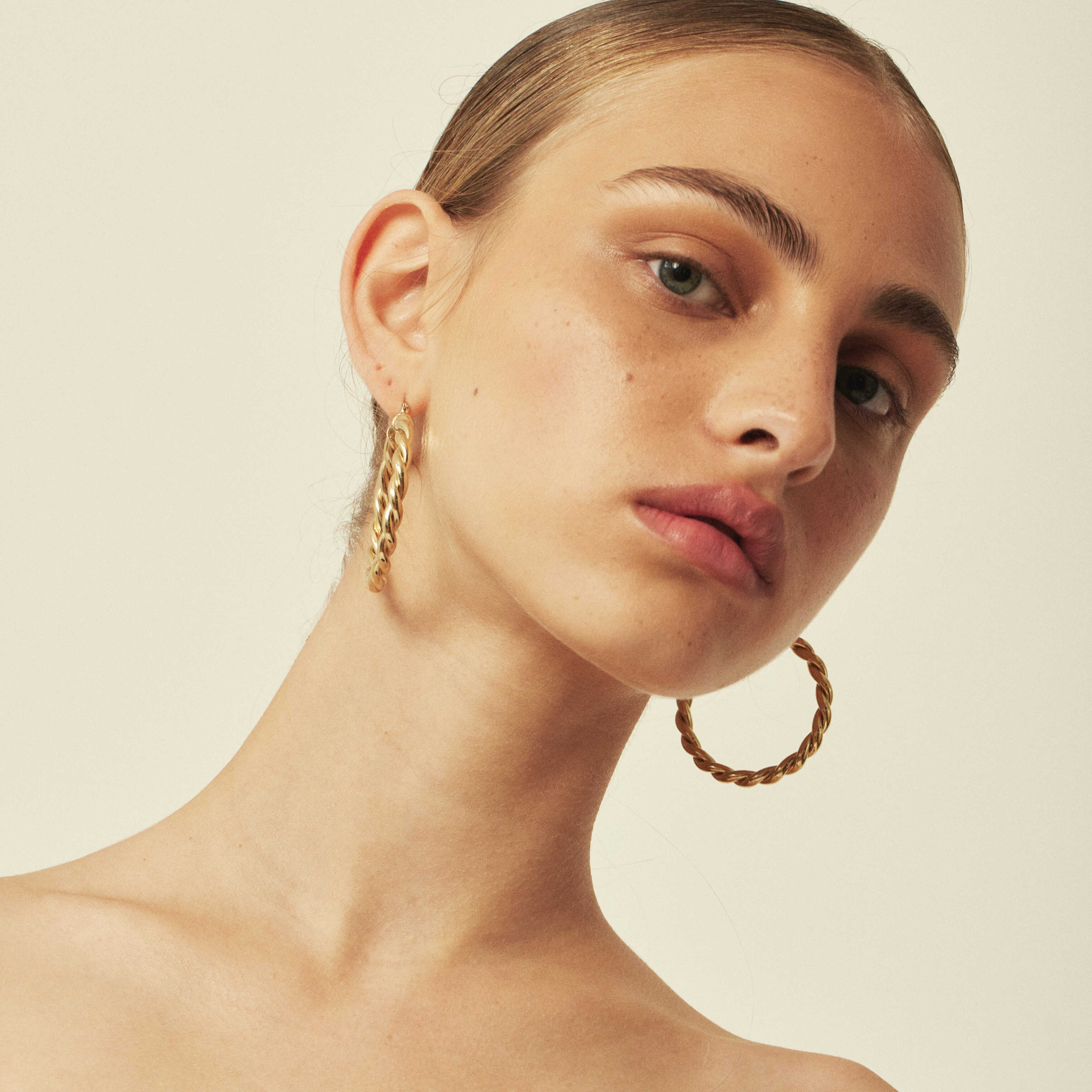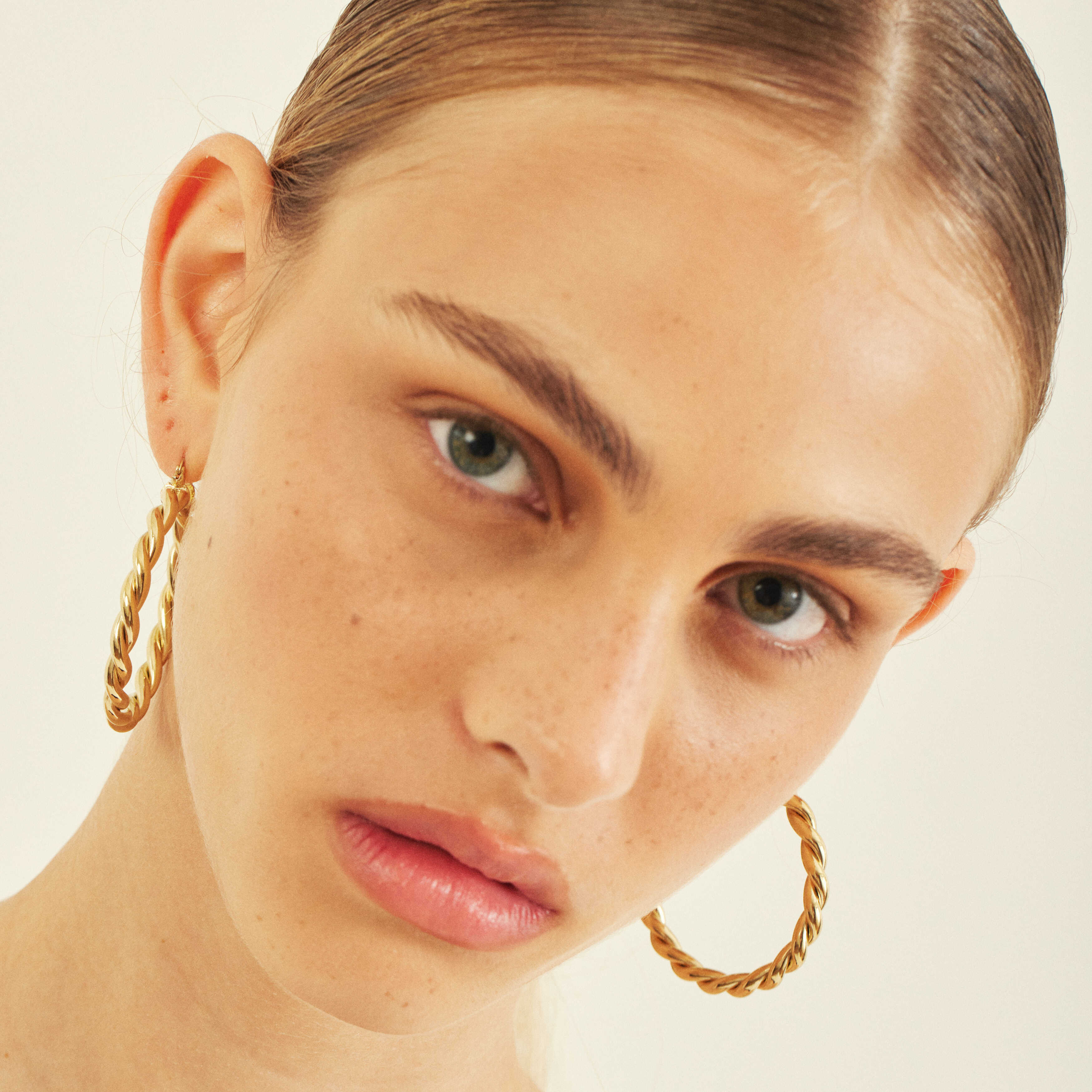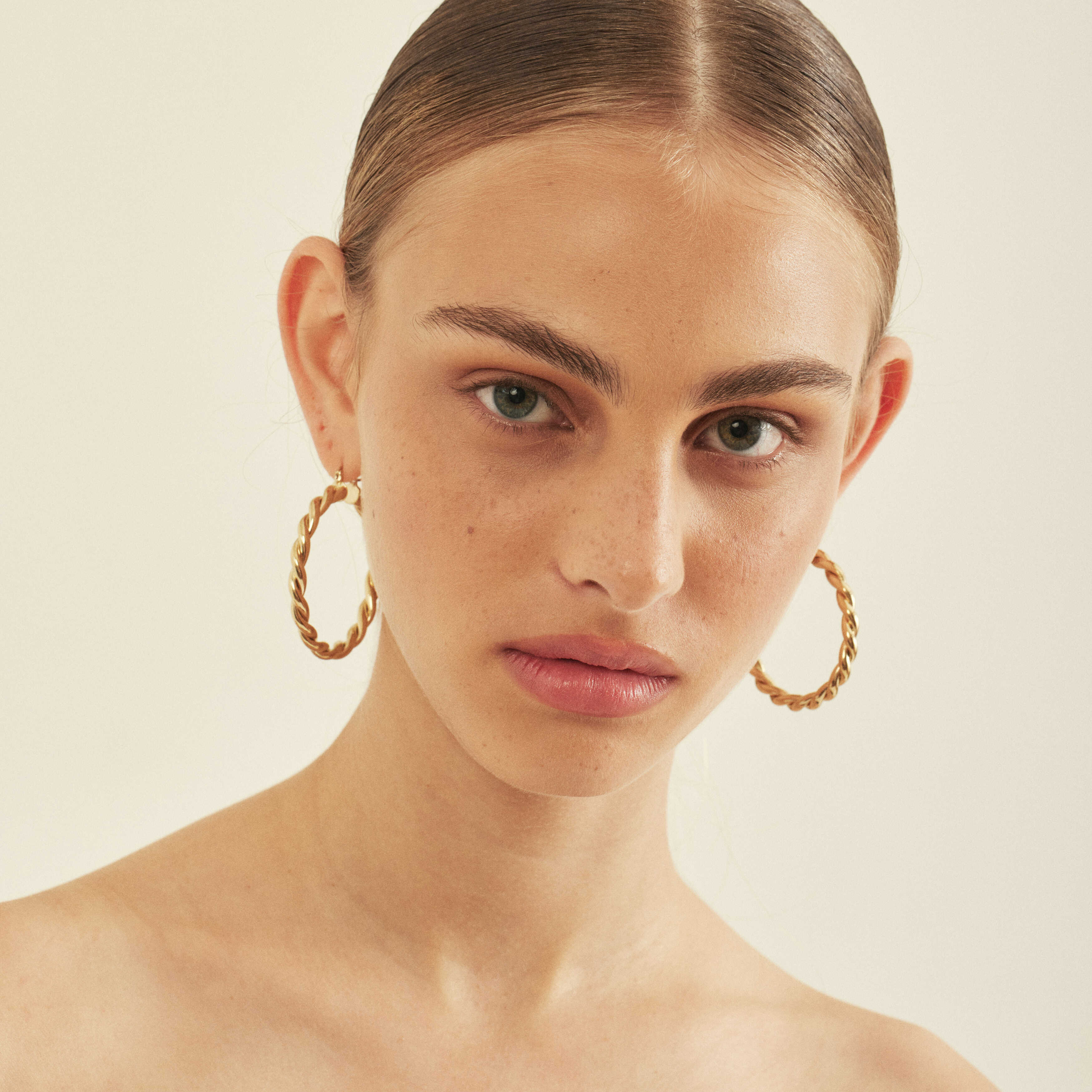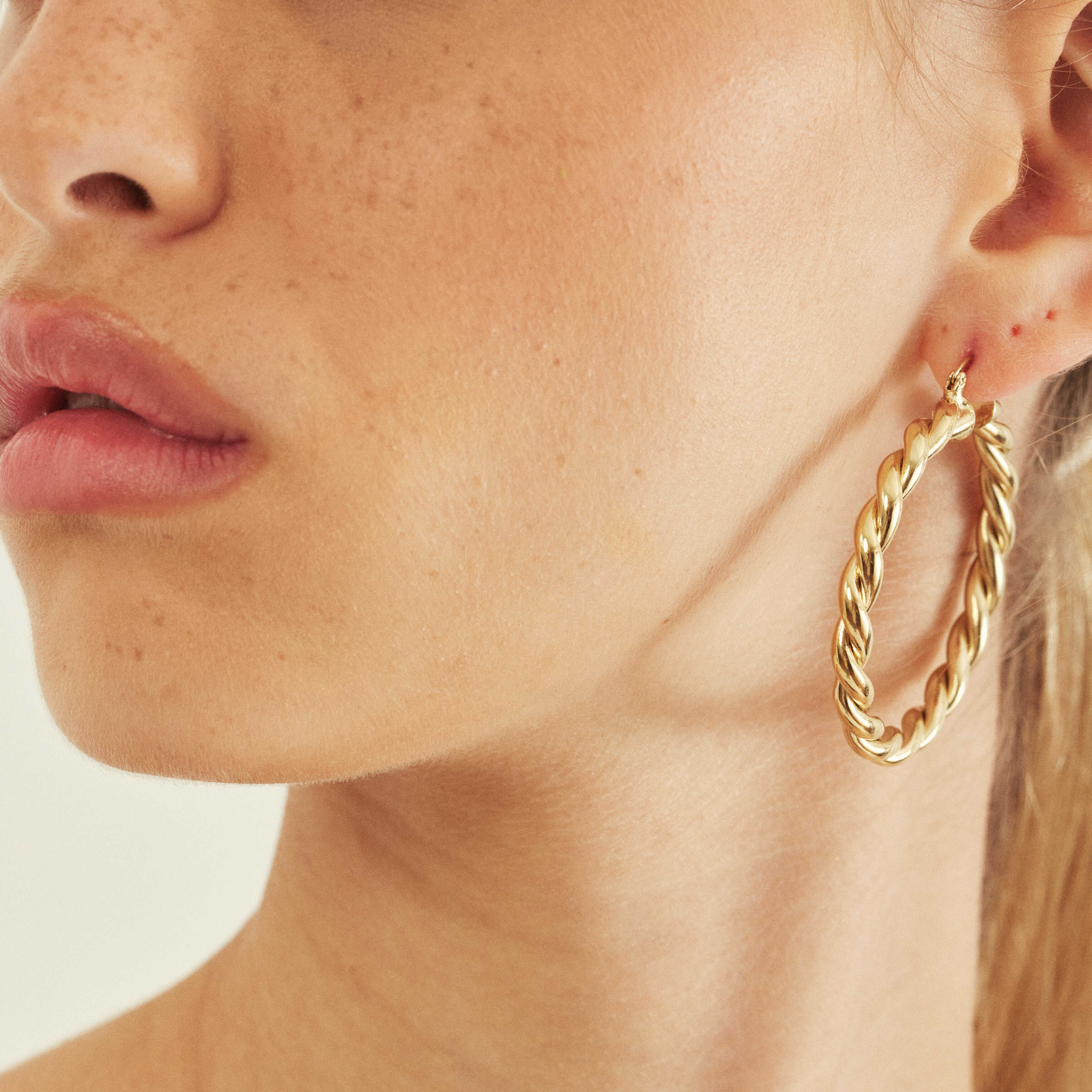 עגילי חישוק נועזים ואדג'ים בדוגמת חבל, מצופים זהב 24K.