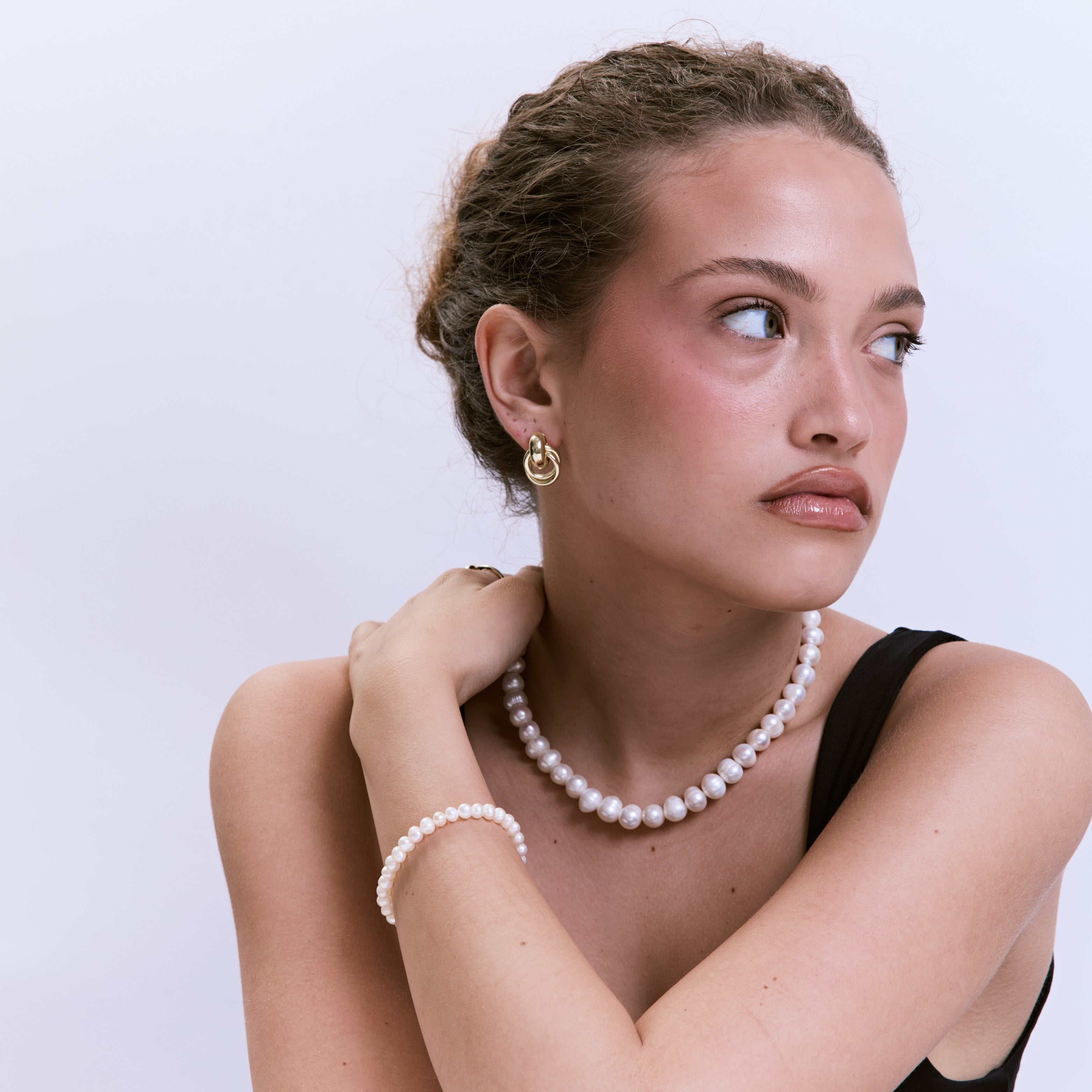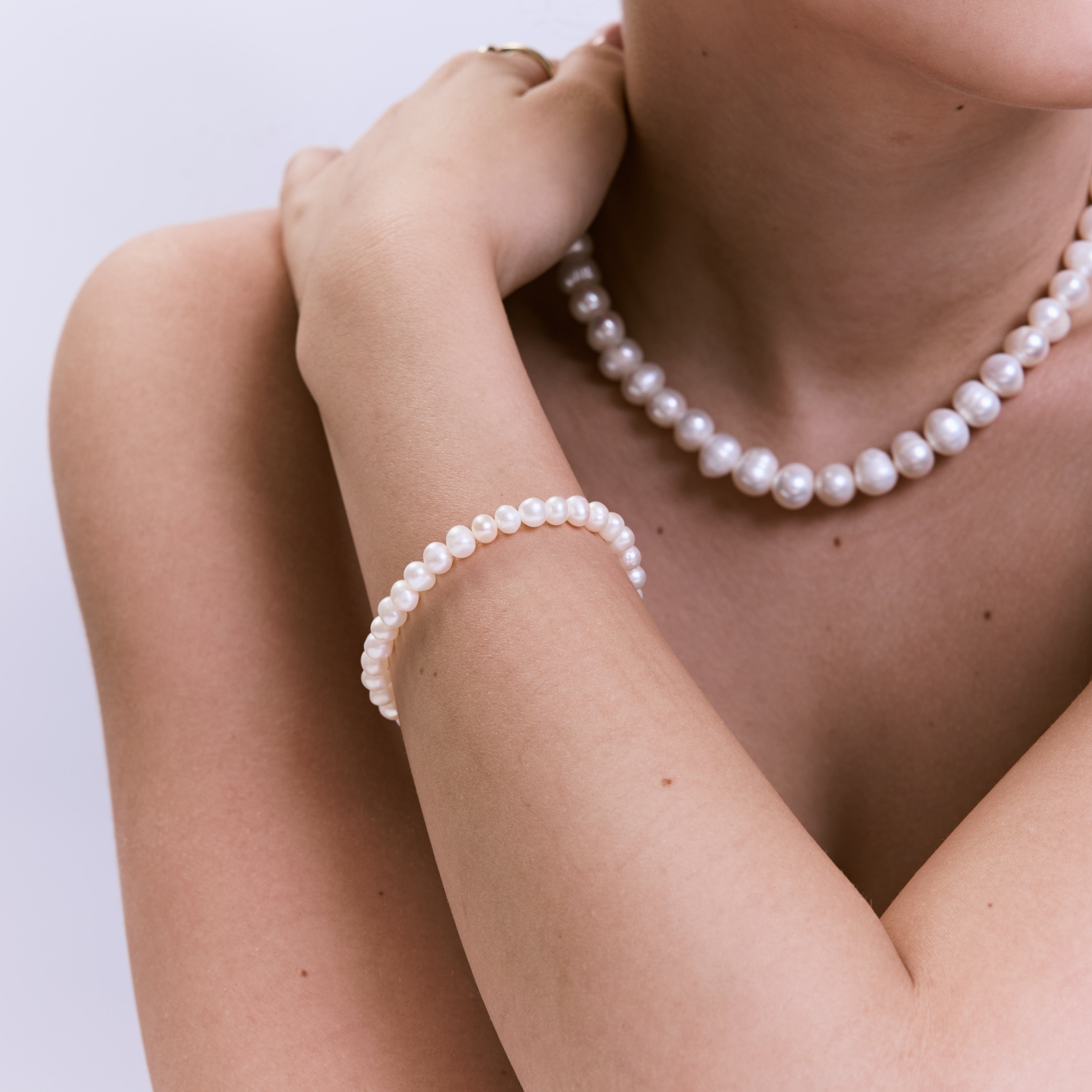 צמיד פנינים קלאסית עם פנינים עגלגלות טבעיות, שישתלב מושלם בלוקים שלך. הצמיד עשוי בעבודת יד ומצופה בזהב 14K.