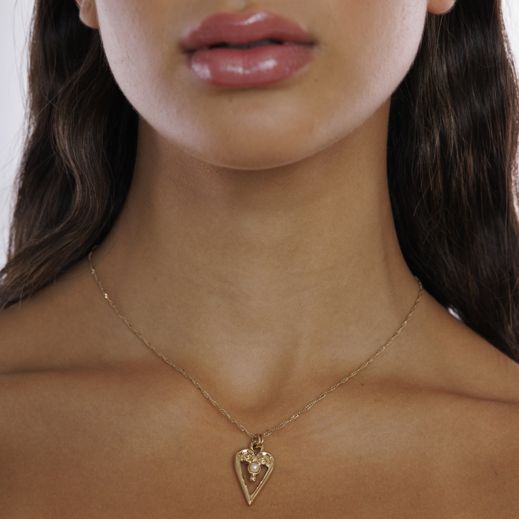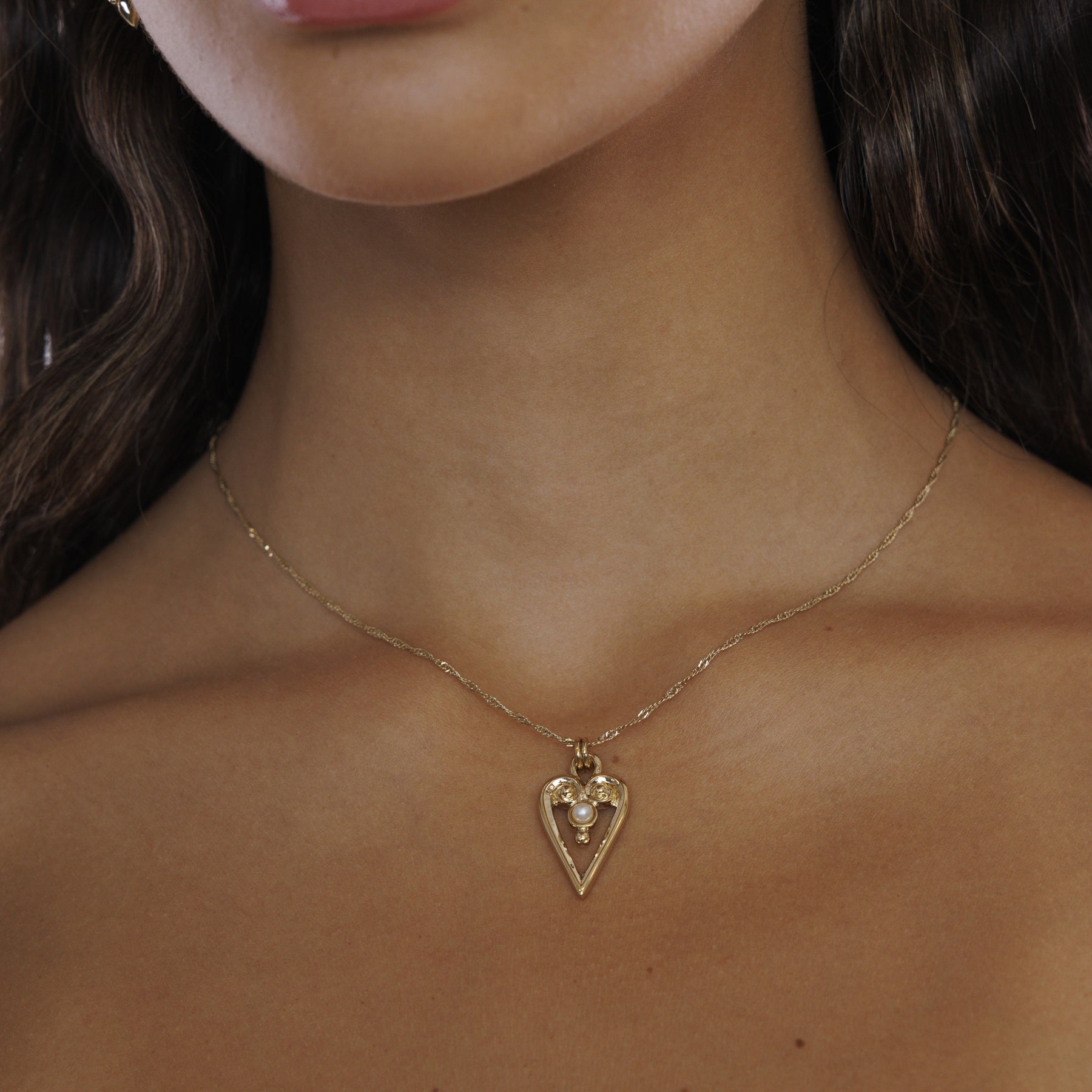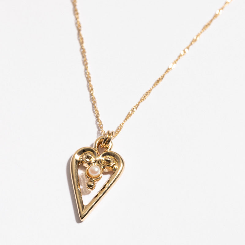 שרשרת לב מעוטר בסגנון וינטאג', משובצת בפנינה. בהתאם לטרנד הלבבות הלוהט, השרשרת תיתן לך לוק רומנטי ומעודכן. השרשרת מצופה בזהב 24K והיא חלק מקולקציית Nostalgia שמבוססת על דגמים ישנים ואהובים, שעוצבו אצלנו בעבודת יד בשנות ה-70, ה- 80 וה-90, מעניקה להם חיים חדשים ומחזירה אותם לקדמת הבמה.